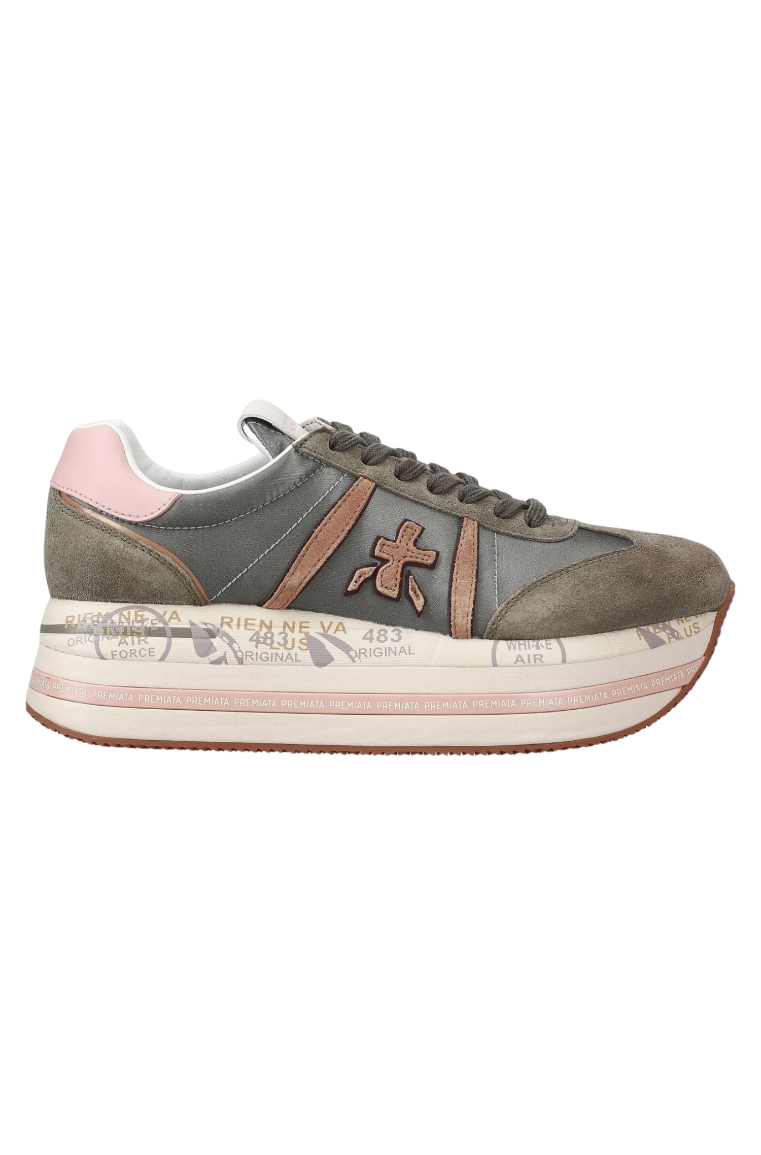 Premiata Beth sneakers are designed for women who love platform shoes with a strong personality and effortless styling. The upper combines soft suede and technical fabric in a fresh sage green tone with beige accents, creating a modern contrast that elevates both simple and more dressed-up looks.?