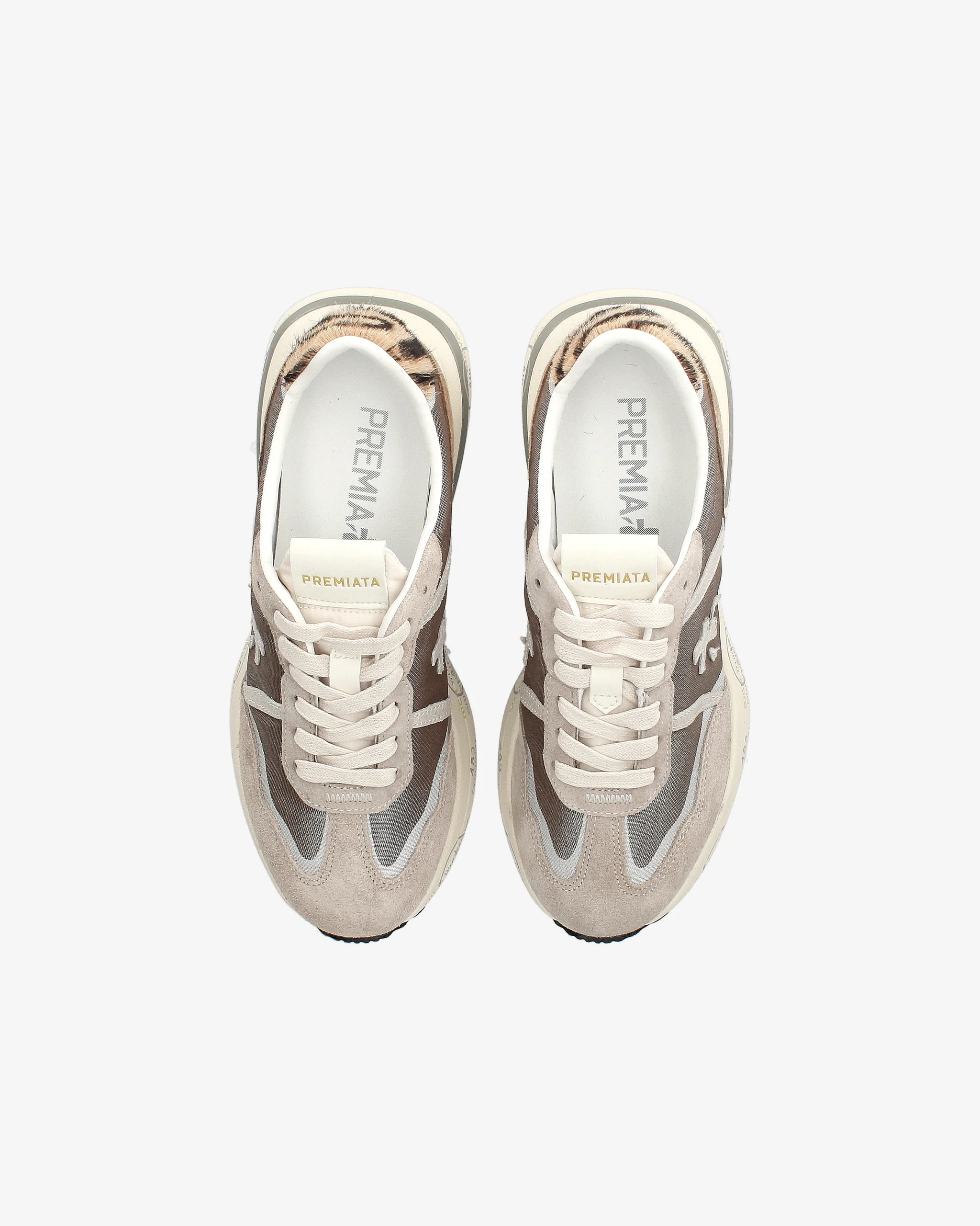 The Premiata Cassie 7675 sneakers represent one of the most contemporary expressions of the collection. The calf leather and technical fabric upper provides a dynamic and versatile look, while the hairy calf details add texture and depth. Clean and refined, this design stands out for its modern aesthetic and premium materials.