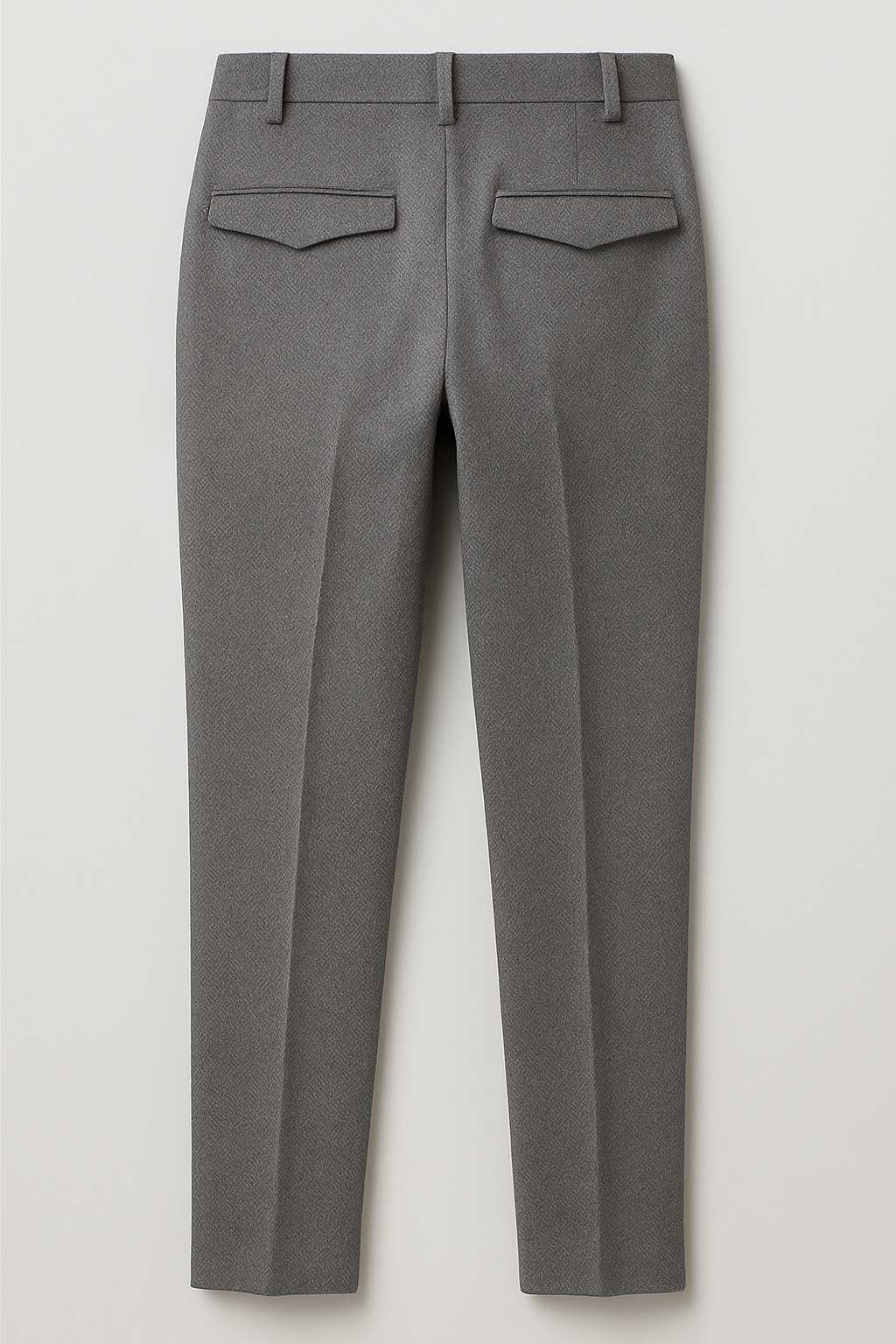 The tailored construction shapes the silhouette while maintaining excellent wearability. The design includes slanted side pockets, belt loops, and refined flap back pockets for an elegant, functional finish. The tapered leg adds a contemporary touch, making the trousers ideal for both formal outfits and elevated casual looks.