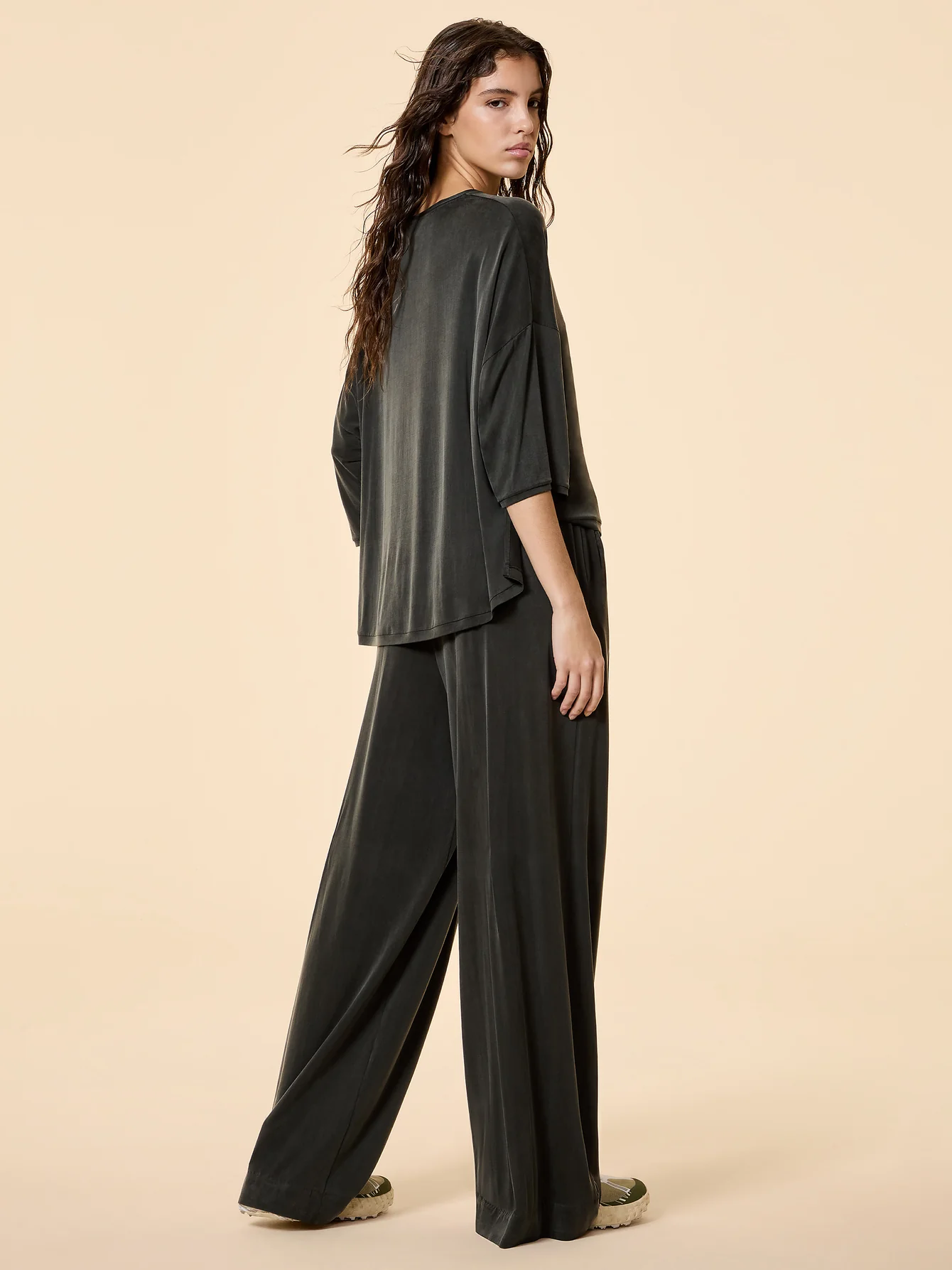 The clean crew neckline completes the design with balance, maintaining a refined and essential aesthetic. The true highlight of the garment is the cupro fabric: fresh, lightweight and exceptionally soft, with a subtle sheen reminiscent of silk.