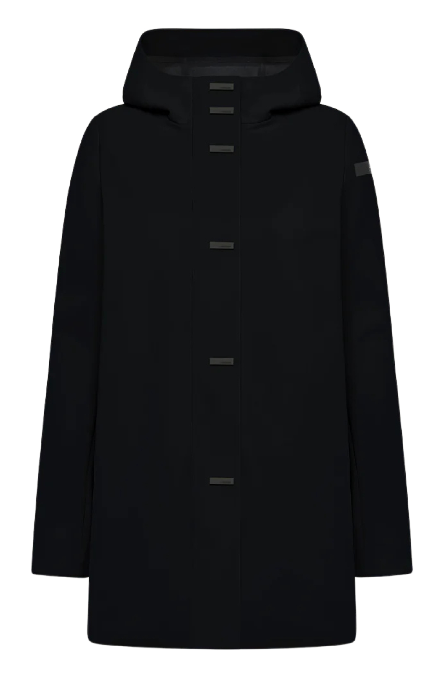An enveloping hood and high stand-up collar frame a discreet, modern femininity, naturally enhancing the silhouette without adding bulk. The waterproof, lightweight and breathable membrane fabric ensures protection from rain and wind, while the exclusive stretch SURFLEX® super-matte outer shell provides a smooth, soft handfeel consistent with the brands techno-tailoring attitude.
