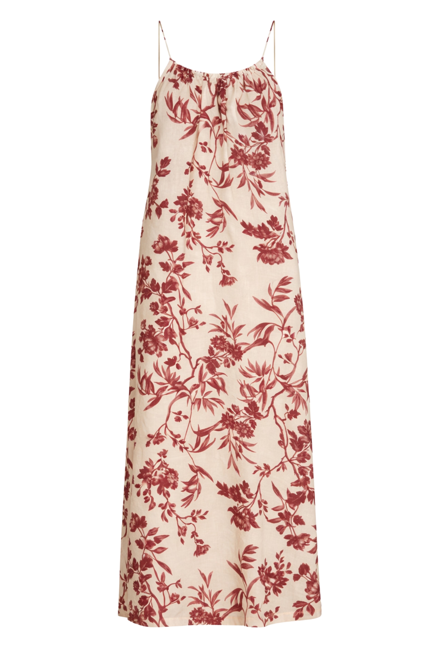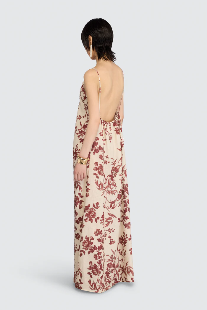 Thin straps and a gathered neckline create soft draping around the bust, highlighting the décolleté with understated elegance. At the back, a wide open-back design adds a refined, sensual accent that is balanced by the full length of the dress.