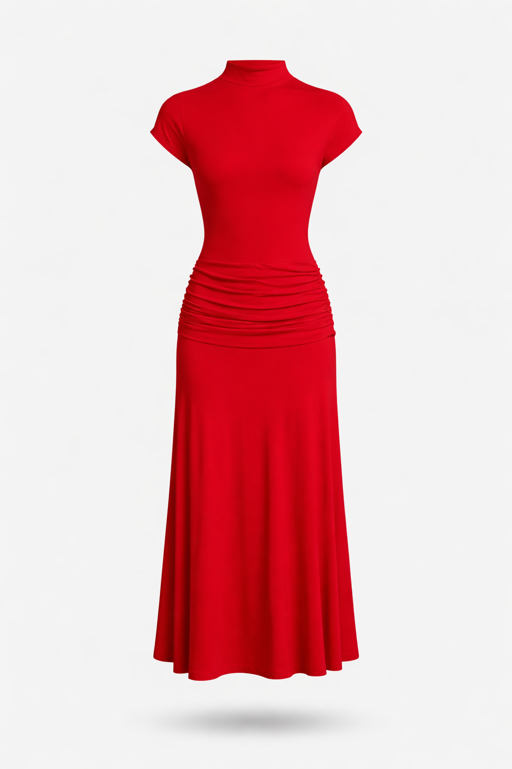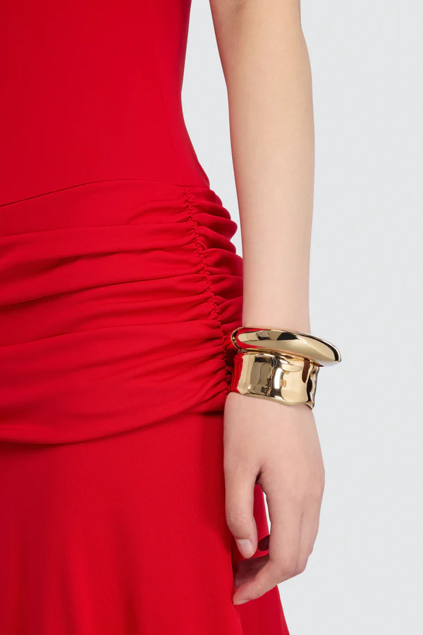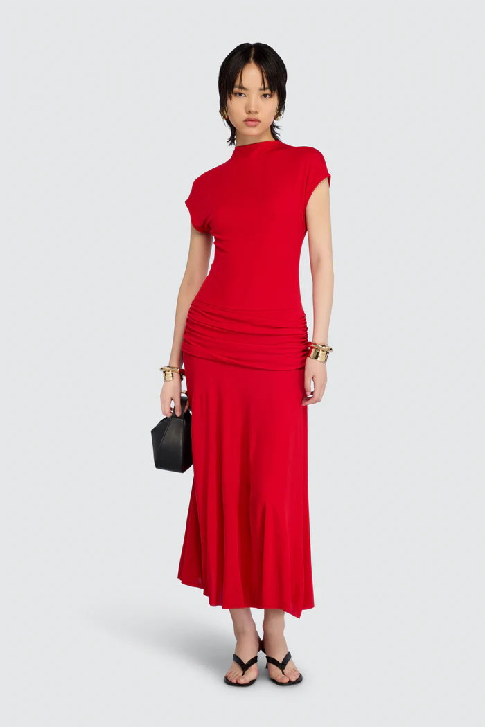 Cut to a regular fit, the Gwen dress suits a range of body shapes, while side ruching adds gentle draping along the hips, subtly highlighting the waist and creating a balanced silhouette. The wide midi-length skirt moves gracefully with each step, making this style easy to pair with sandals, pumps or ankle boots depending on the occasion.