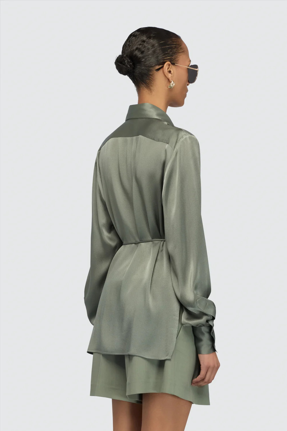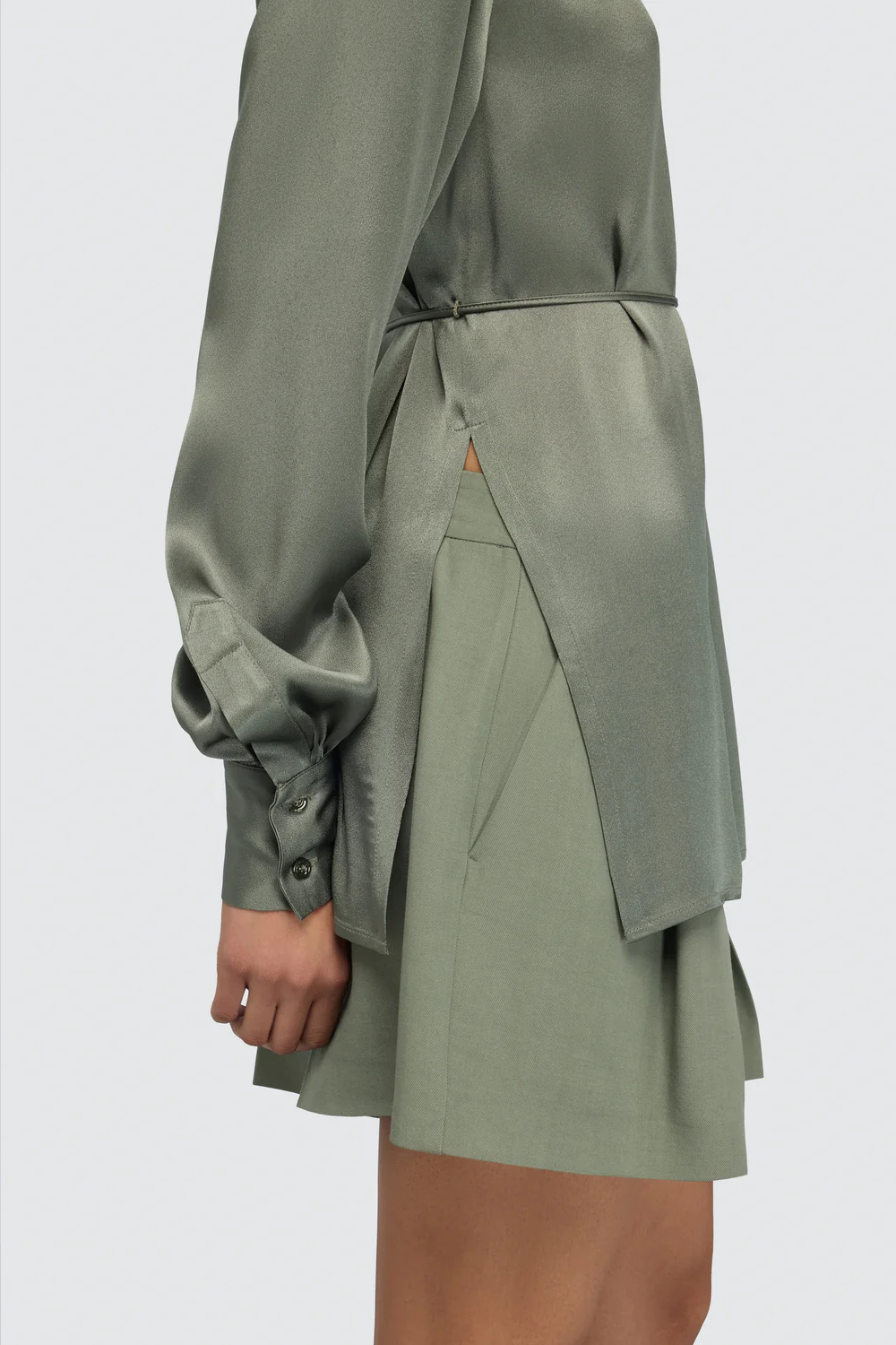 The design features a full front button placket and side openings/slits that lighten the volume and add movement to the silhouette when the shirt is worn over trousers or skirts. Its hip-length cut and clean lines make it easy to wear tucked in or left out, adapting seamlessly to both more formal and relaxed chic looks.
