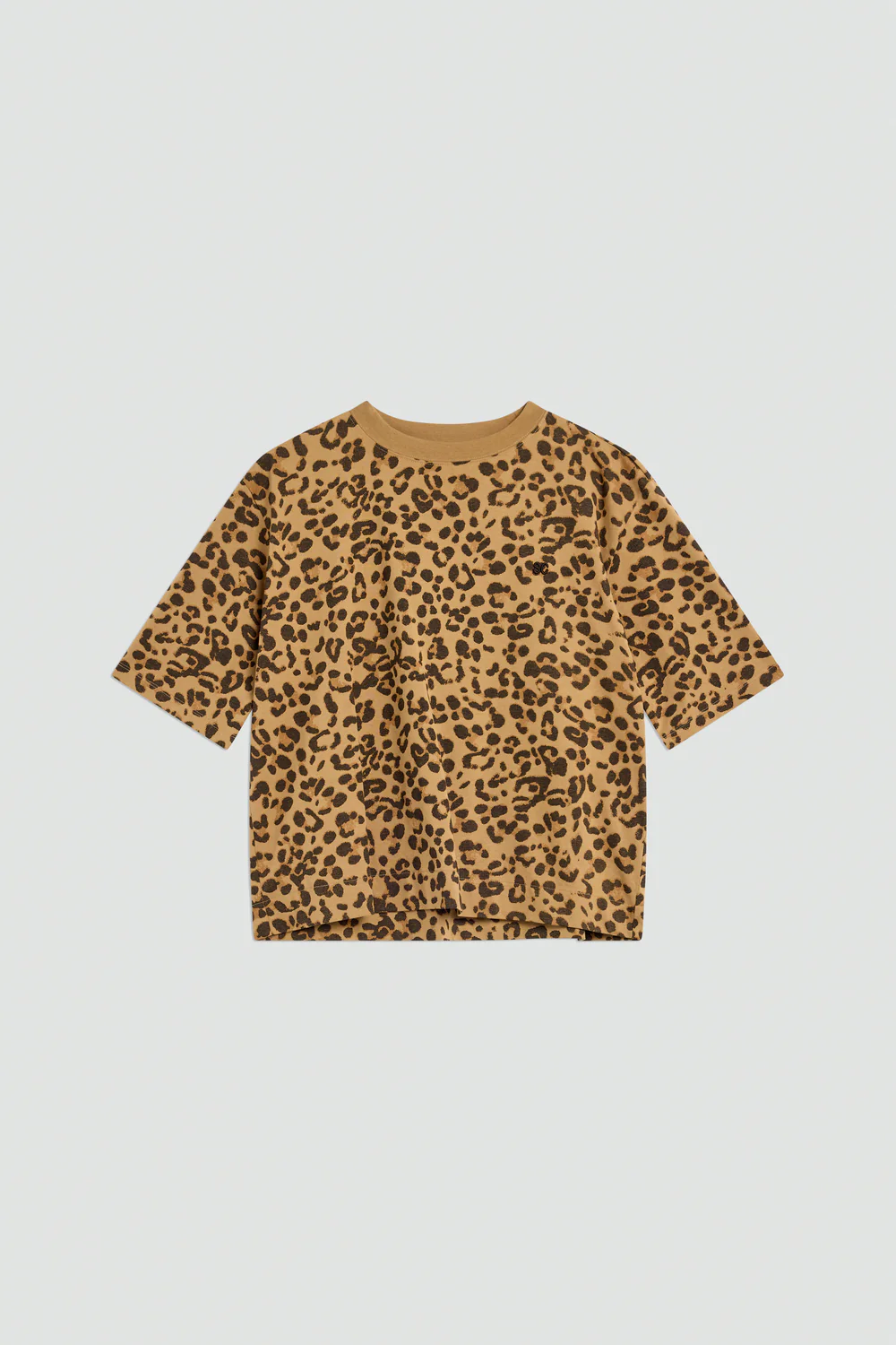 Its oversized fit creates a relaxed, contemporary silhouette that works both tucked into trousers and worn loose. A classic crew neck and short sleeves keep the design minimal, allowing the leopard-inspired print to take center stage.