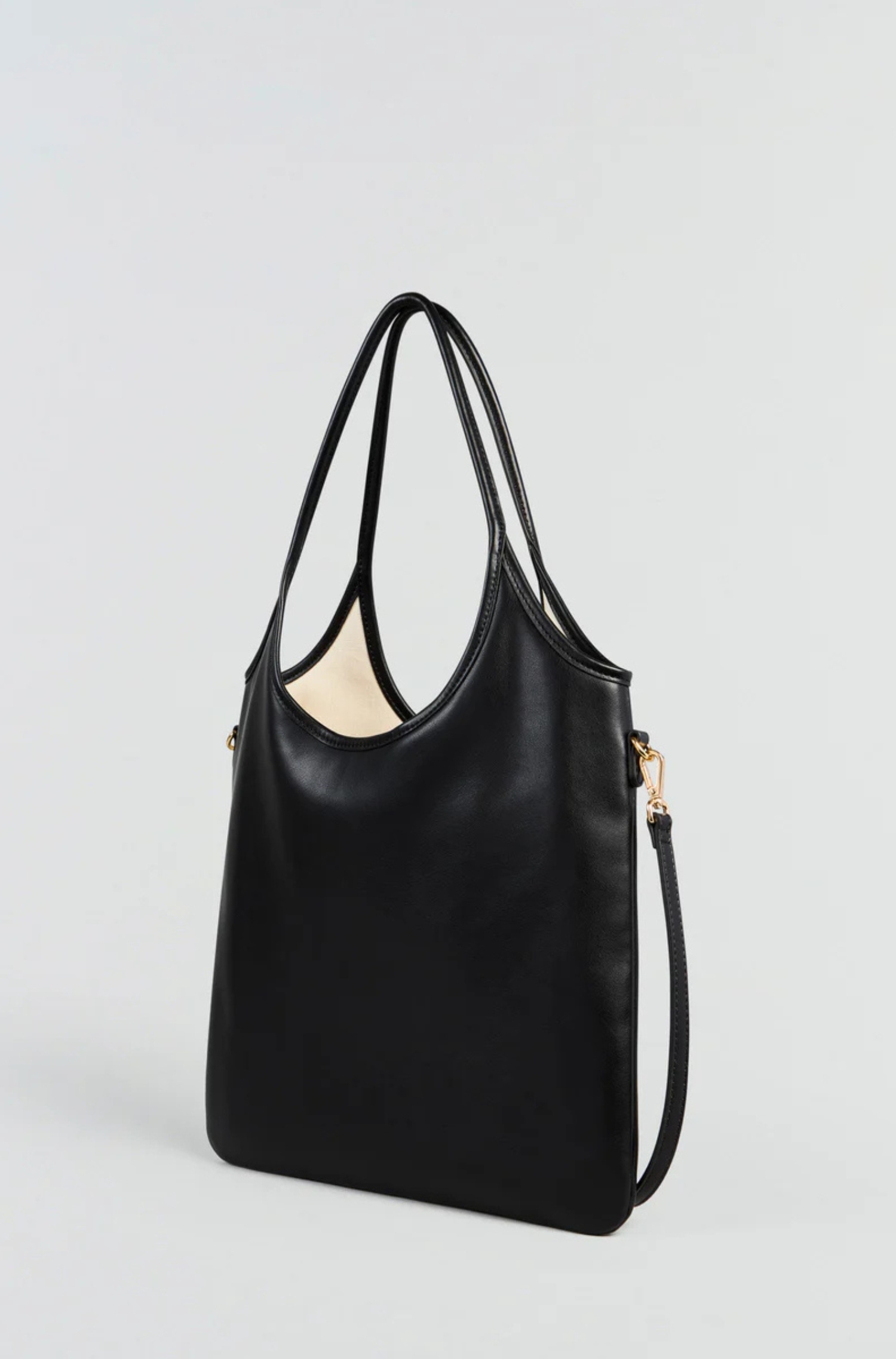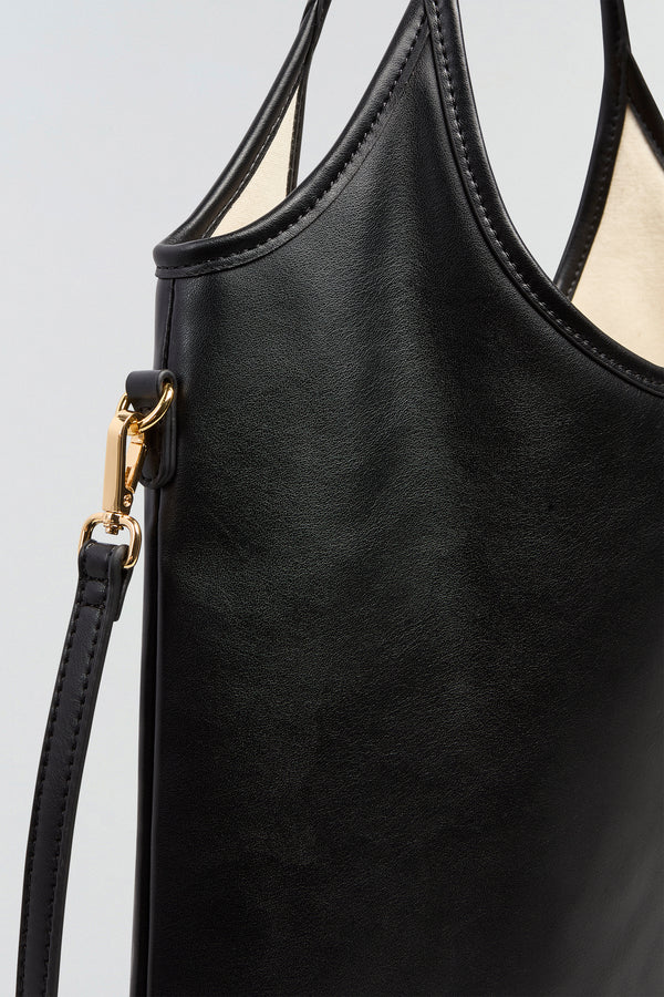 Shopping bag con ampi manici e tracolla regolabile. Fodera interna in tela di cotone con taschino.