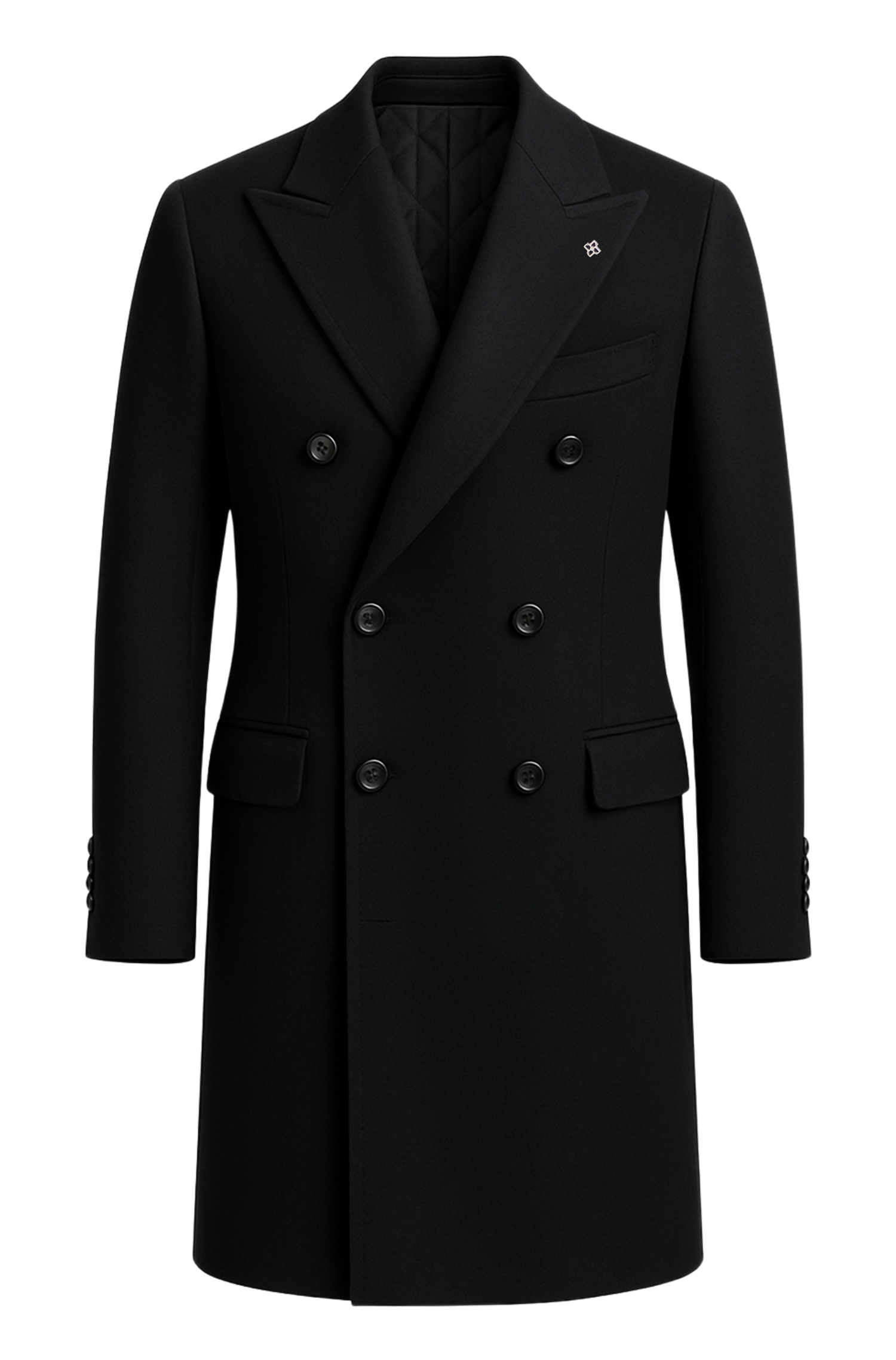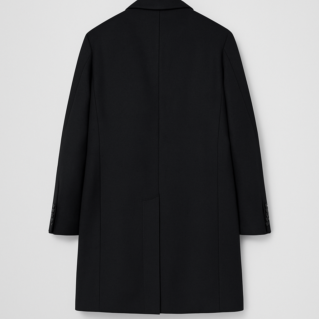 Double-breasted coat crafted from pure virgin wool, featuring a refined sartorial construction that ensures warmth, comfort and a flawless silhouette. The design includes sharp peak lapels, a six-button front, flap pockets and a lightly quilted inner lining that enhances protection on colder days.