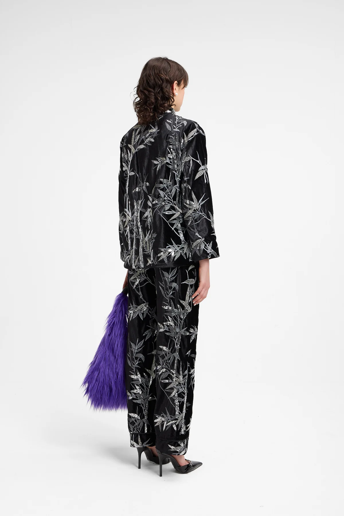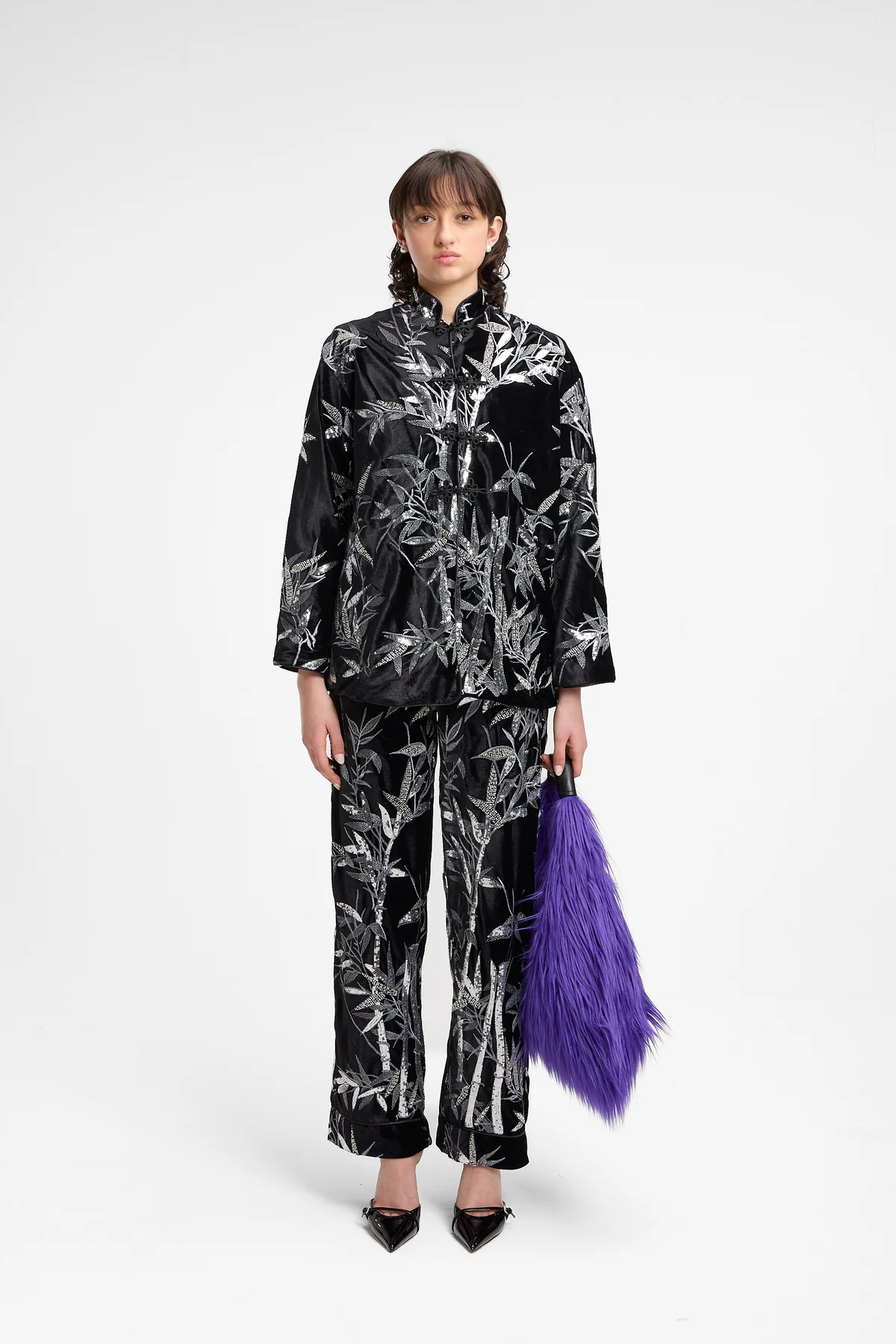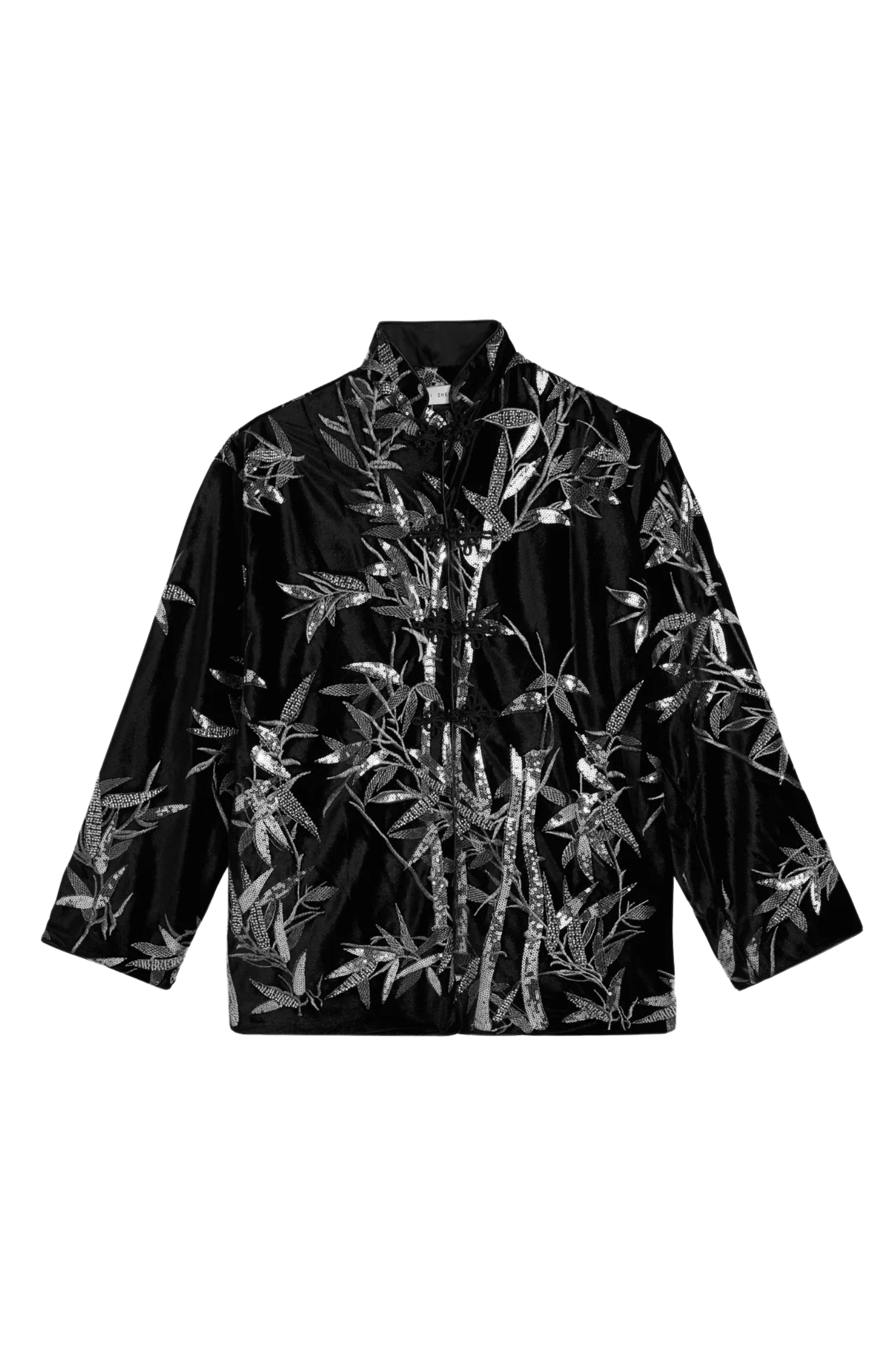 Embroidered Velvet Shirt with Piping and Mandarin Collar - Weili Zheng