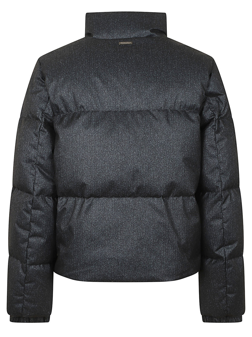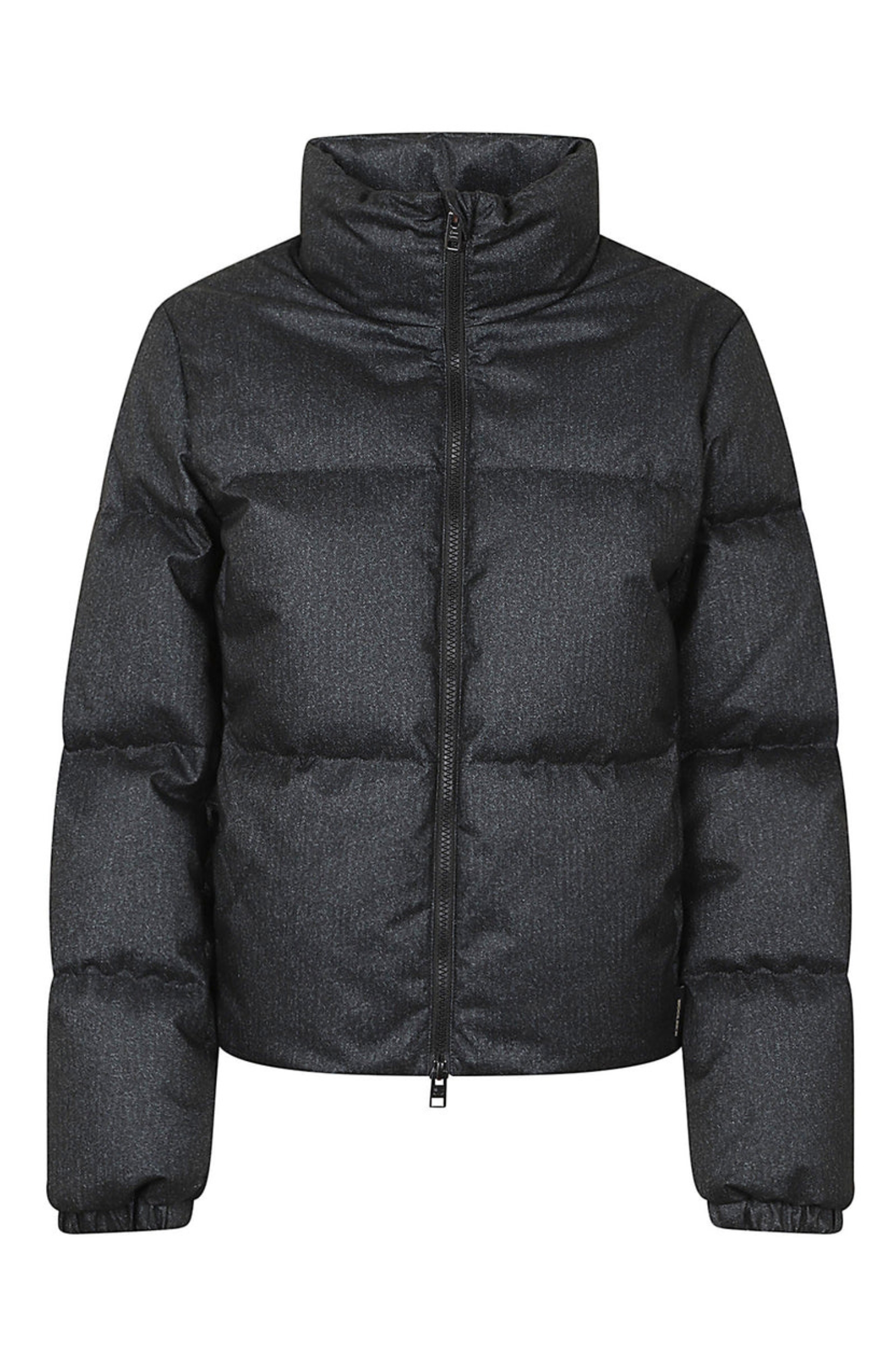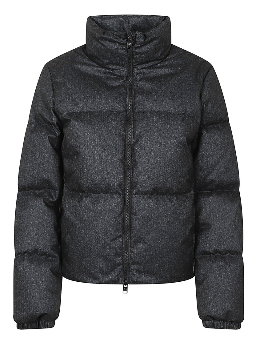The Woolrich Printed Wool Jacket CFWWOU2062 FRUT5093 100 Black is a womens short puffer designed to deliver warmth and urban style, made from a two-layer polyester fabric with a distinctive wool-effect print and padded with 70/30 duck down. Its bomber-inspired silhouette features a stand-up collar, practical two-way zip fastening, welt pockets with zips, elasticated cuffs and an adjustable drawstring hem, helping to retain body heat and keep you comfortable in temperatures ranging. Finished with a metal logo tag on the back and a side label, this black jacket is an easy-to-style winter essential for everyday casual outfits.
