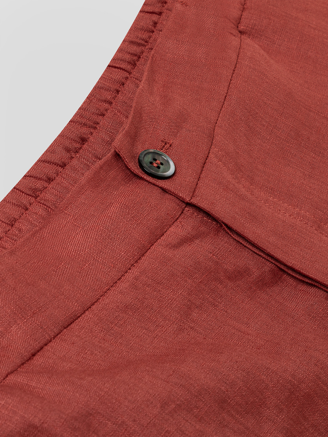 La vita elasticizzata con bottone offre praticità e una vestibilità adattabile, mentre il taglio lineare mantiene una silhouette ordinata e versatile. Il colore ruggine, caldo e distintivo, dona carattere al capo e rappresenta una scelta ideale per chi desidera aggiungere una nota cromatica più decisa al guardaroba estivo.