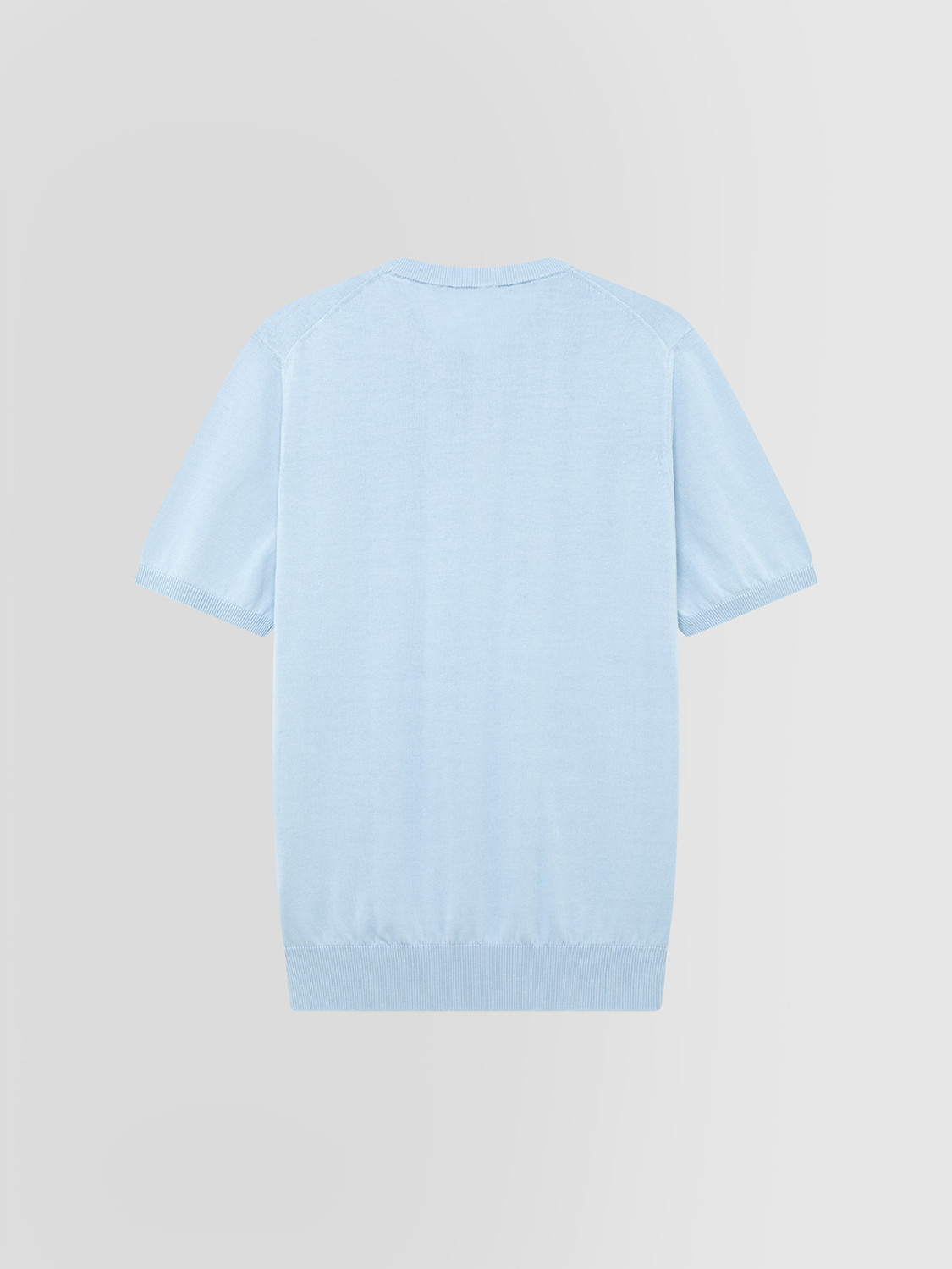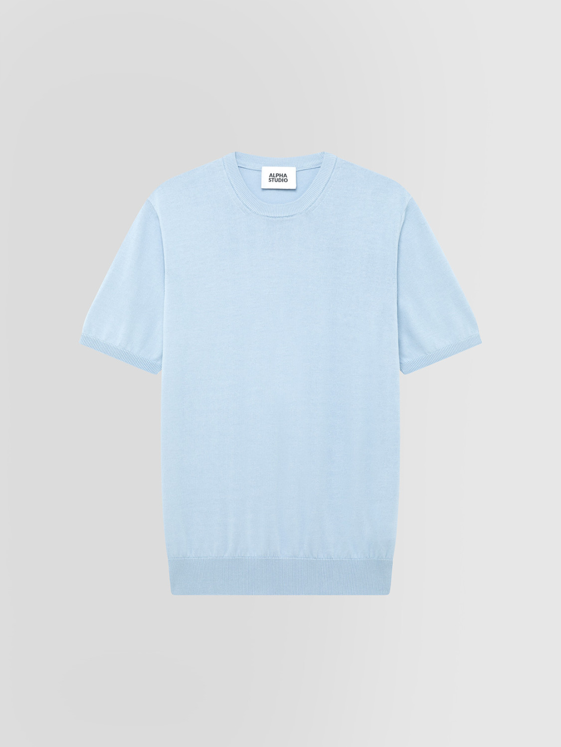 Il taglio è lineare e versatile, con girocollo classico e maniche corte, pensato per adattarsi facilmente a diversi abbinamenti. Il colore celeste aggiunge luminosità e freschezza al guardaroba, rendendo il capo perfetto per look estivi puliti e contemporanei.
