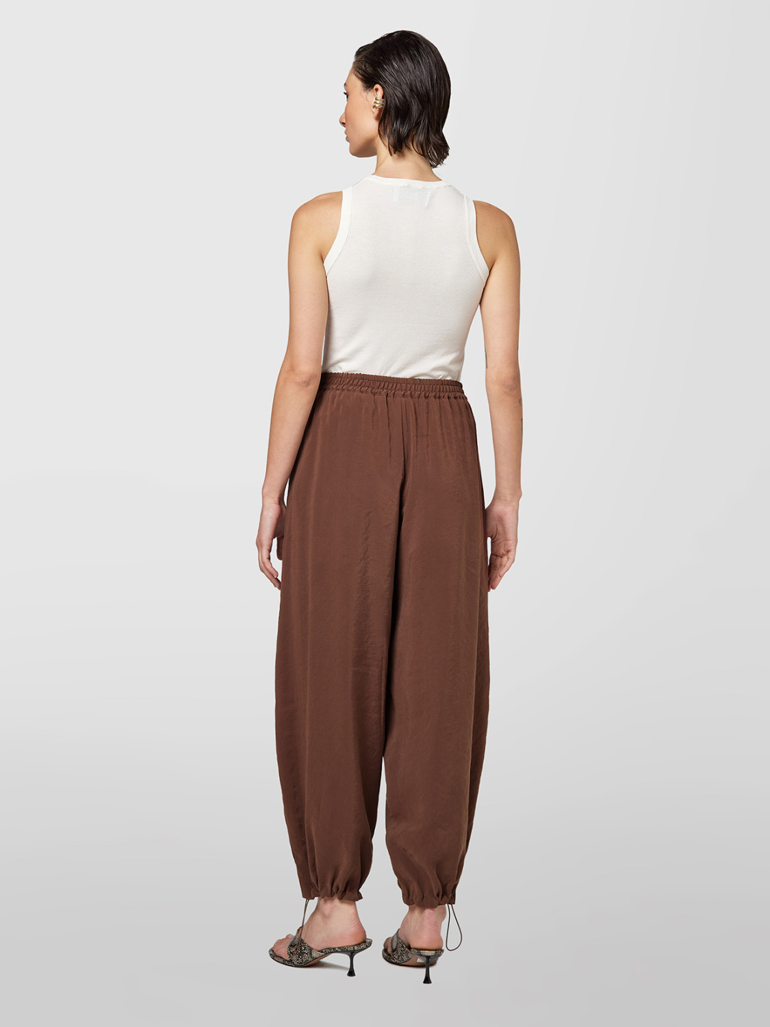La vita alta elasticizzata garantisce una vestibilità pratica e confortevole, adattandosi naturalmente alla silhouette. Il fondo è regolabile tramite coulisse, mentre il polsino definisce la linea della gamba, creando un effetto leggermente raccolto che aggiunge dinamismo al capo.