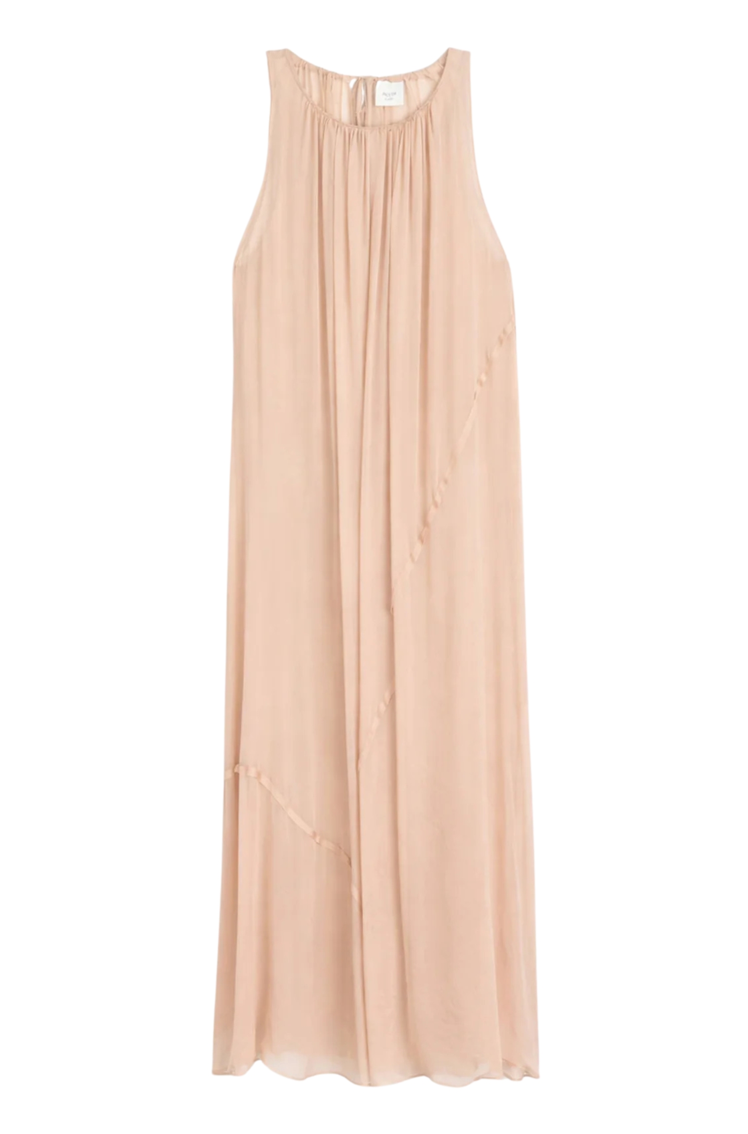 Questo abito lungo in chiffon di seta di Alysi è realizzato in chiffon 100% seta, che dona al capo una leggerezza impalpabile e una trasparenza sofisticata, bilanciata dalla sottoveste interna. La linea ampia e fluida accompagna il movimento con naturalezza, creando un effetto etereo ideale per occasioni speciali e serate estive.
