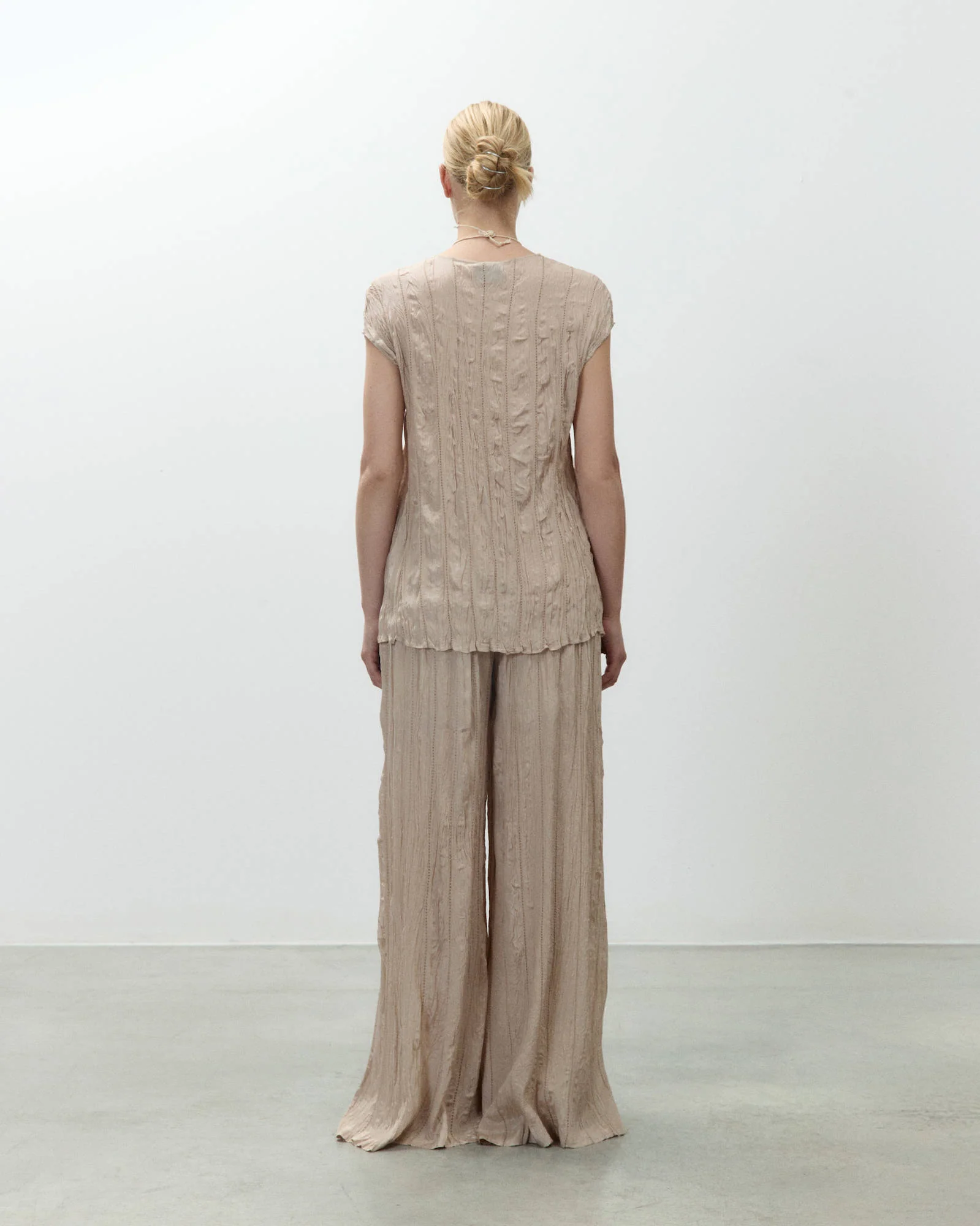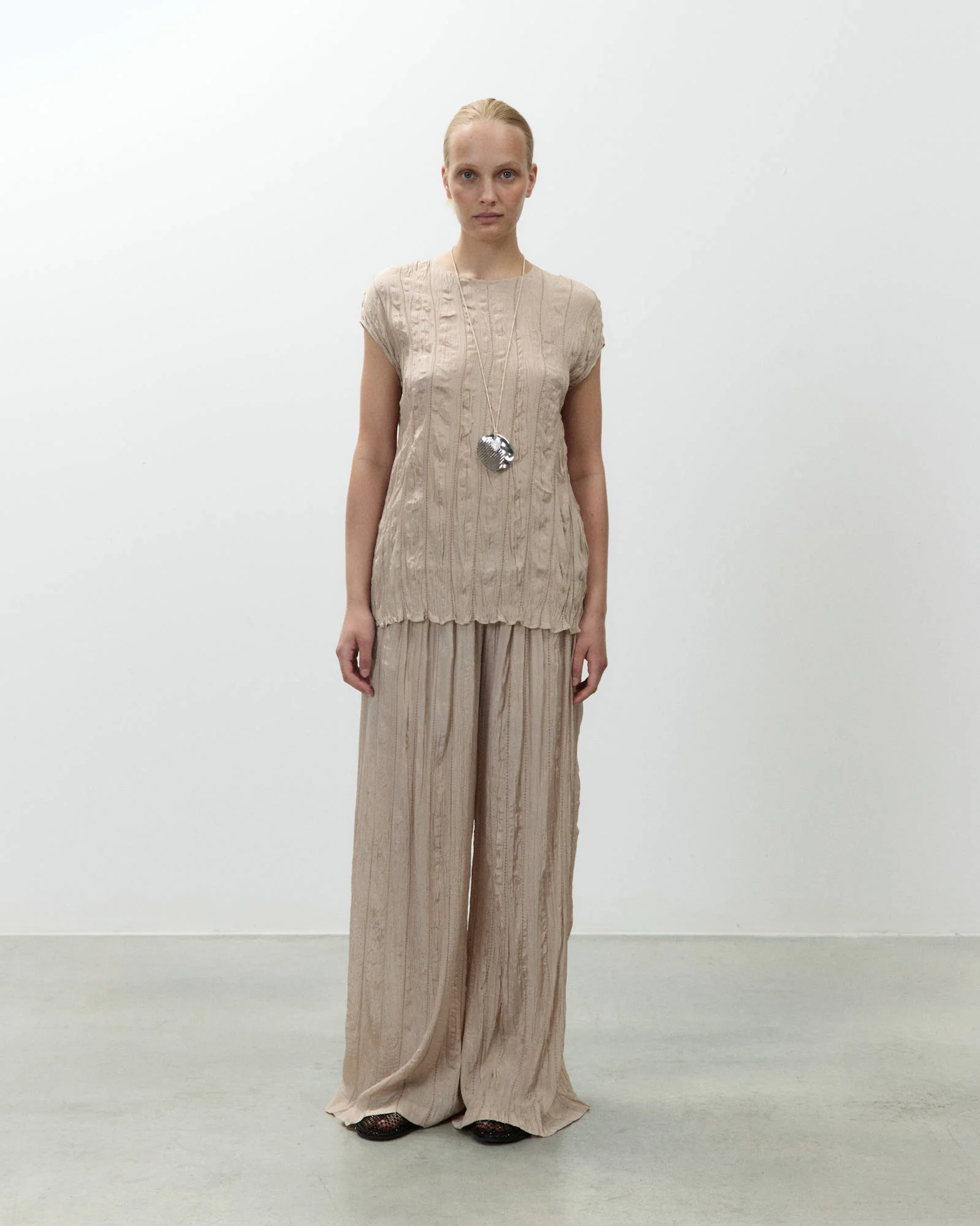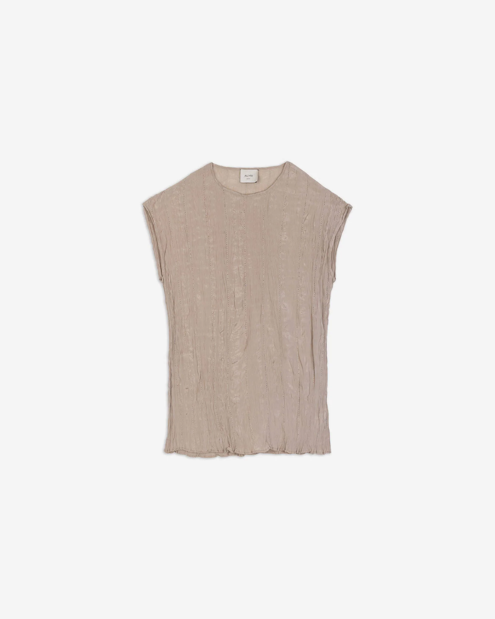 Il top Wrinkle di Alysi è realizzato in viscosa effetto increspato, lavorata con uno stropiccio artigianale che dona al capo una texture viva e contemporanea. La linea dritta e il regular fit garantiscono una vestibilità comoda, perfetta per look quotidiani dal carattere ricercato.