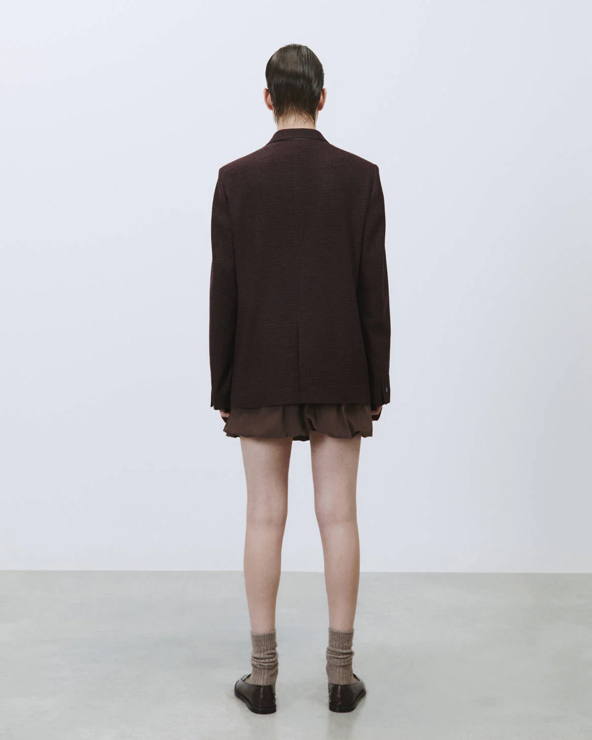 Il blazer Wool Check di ALYSI reinterpreta la tradizione sartoriale con un tocco contemporaneo. Realizzato in puro tessuto di lana vergine, presenta una texture micro check che valorizza la struttura del capo con un effetto grafico discreto ma distintivo.