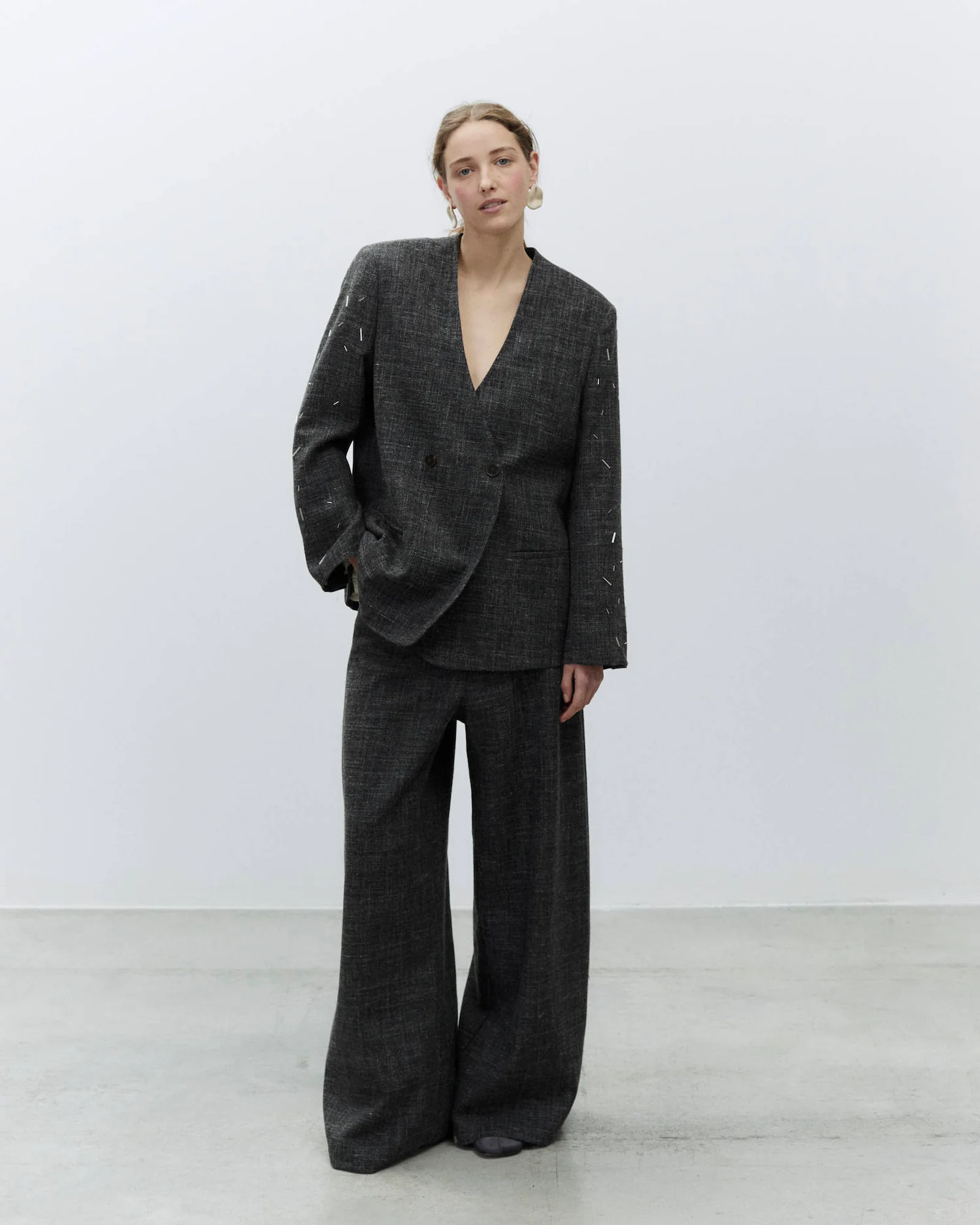Il taglio oversize e il profondo scollo a V senza rever creano uneleganza rilassata, mentre i ricami a mano sulle maniche aggiungono un tocco di unicità e savoir-faire artigianale. La struttura doppiopetto con tasche anteriori a filetto bilancia proporzioni e comfort, dando vita a una silhouette contemporanea ma armoniosa.