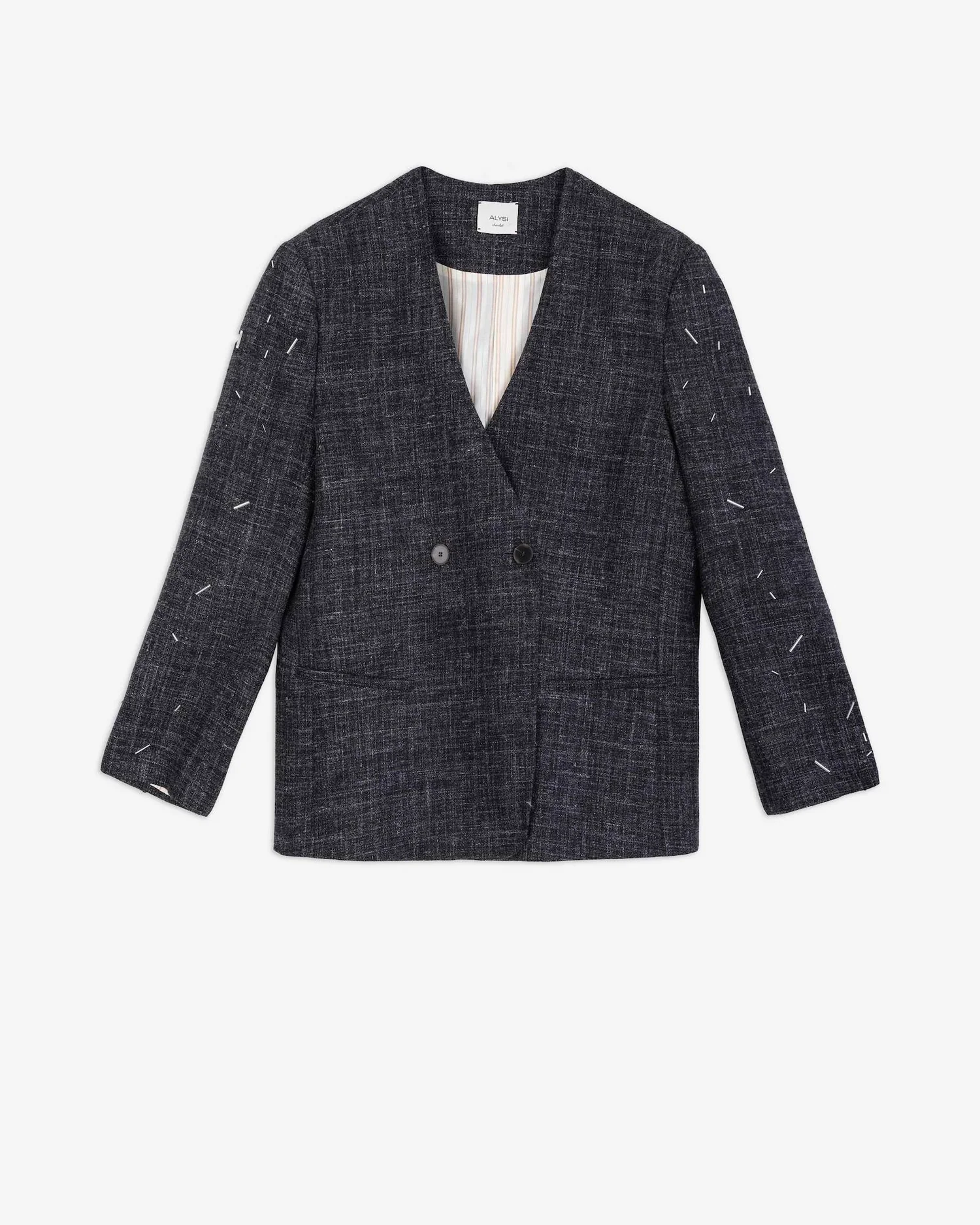 La giacca ricamo Graniglia Wool di ALYSI è un capo statement che fonde tradizione sartoriale e ricerca artistica. Realizzata in tessuto misto lana, poliestere e lino, si distingue per la texture materica e leggera, ideale per la stagione.