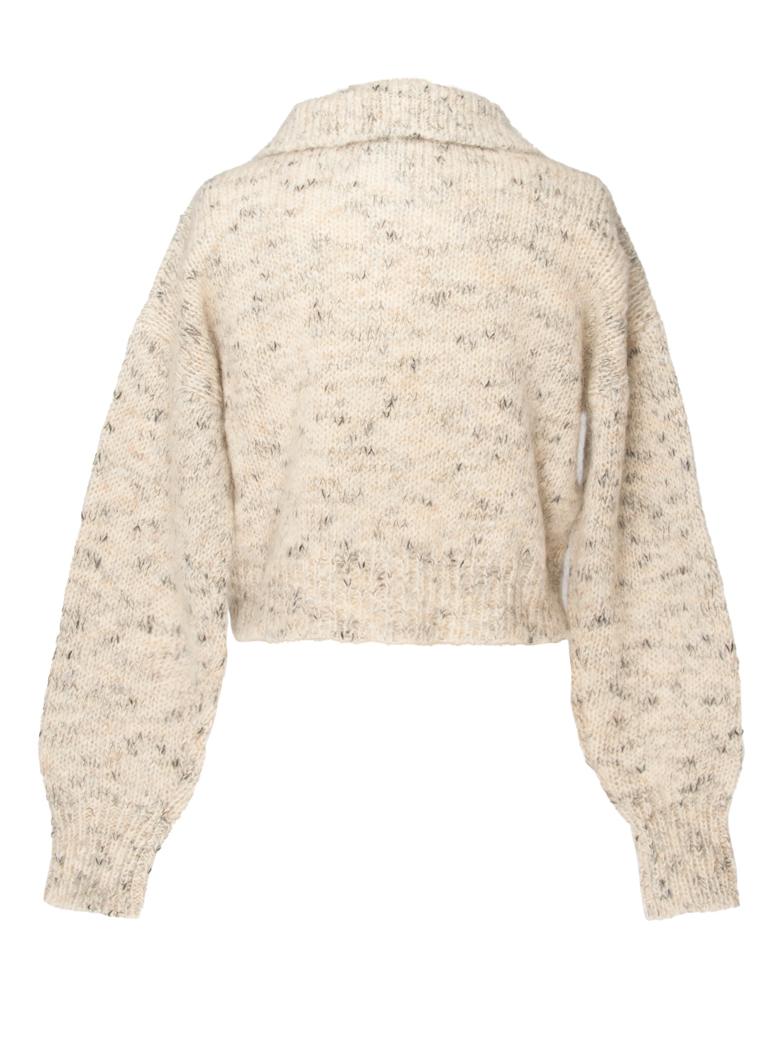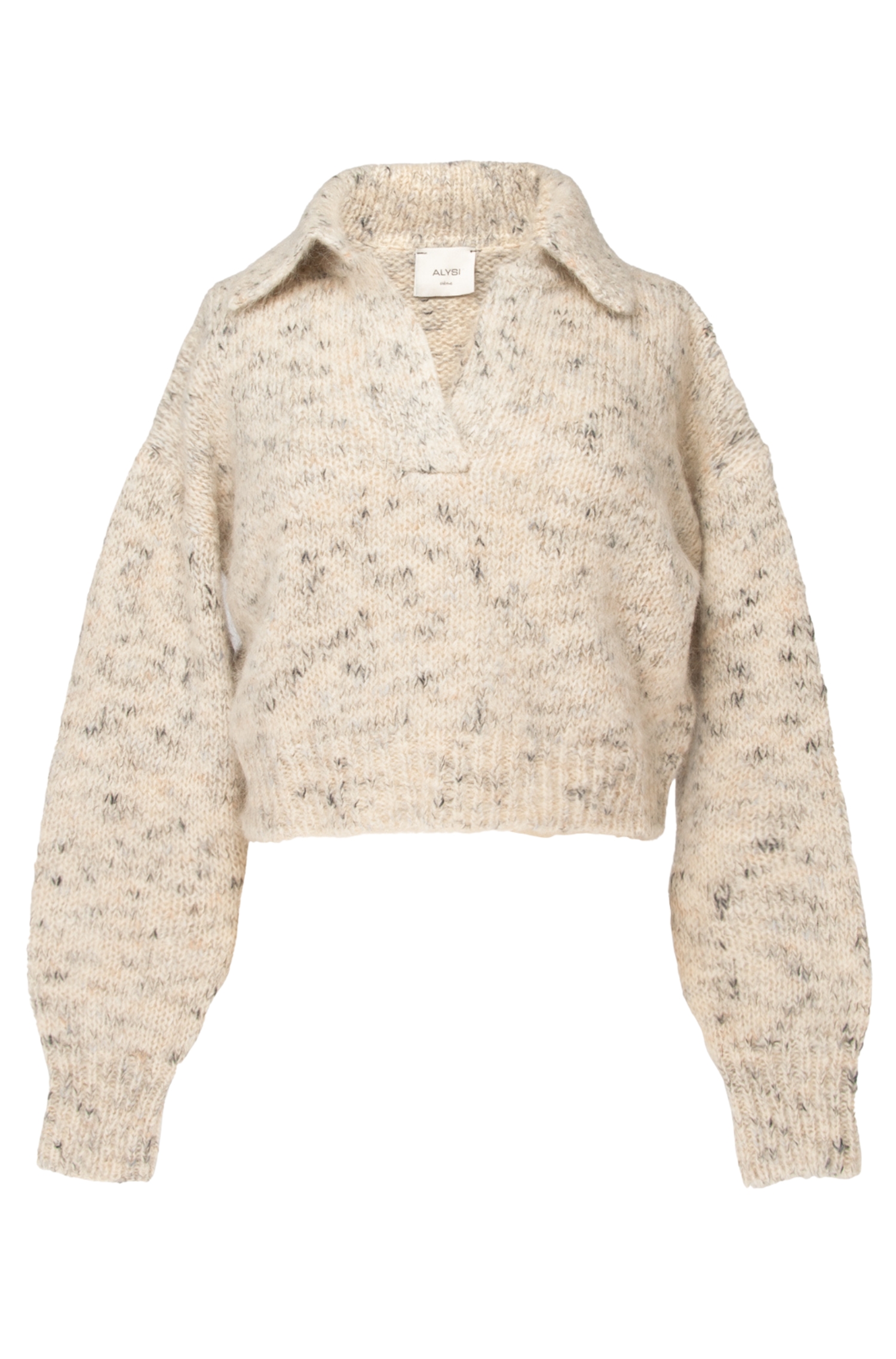 Maglia cropped Alysi dalla lavorazione artigianale e dal carattere materico, con colletto aperto e volumi morbidi. Un capo caldo e raffinato, ideale per completare look contemporanei con naturale eleganza.