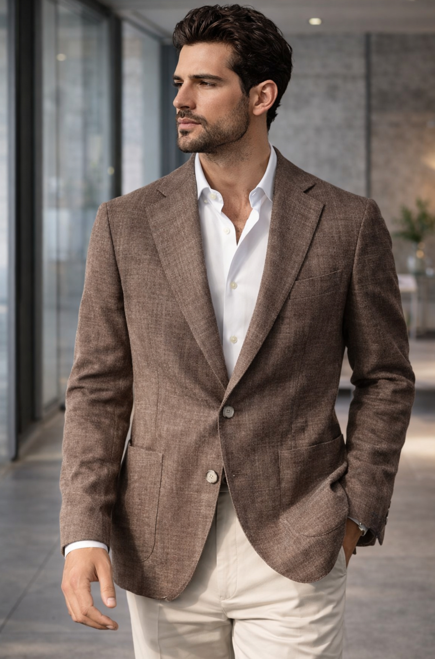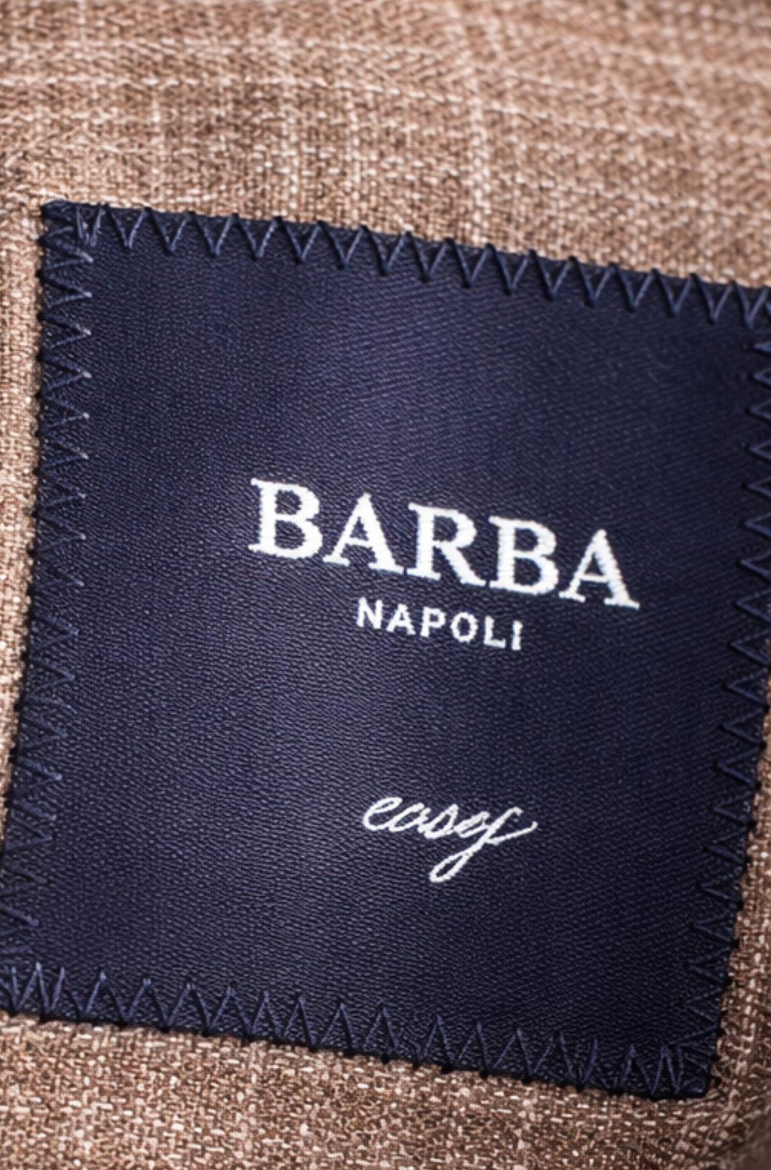 Questa giacca Barba Napoli modello EASYJ MONO unisce lestetica rilassata della linea easy alla qualità del tessuto Loro Piana Summertime. Il motivo mélange marrone, con una leggera trama a spina di pesce, dona profondità cromatica e un aspetto sofisticato ma discreto, ideale per outfit quotidiani curati. Il frontale monopetto a due bottoni, i rever classici e le tasche applicate a toppa definiscono una linea moderna e versatile, perfetta con chino chiari o denim. La struttura leggera con spalla morbida, la parziale fodera interna chiara e il fondo leggermente arrotondato garantiscono comfort e portabilità in diverse occasioni. Il patch Barba Napoli easy e il cartellino interno dedicato al tessuto Loro Piana valorizzano il carattere premium e artigianale del capo, realizzato a mano a Napoli.