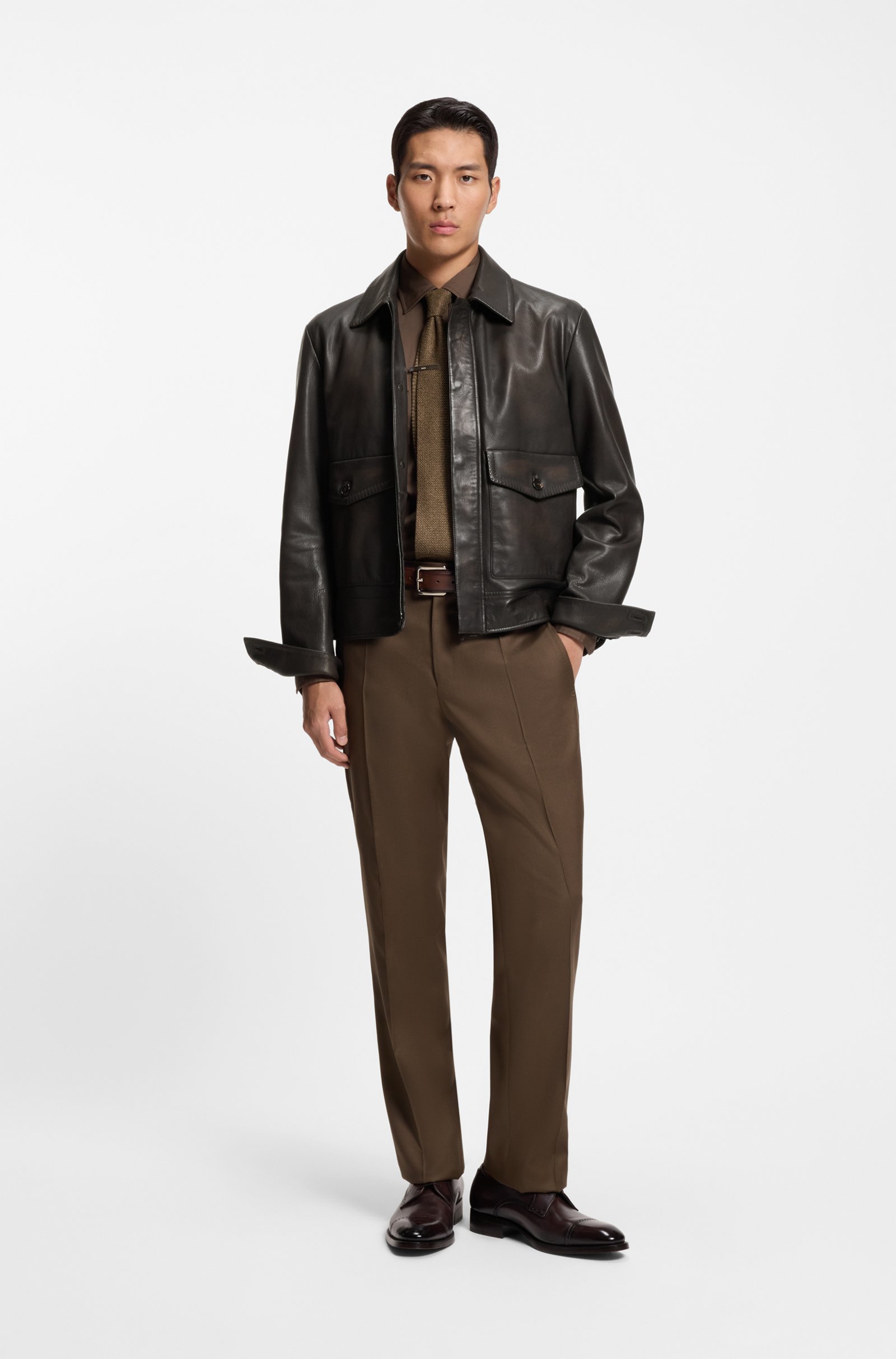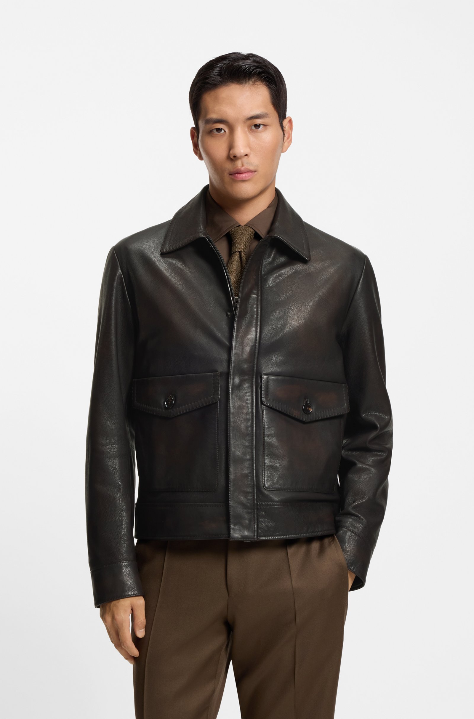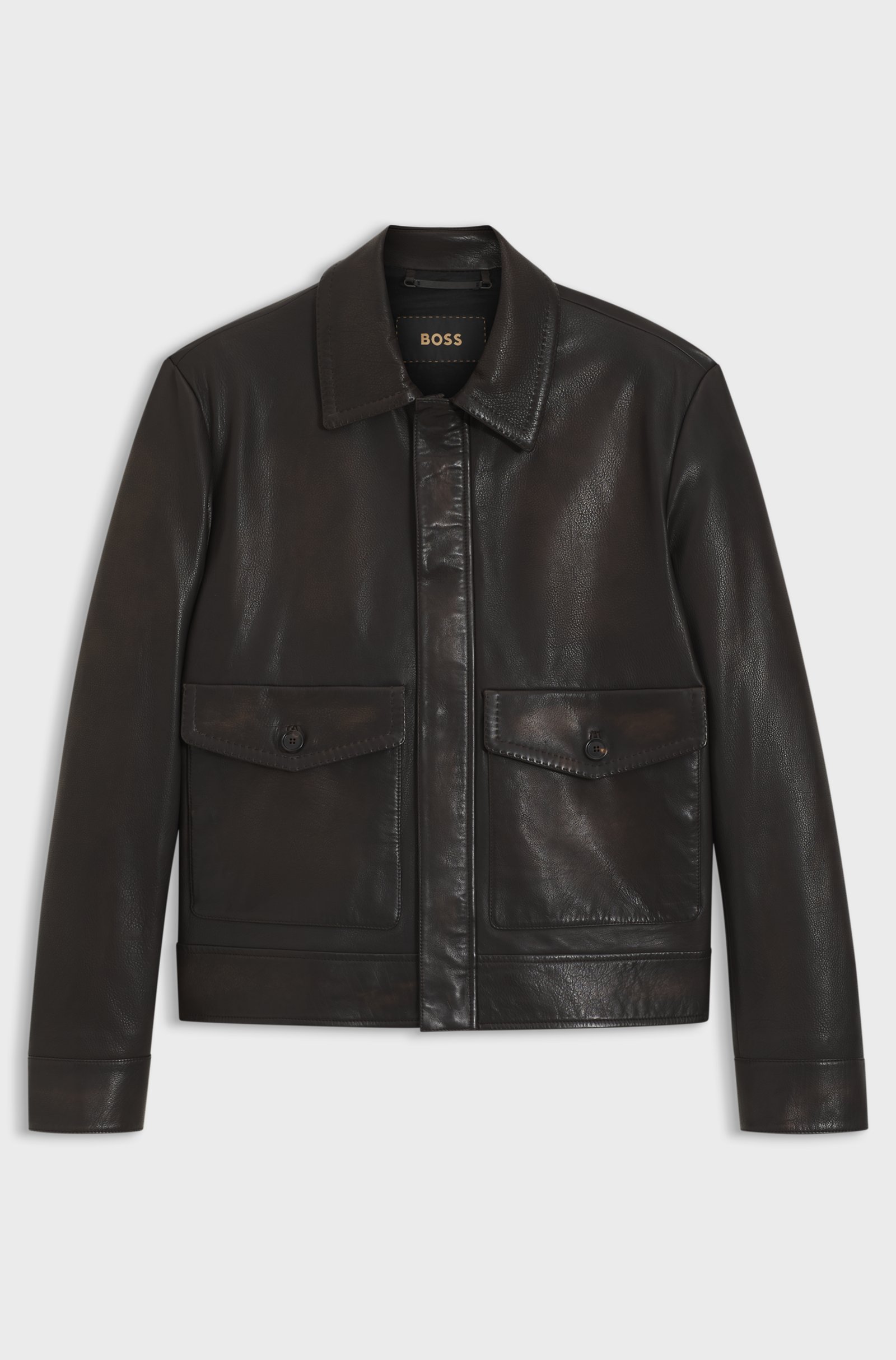 Questo giubbotto stile aviatore BOSS, modello L-Mabor1, è realizzato in nappa di vitello 100% con finitura cerata a mano che conferisce profondità di colore e un aspetto ricco e raffinato. Le cuciture AMF, tipiche della sartoria, sottolineano il livello di dettaglio e donano un tocco tailoring a una giacca ispirata al mondo pilot.