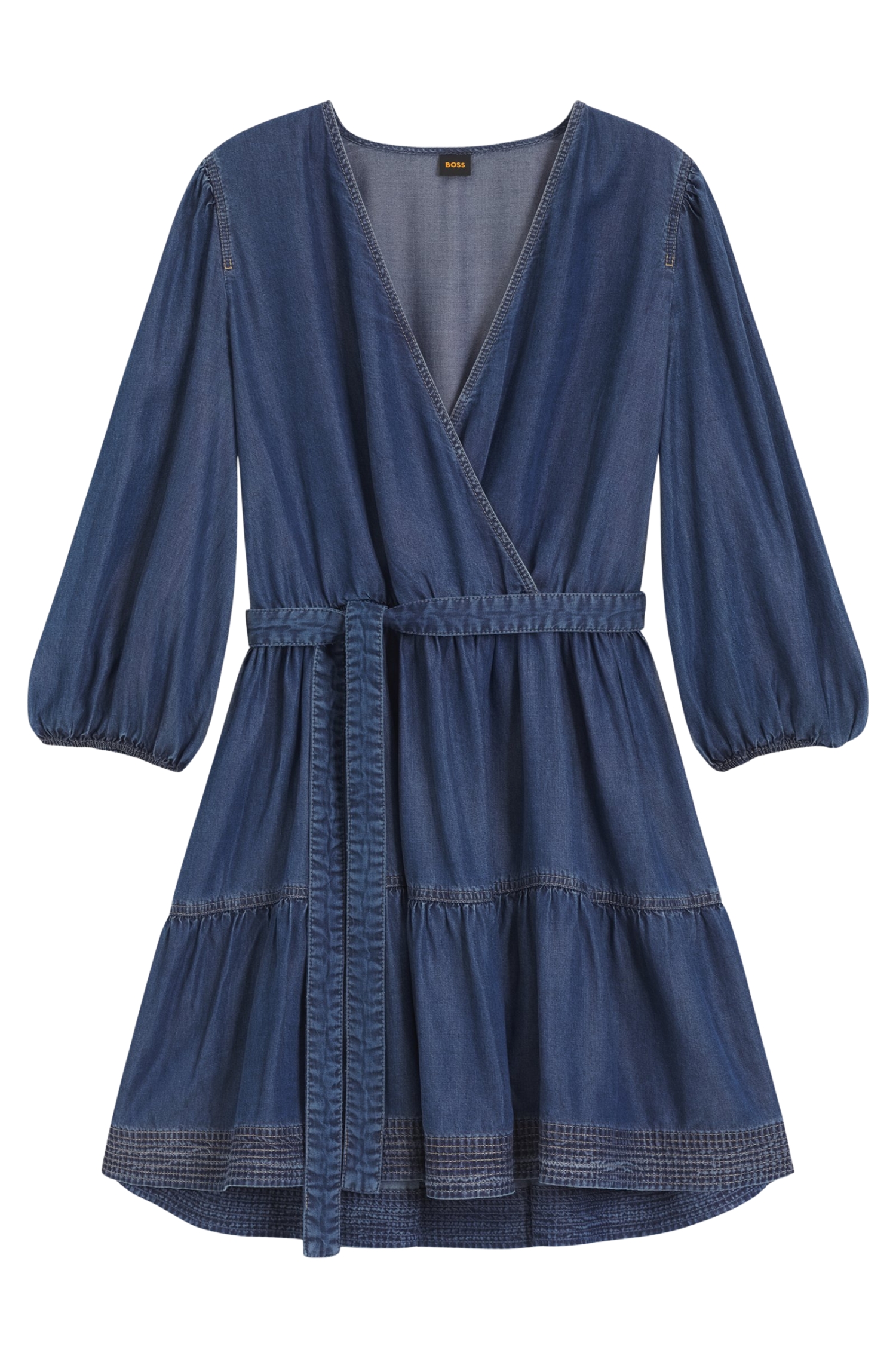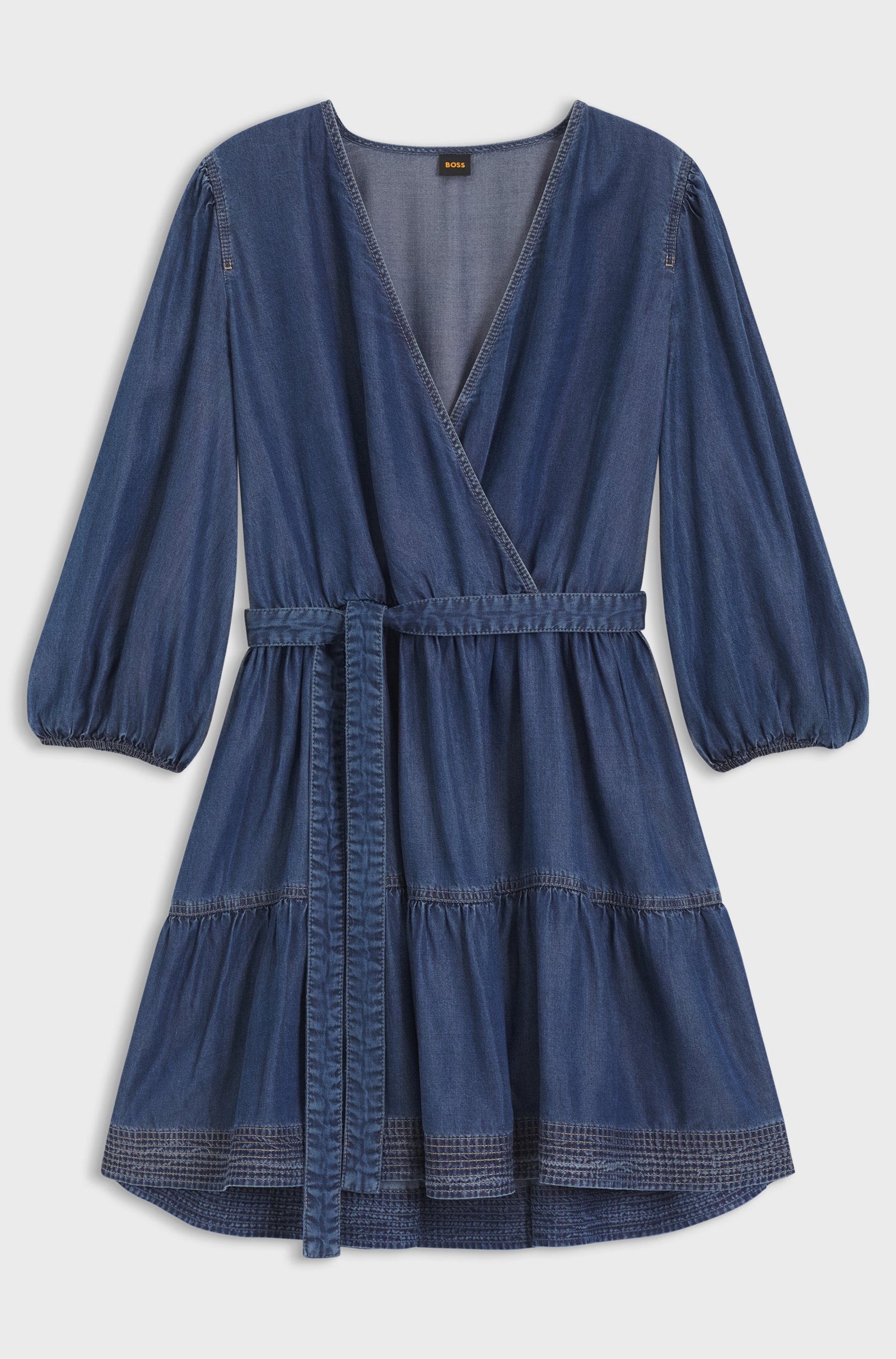 BOSS vestito in lyocell effetto denim con parte anteriore incrociata e maniche a palloncino
