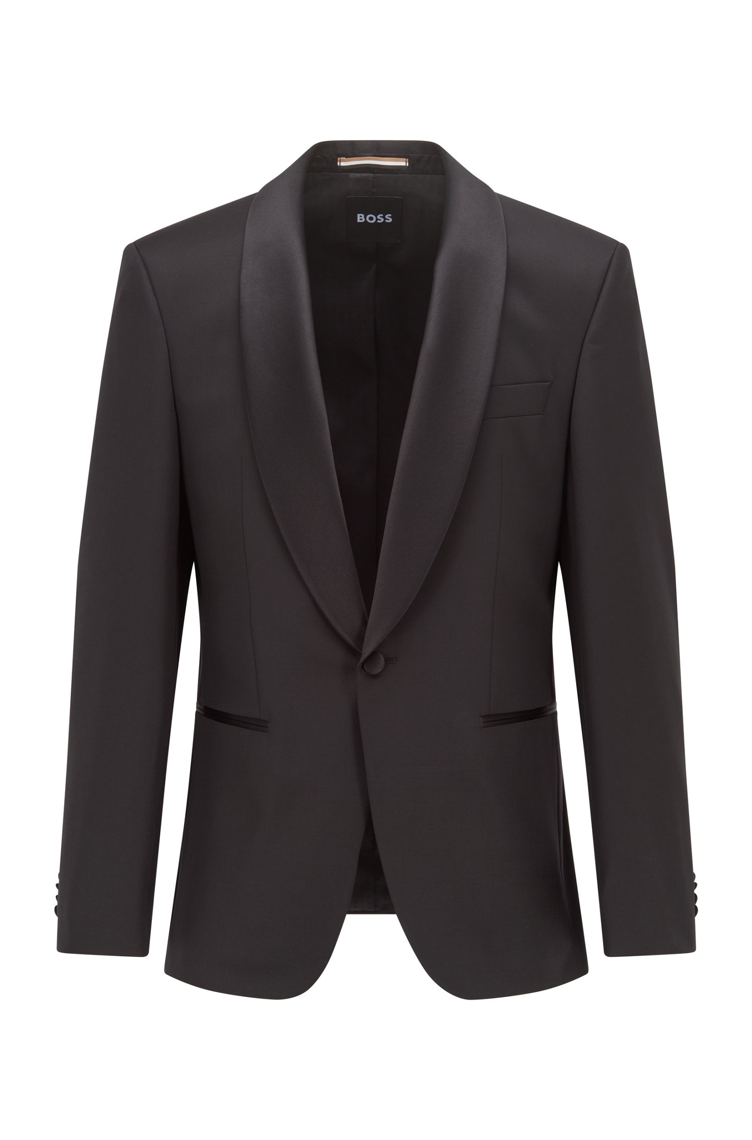 Una giacca da smoking da sera con revers a scialle di BOSS Uomo. Caratterizzata da finiture in misto seta per un effetto raffinato, questa giacca è caratterizzata da un passante per gruccia con striscia d'autore all'interno del colletto. Per i nostri prodotti RESPONSIBILI, usiamo sempre almeno il 60% di materie prime più sostenibili. Questo capo è realizzato con almeno il 60% di lana responsabile e certificata. Per HUGO BOSS, lana responsabile significa che soddisfa gli standard delle Cinque Libertà del benessere animale.