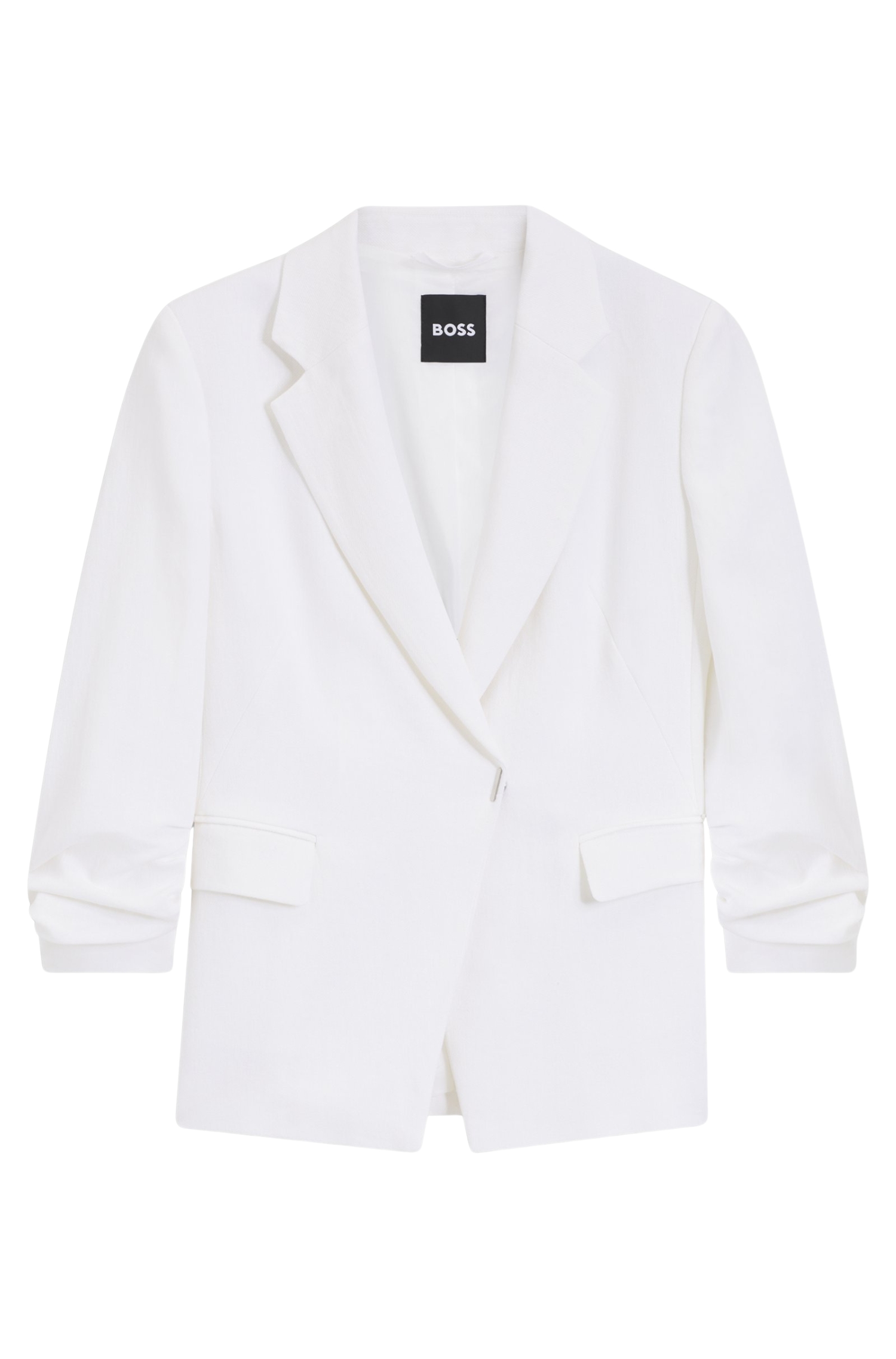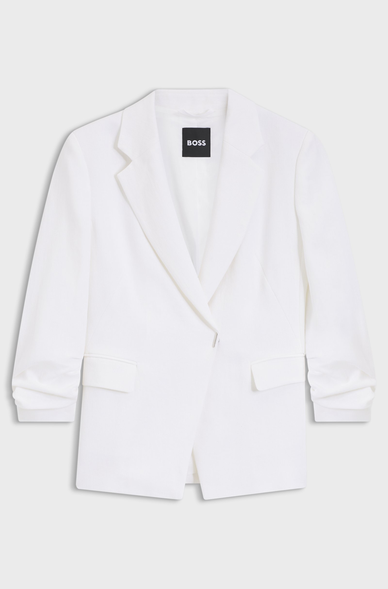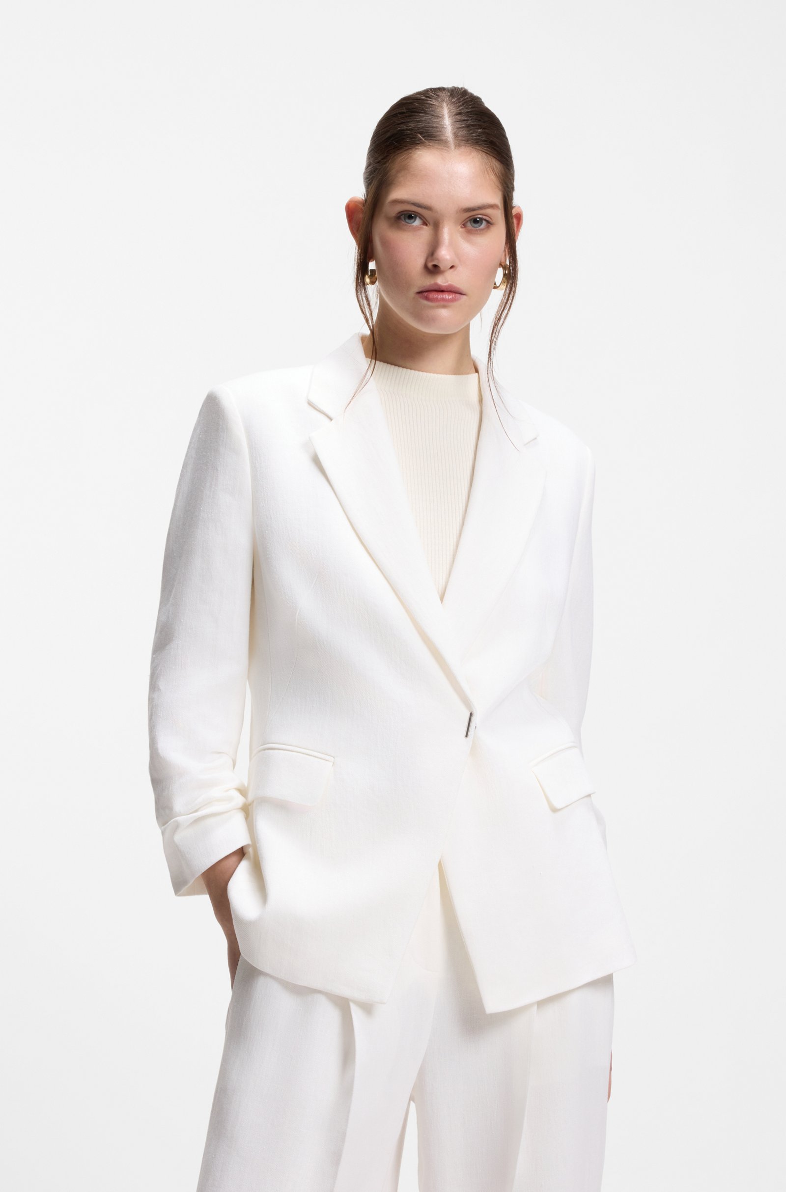 Questa giacca slim fit BOSS Donna è realizzata in un leggero misto lino e viscosa, ideale per i look formali nella bella stagione grazie alla mano fresca e alla struttura raffinata del tessuto. La linea aderente segue la figura senza risultare rigida, valorizzando la silhouette con una vestibilità femminile e pulita.