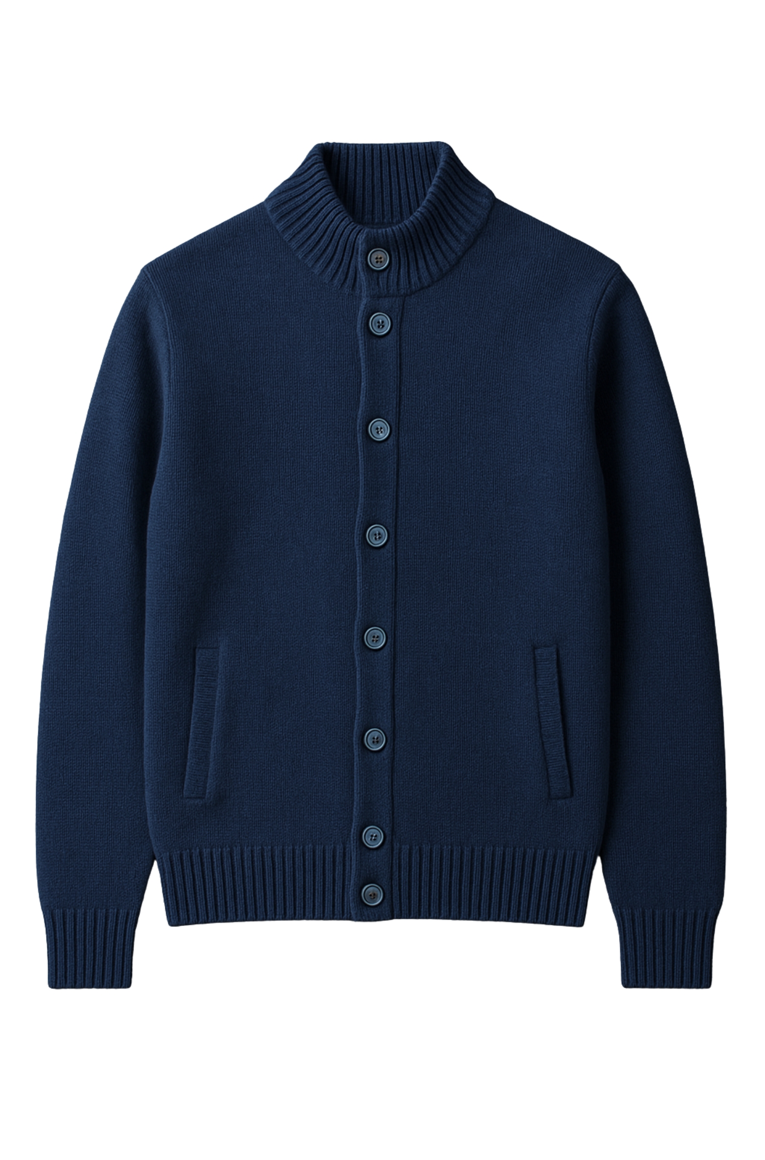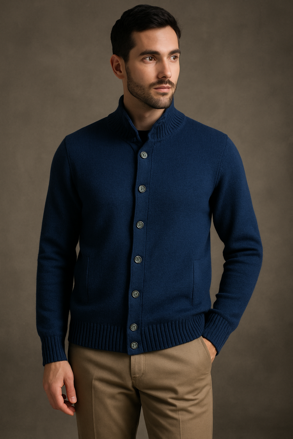 Questo cardigan da uomo firmato Cavalieri Milano è realizzato in lana di alta qualità ed è caratterizzato da una raffinata tonalità blu, profonda e intramontabile. Il design con collo alto e chiusura frontale a bottoni conferisce al capo uneleganza discreta, perfetta per valorizzare sia look casual curati che abbinamenti più formali.