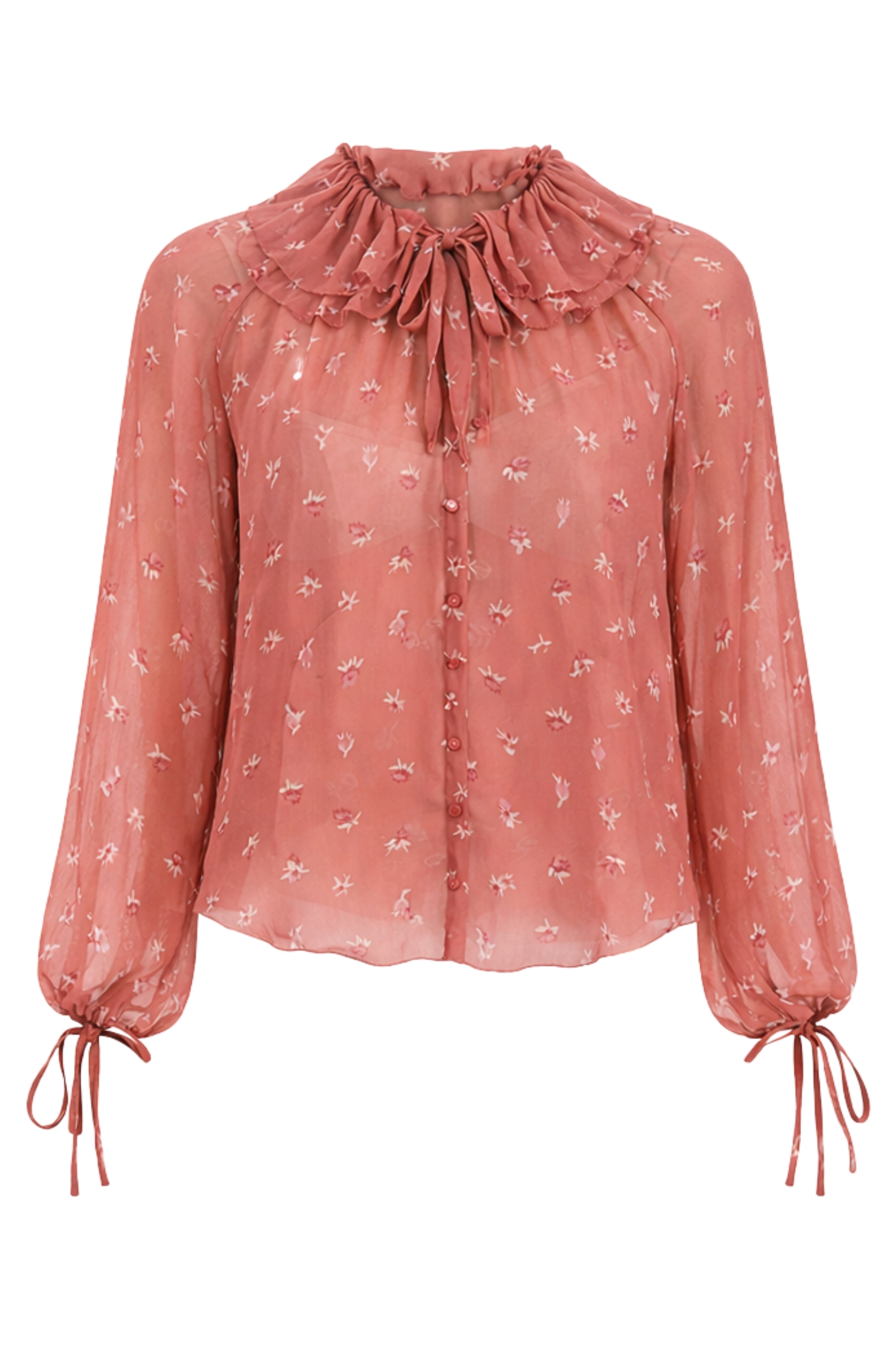 La coupe è dritta, con scollo rotondo sormontato da due volant froncés e un laccetto da annodare sul davanti, che permette di modulare lapertura dello scollo. Un profondo décolleté a V prosegue in una patta di bottoni tono su tono, mentre le maniche lunghe con spalle raglan sono strette ai polsi da un elastico e completate da un nud décoratif.