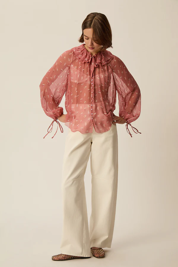 La blusa Velinda Flora di Des Petits Hauts sublima le silhouette di primavera con una trasparenza elegante e unallure poetica. Realizzata in 100% mousseline di viscosa leggera, vaporeuse e morbida, offre una caduta fluida e delicata per una portabilità aerea e raffinata.