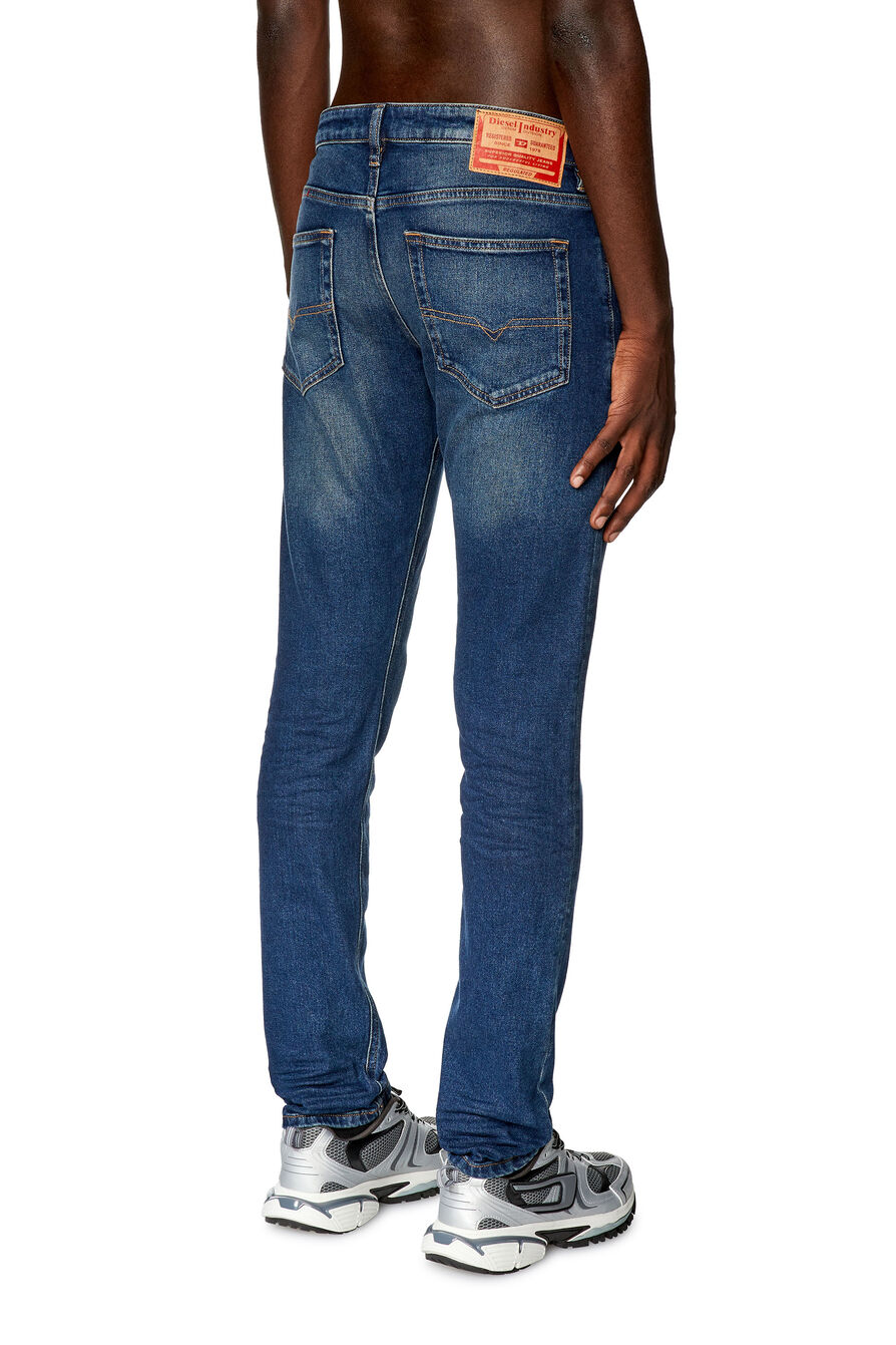 Jeans slim con cavallo leggermente basso, patta e bottoni. La gamba si restringe dal ginocchio alla caviglia.