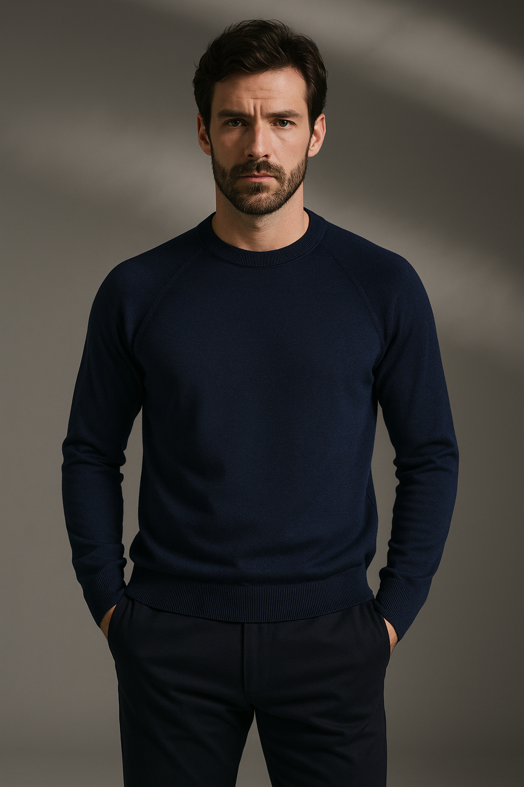 Il modello presenta un design pulito con maniche raglan, che offrono una vestibilità naturale e un aspetto sportivo-elegante. Il colore blu navy esprime stile senza tempo ed è facile da abbinare in qualsiasi guardaroba maschile.