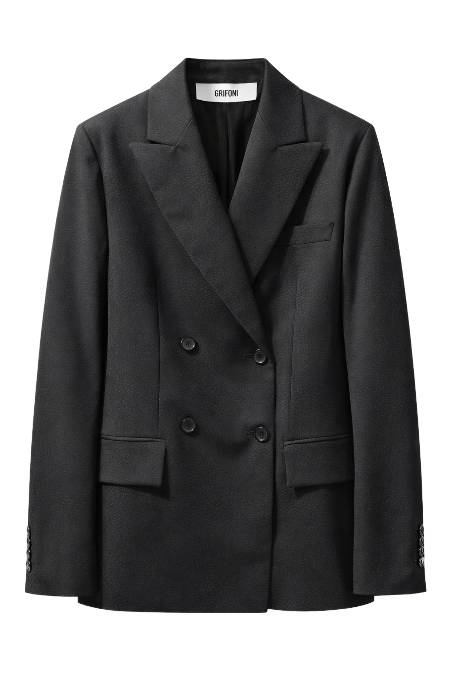 Questa giacca doppiopetto nera di Grifoni rappresenta lequilibrio ideale tra eleganza classica e stile contemporaneo. La linea strutturata, arricchita dal rever ampio e dalla chiusura a doppio petto con bottoni tono su tono, dona carattere e autorevolezza alla silhouette senza risultare rigida.