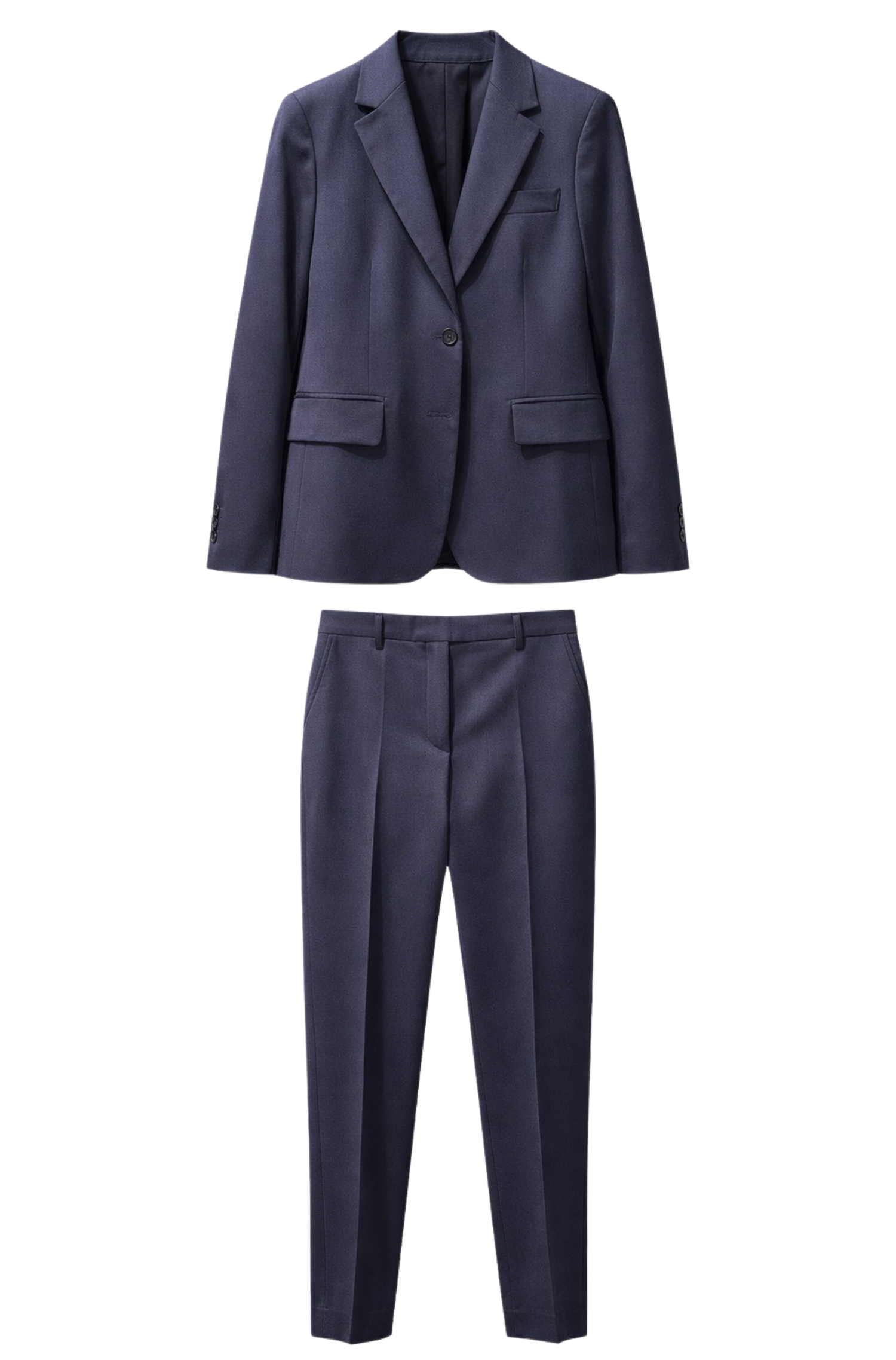 Questo tailleur Grifoni in tonalità blu navy esprime uneleganza pulita e contemporanea, ispirata alla tradizione sartoriale italiana. Il blazer presenta una linea strutturata ma femminile, con rever classico, chiusura a un bottone e tasche con patta che valorizzano la silhouette senza appesantirla.