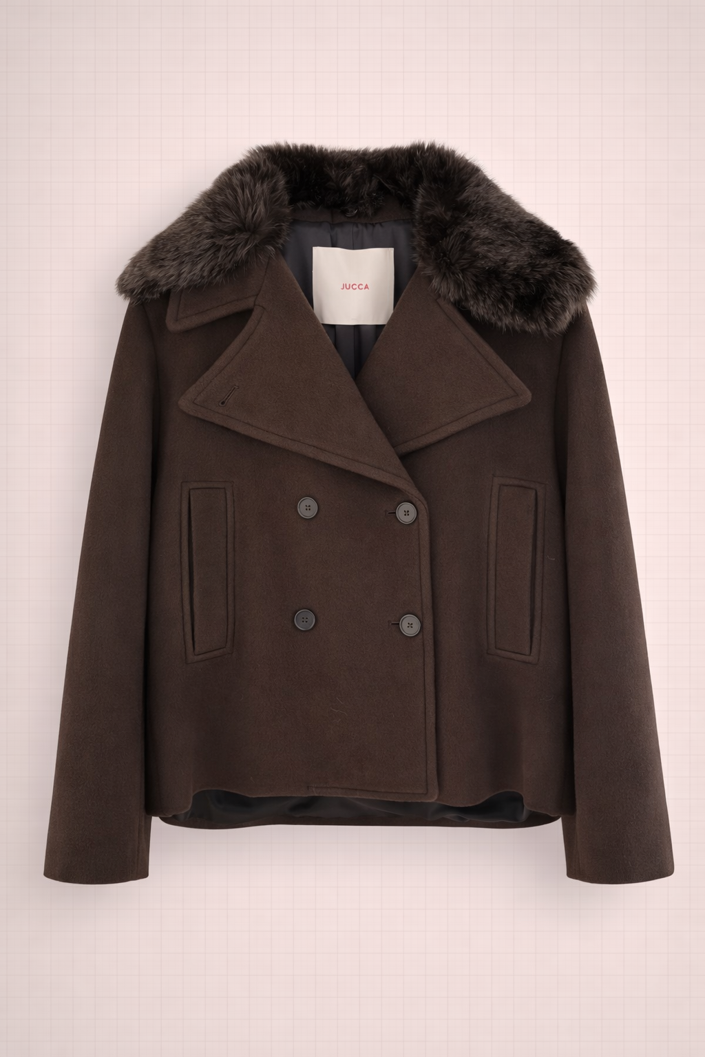 Cappotto Doppiopetto Donna Jucca in Lana Vergine con Collo in Eco Pelliccia Colore Cocoa