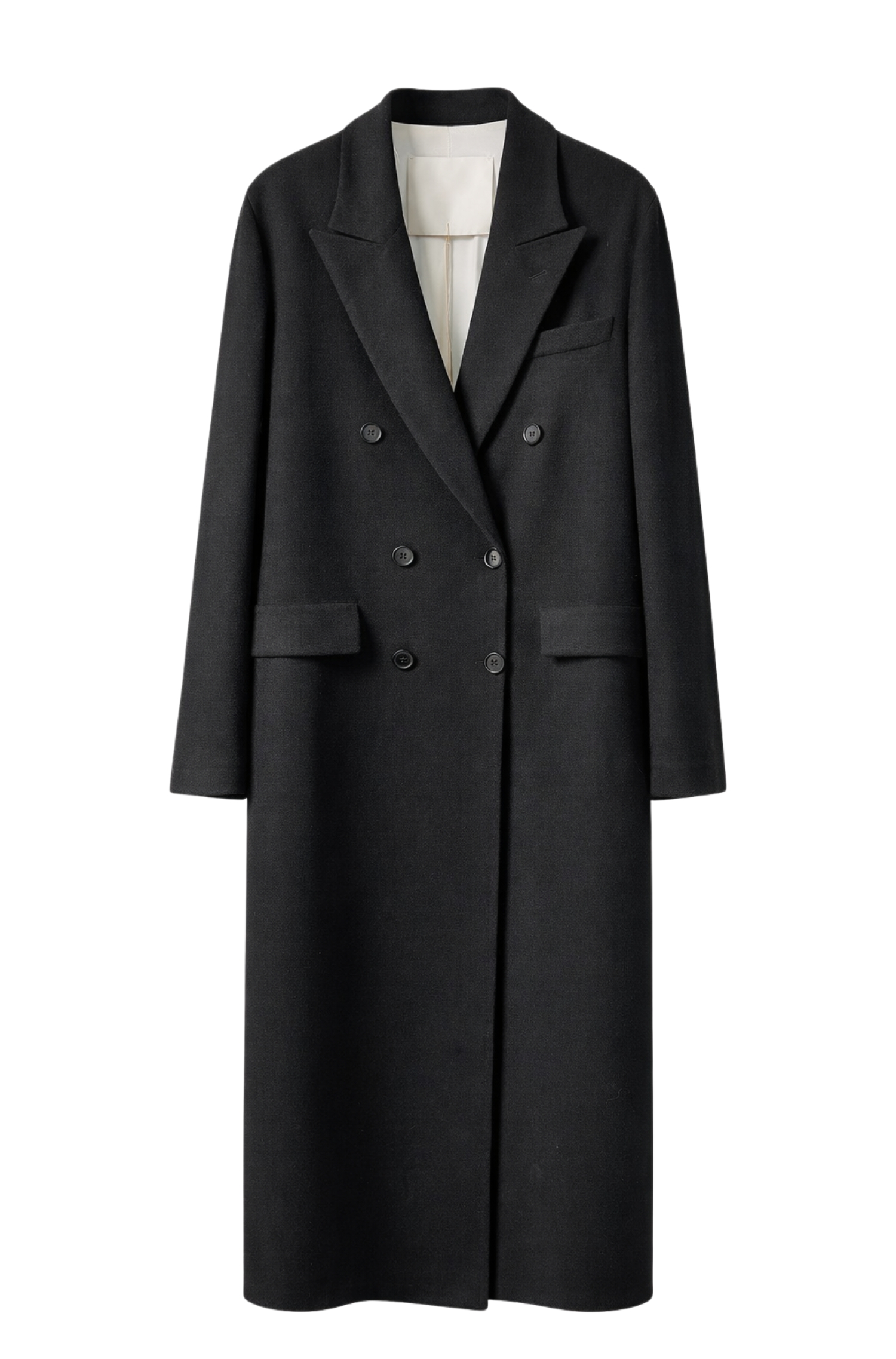 Questo cappotto doppiopetto in flanella nera unisce rigore sartoriale e versatilità contemporanea. La linea allungata e strutturata valorizza la silhouette senza risultare rigida, mentre il design essenziale lo rende adatto a molteplici occasioni, dal lavoro agli impegni serali.