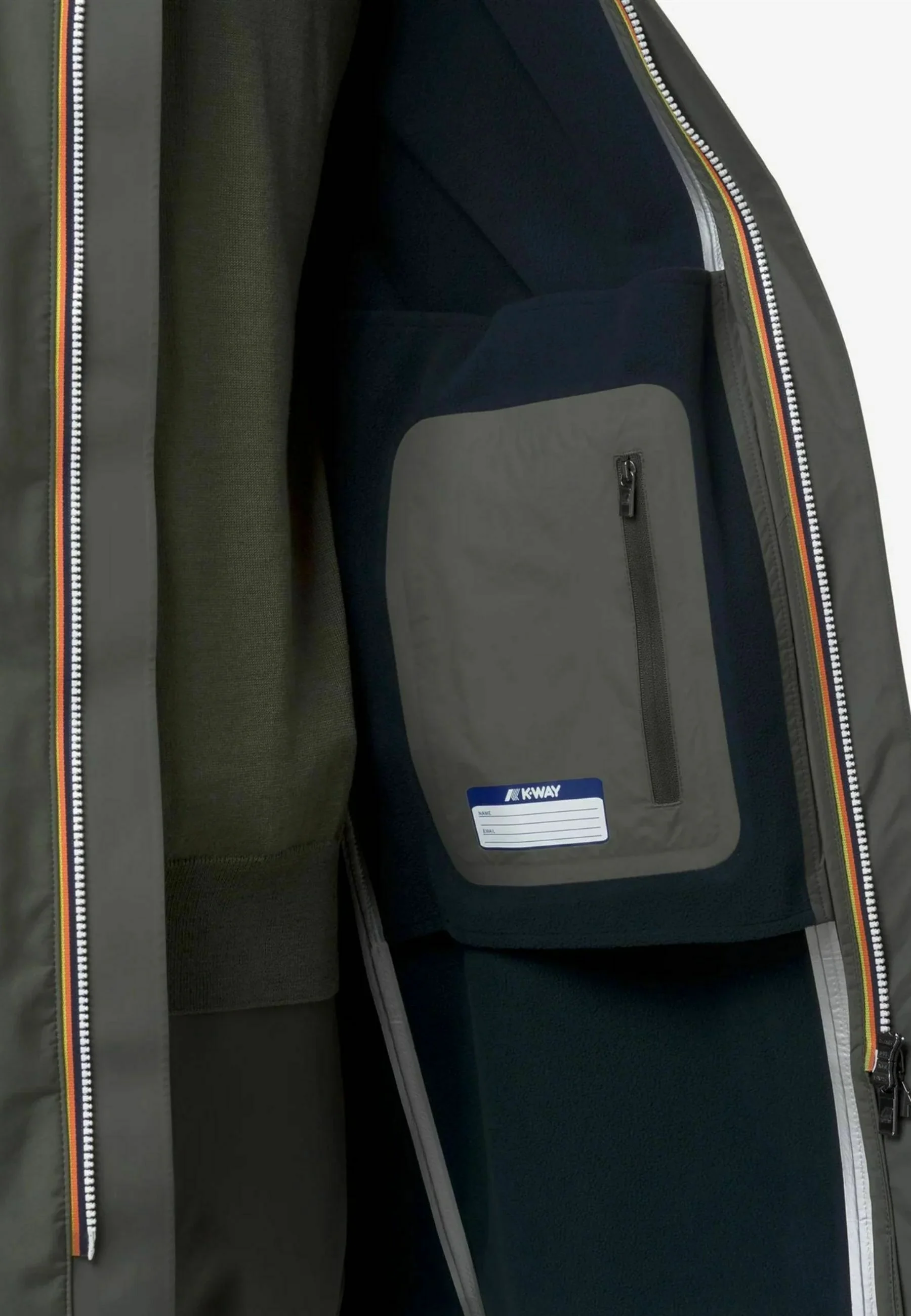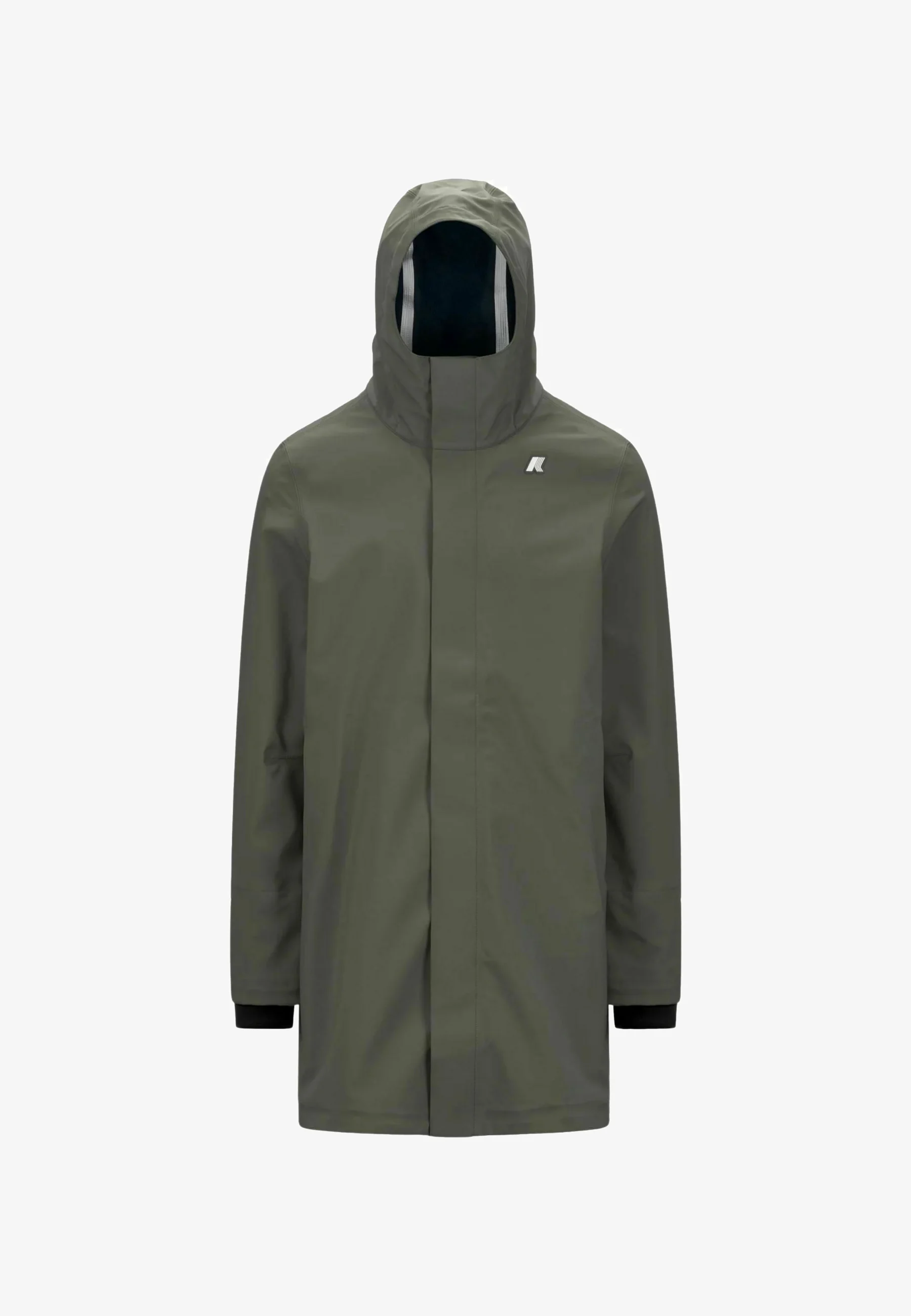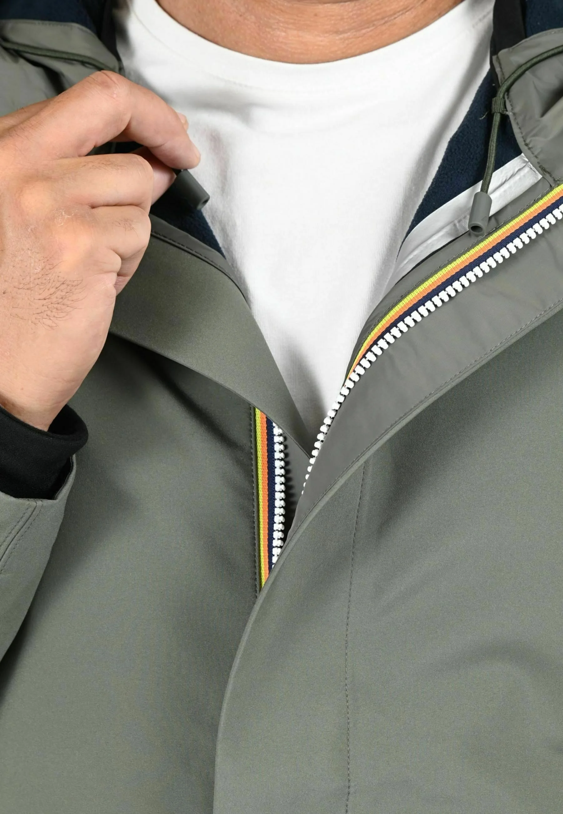 Dotata di cappuccio regolabile con corda elastica, chiusura full-zip, cuciture termonastrate e due tasche laterali con zip, garantisce massima funzionalità e resistenza agli agenti atmosferici. Il logo K-Way in silicone bianco completa il look con un tocco distintivo.