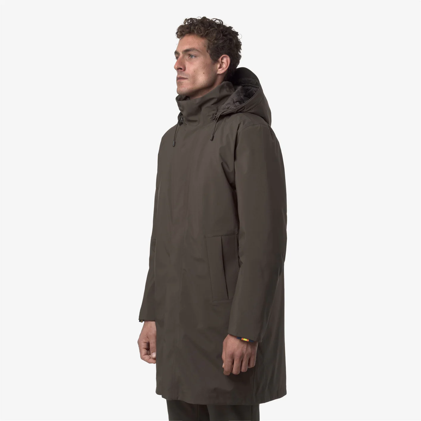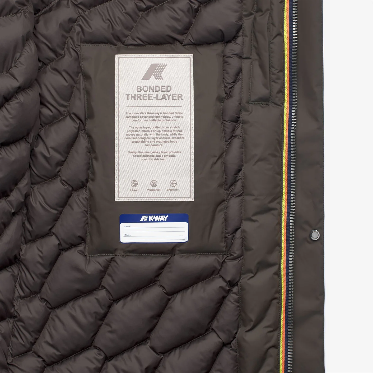 Completano il modello due tasche a filetto, la vestibilità regolare e il dettaglio K-Way tape sul fondo manica, simbolo di autenticità e stile funzionale.