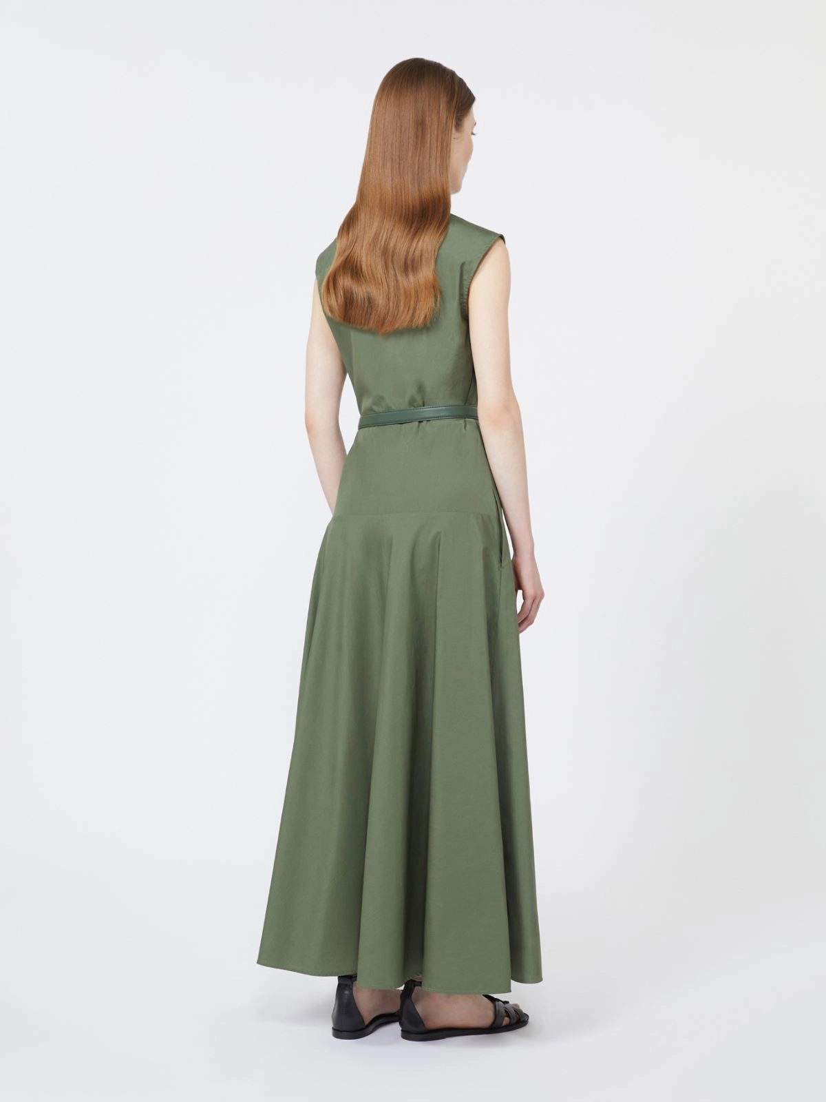 Questo abito a ruota in popeline di cotone verde kaki firmato Max Mara Studio unisce una costruzione femminile fit and flare a dettagli contemporanei come il cut-out sulla schiena e i tagli a bretella sul corpetto. Il popeline di puro cotone 100% garantisce una mano fresca e strutturata, perfetta per sostenere il volume della gonna a ruota senza risultare rigido.
