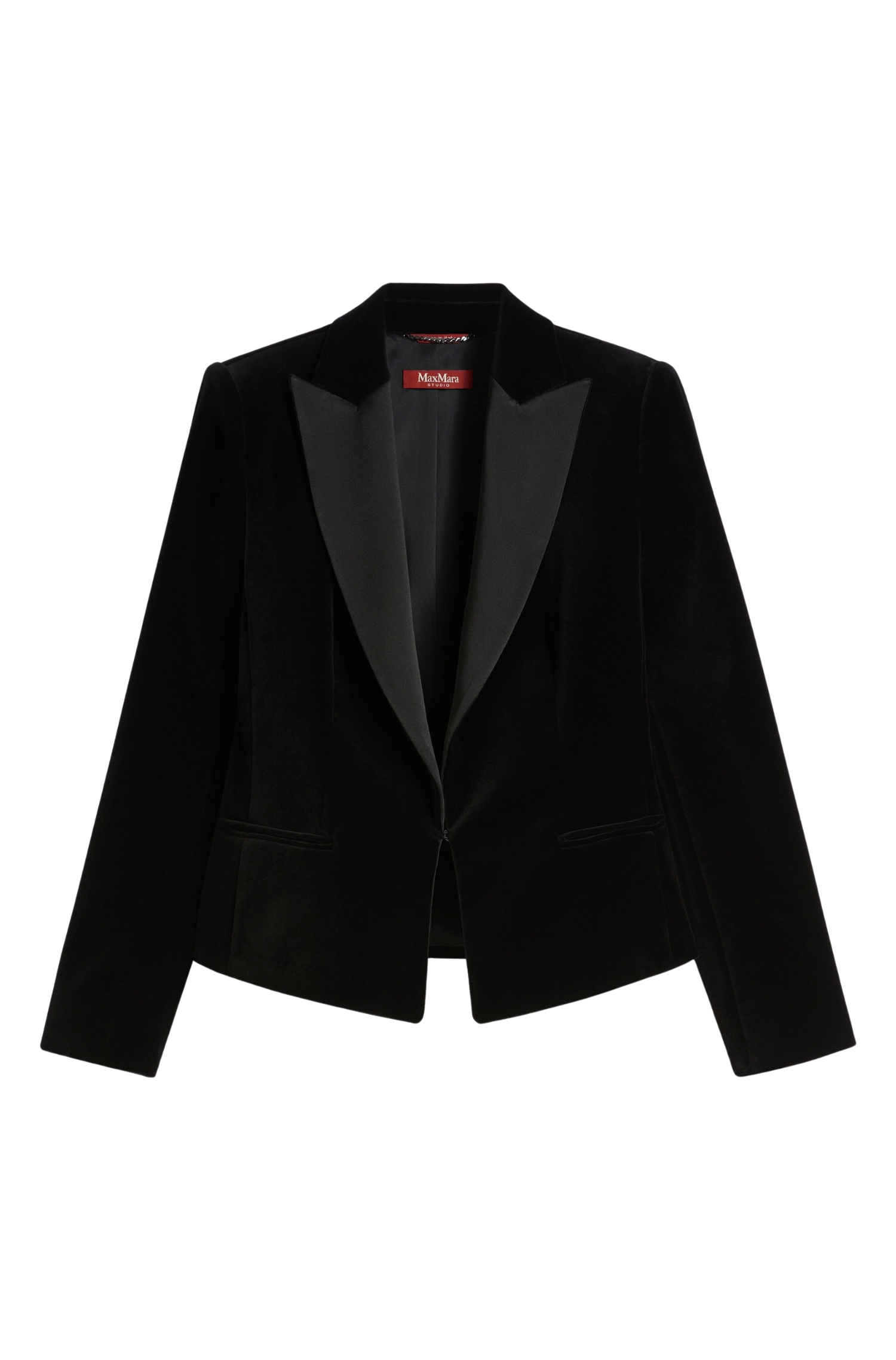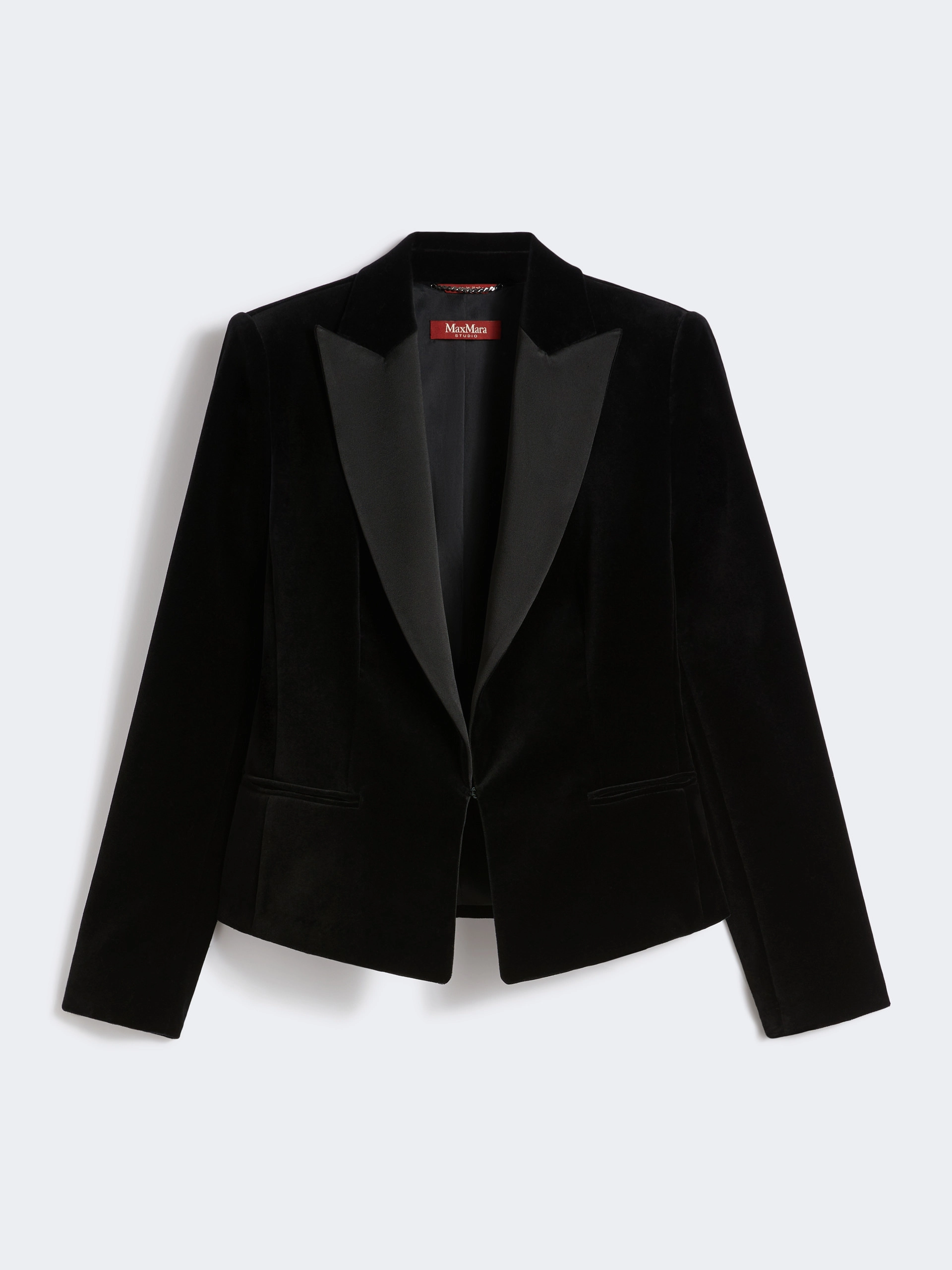 La giacca smoking in velluto nero firmata Max Mara unisce femminilità e sartorialità deccellenza in un capo che reinterpreta con raffinatezza un classico del guardaroba. Il taglio crop e la vestibilità sagomata sottolineano la linea del corpo, mentre la costruzione sartoriale e le rifiniture di pregio garantiscono uneleganza impeccabile.