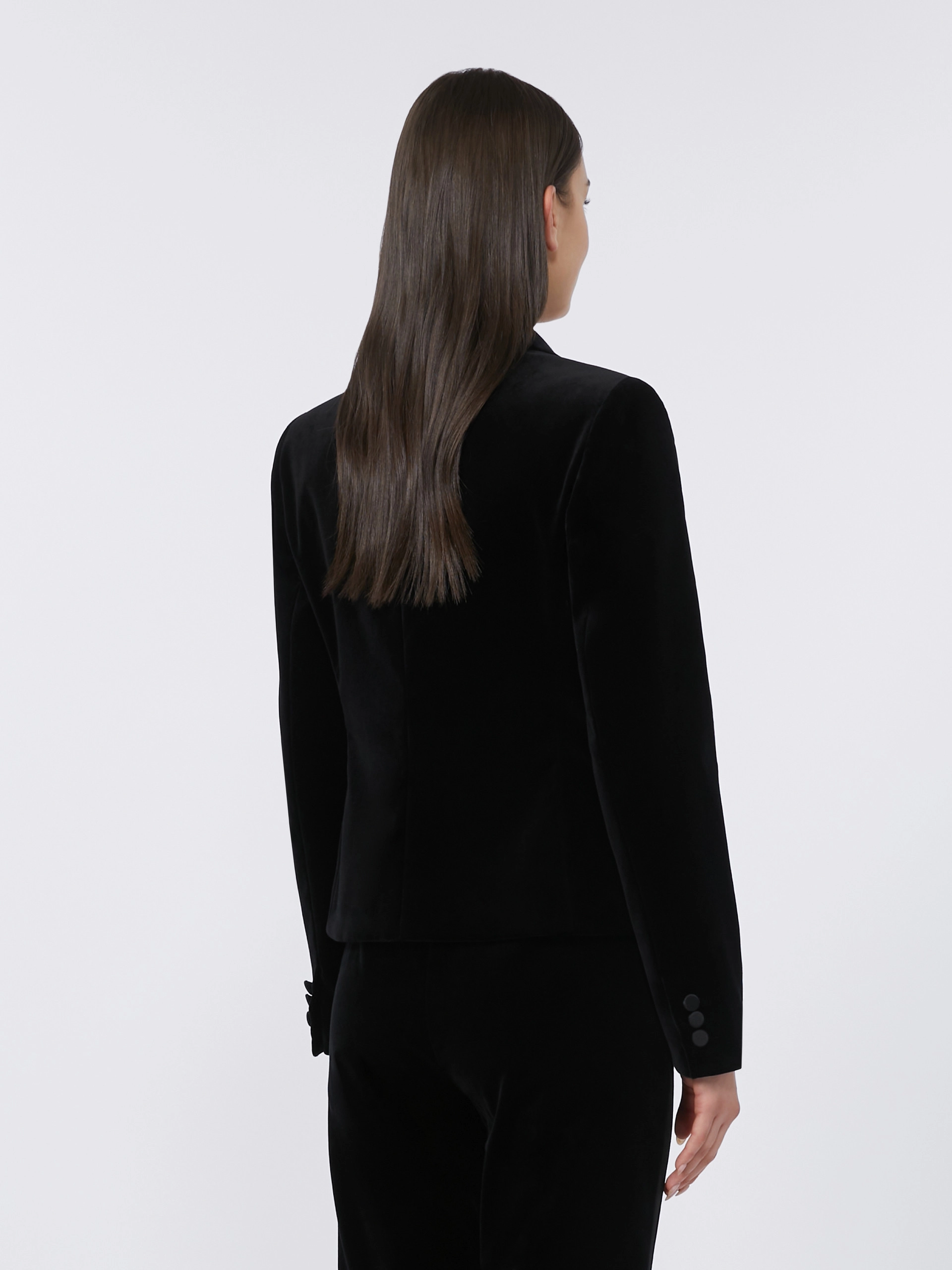 Realizzata in velluto liscio di cotone stretch, questa giacca offre un comfort eccezionale e un aspetto lussuoso. Il collo rever a lancia in enver satin introduce un contrasto sofisticato di texture, mentre i bottoni ricoperti sul fondo manica e le tasche a filetto orizzontale completano il design con dettagli di alta moda.