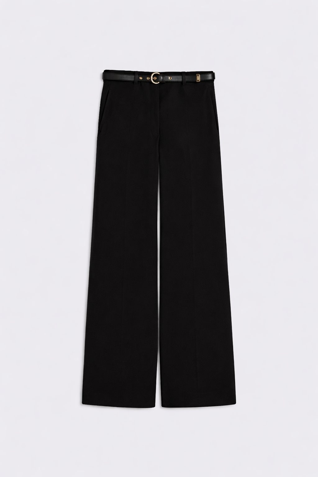 La gamba larga, solo leggermente chiusa al fondo, crea un volume contemporaneo che slancia la figura e si presta ad abbinamenti con sneakers, mocassini o sandali a tacco. La chiusura con zip coperta e bottone a chiodo, i passanti in vita, i rivetti in metallo sulle tasche e la label in cuoio sul retro richiamano il linguaggio dei jeans tradizionali, reinterpretato in chiave più sofisticata.