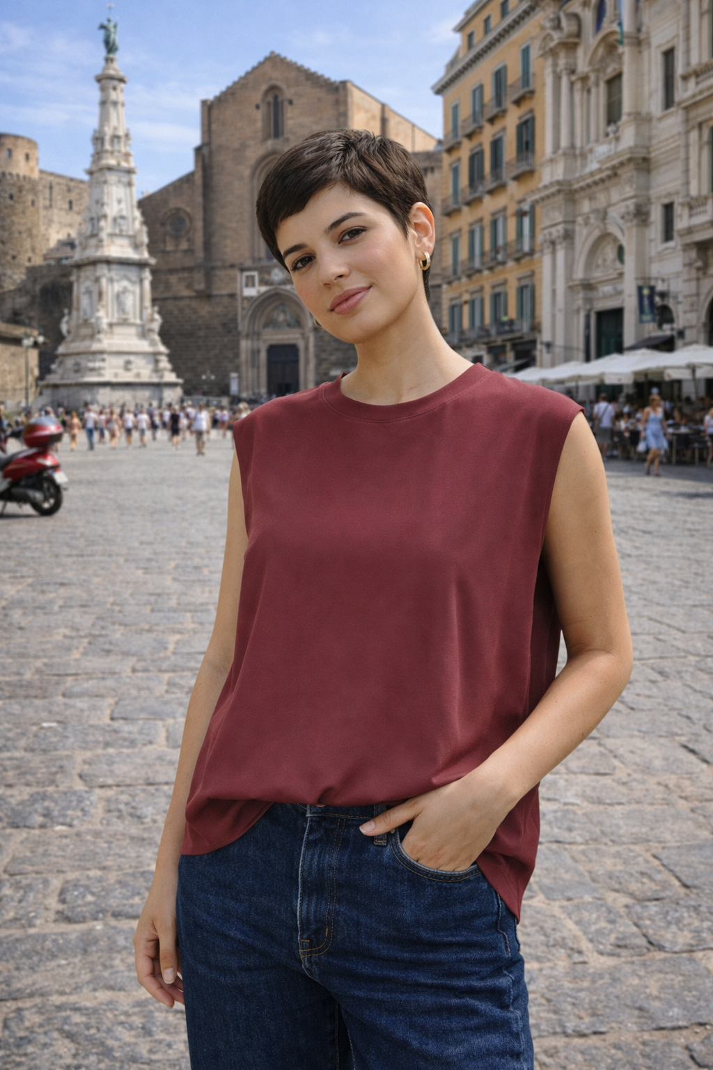 Il design smanicato con scollo a barca valorizza spalle e décolleté con una linea orizzontale elegante e femminile che slancia visivamente la parte superiore del corpo. Lo scollo a barca, ampio e pulito, incornicia la zona delle clavicole con discrezione e sofisticazione, rendendolo perfetto sia per look casual che più eleganti.