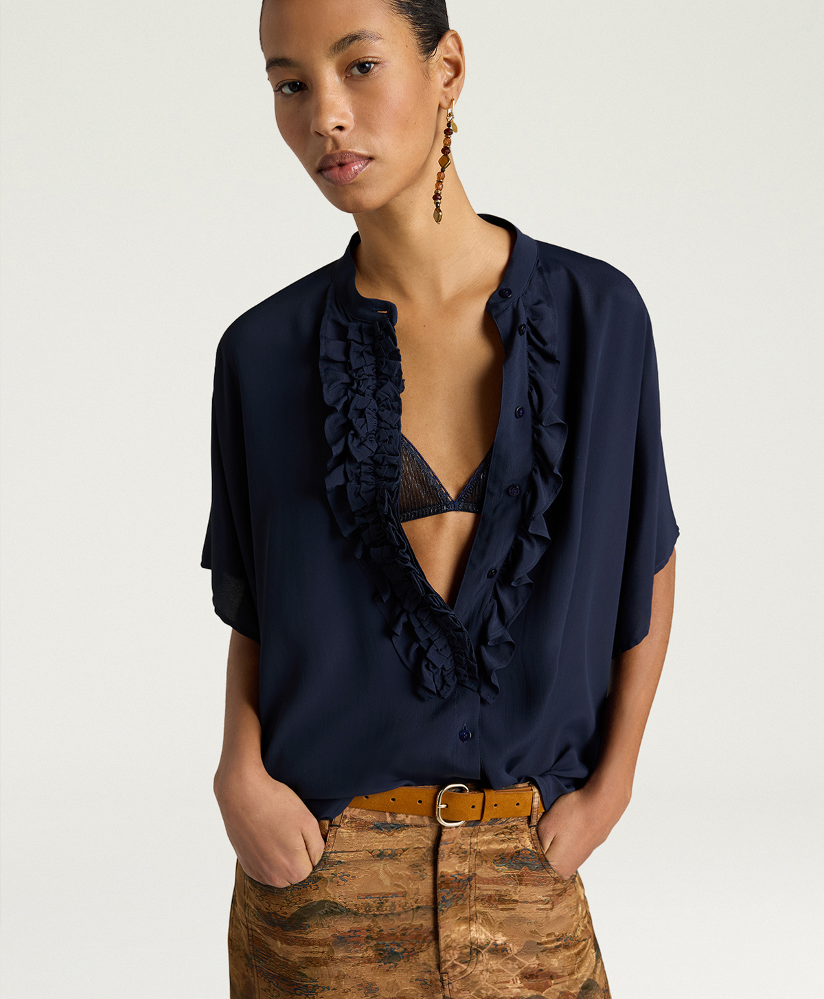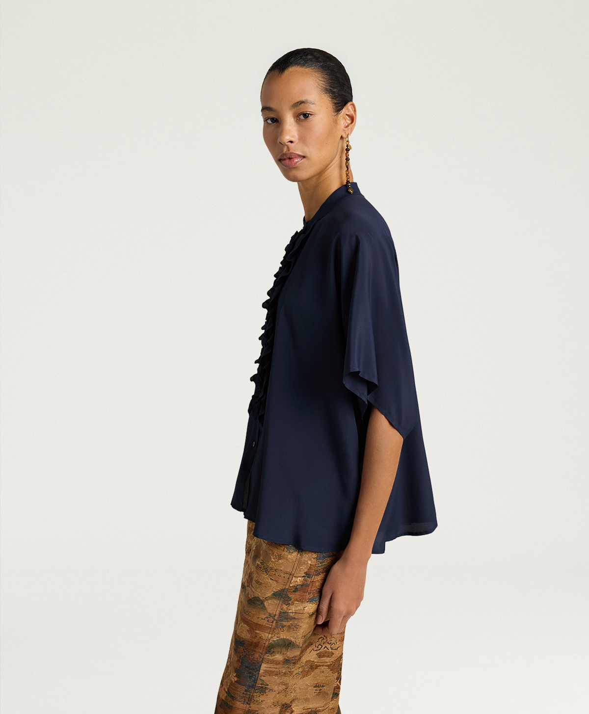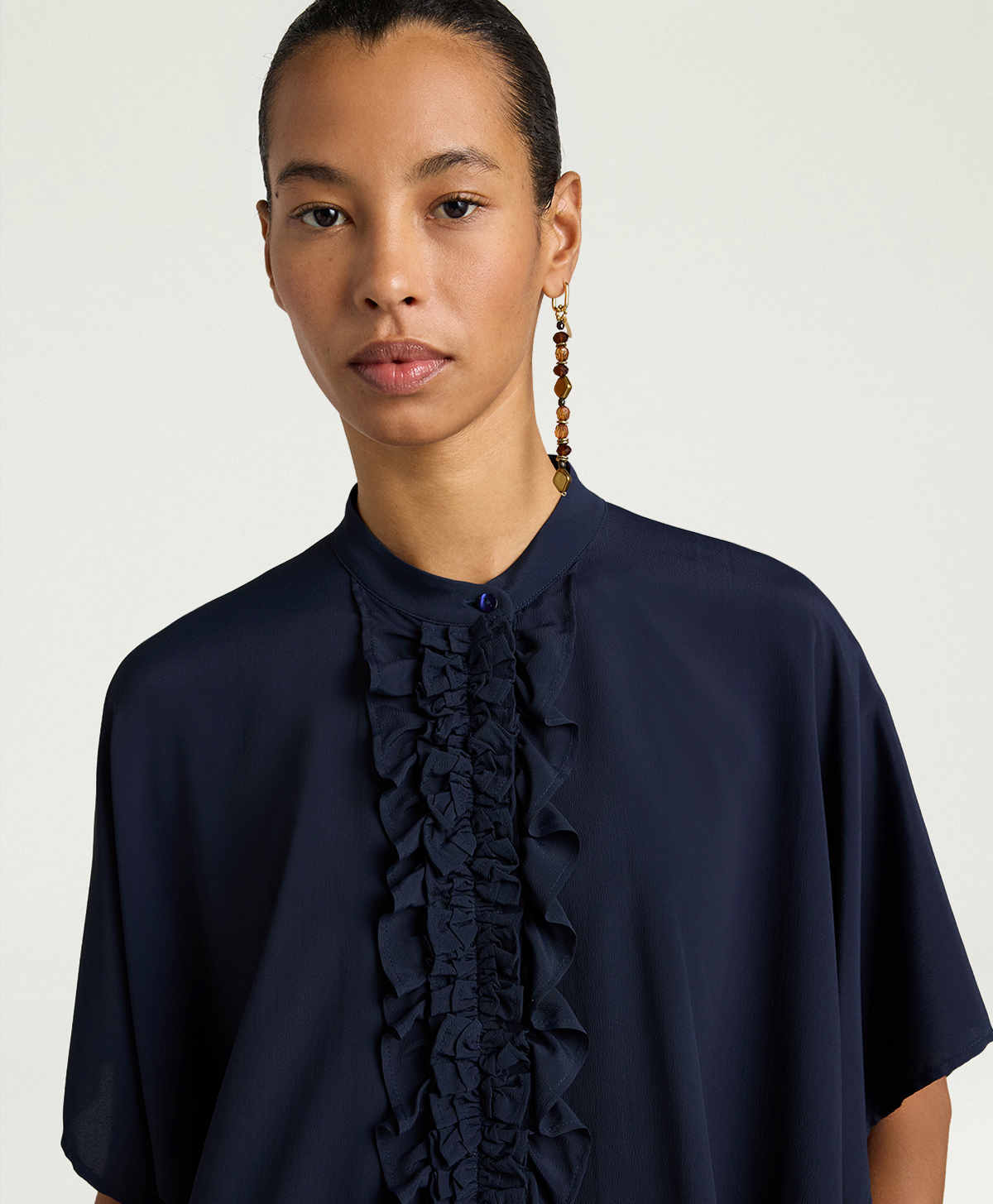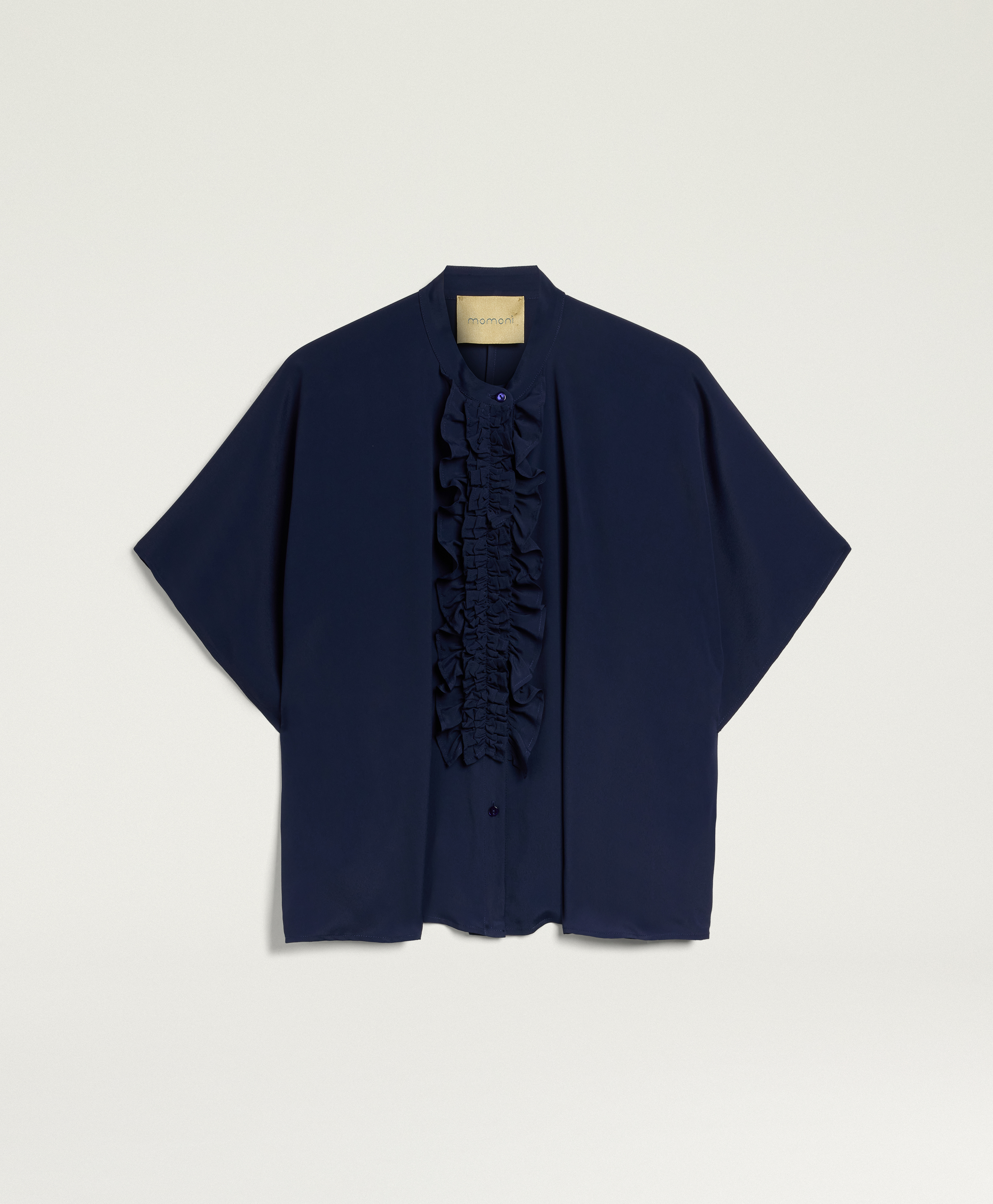Labbottonatura a vista è interamente incorniciata da ricche rouches, dettaglio che aggiunge volume e movimento al davanti e rende la camicia protagonista anche abbinata a pantaloni essenziali. Il colletto alla coreana completa il design con una nota pulita e contemporanea, perfetta sia portata chiusa sia leggermente aperta.