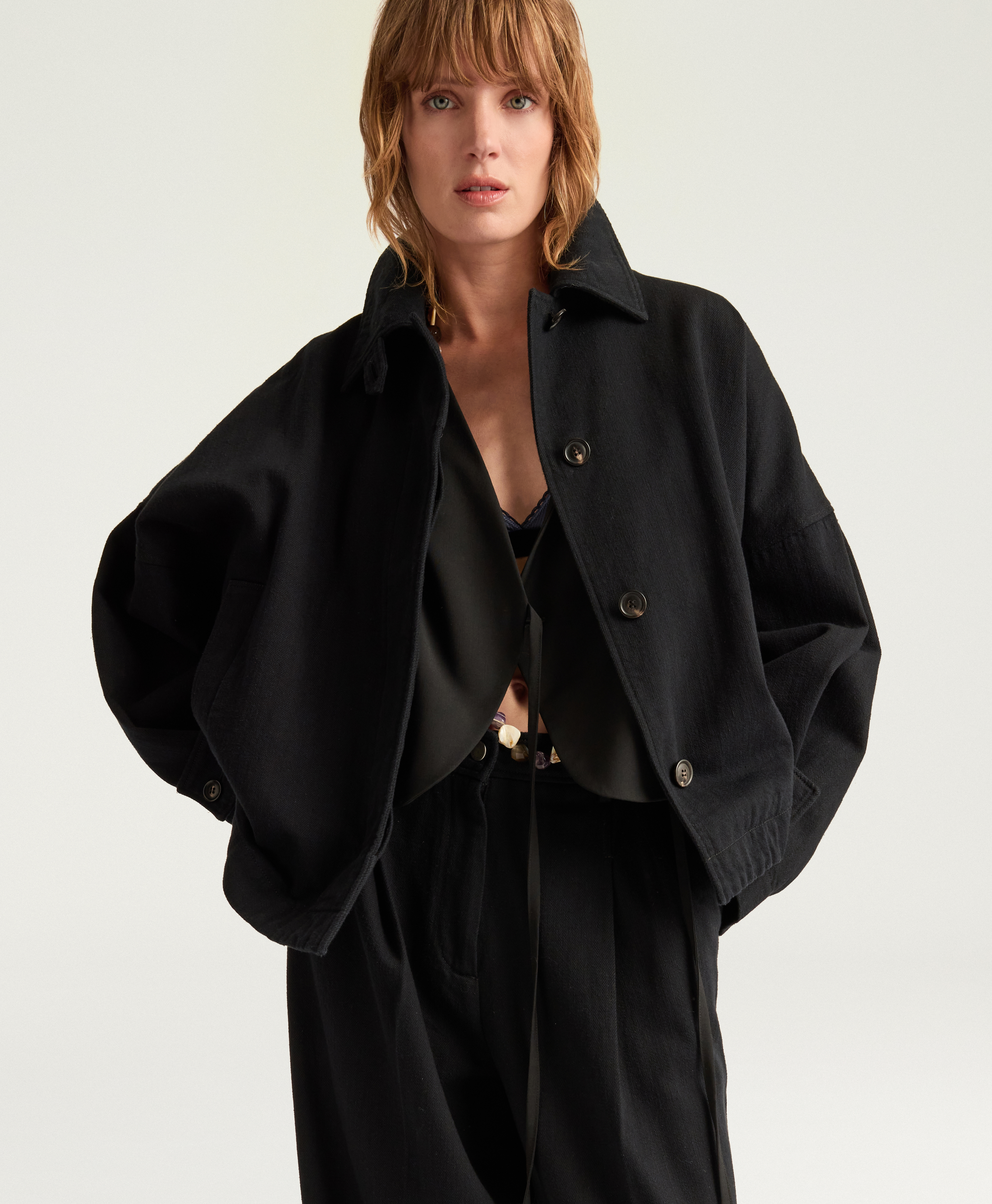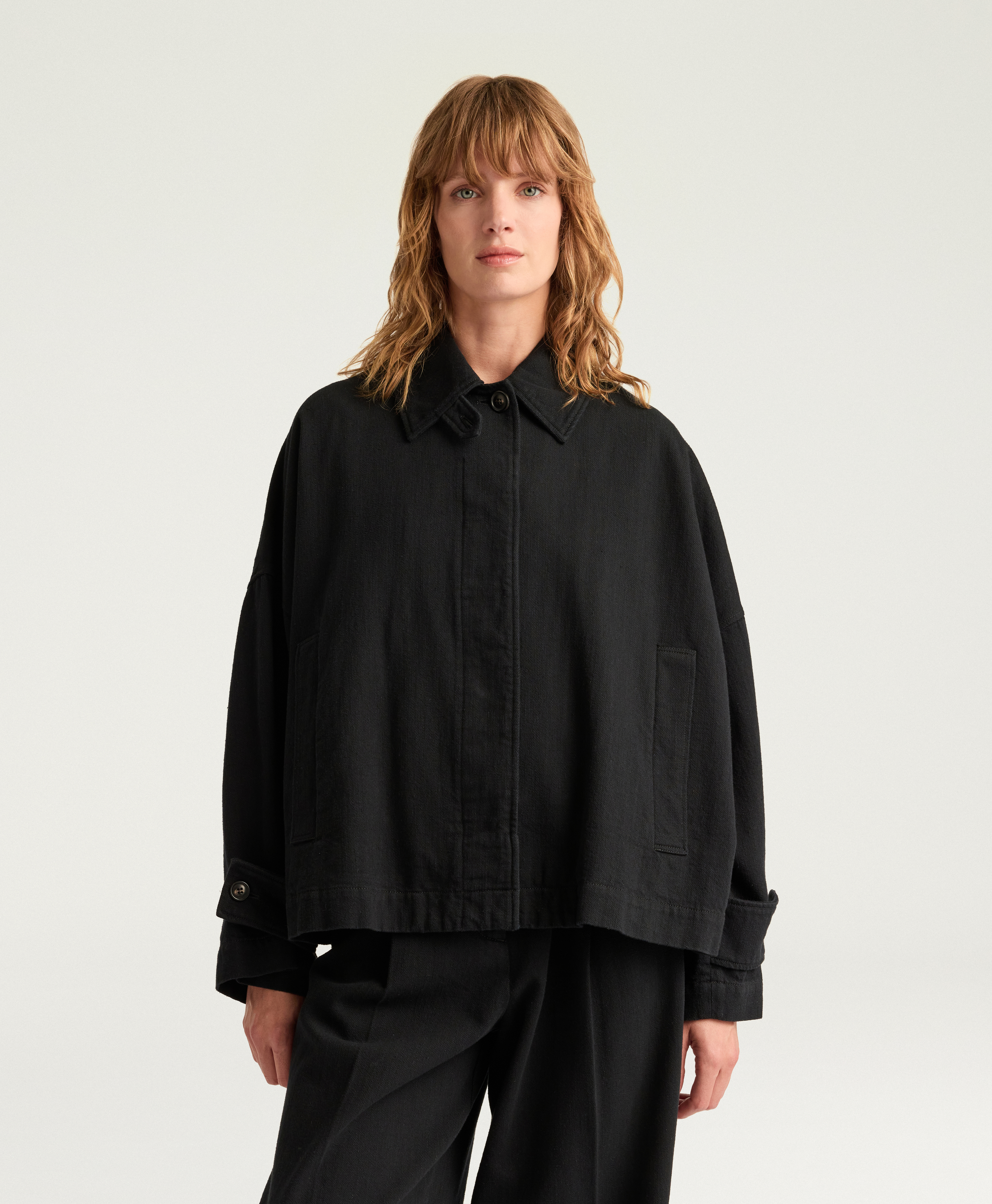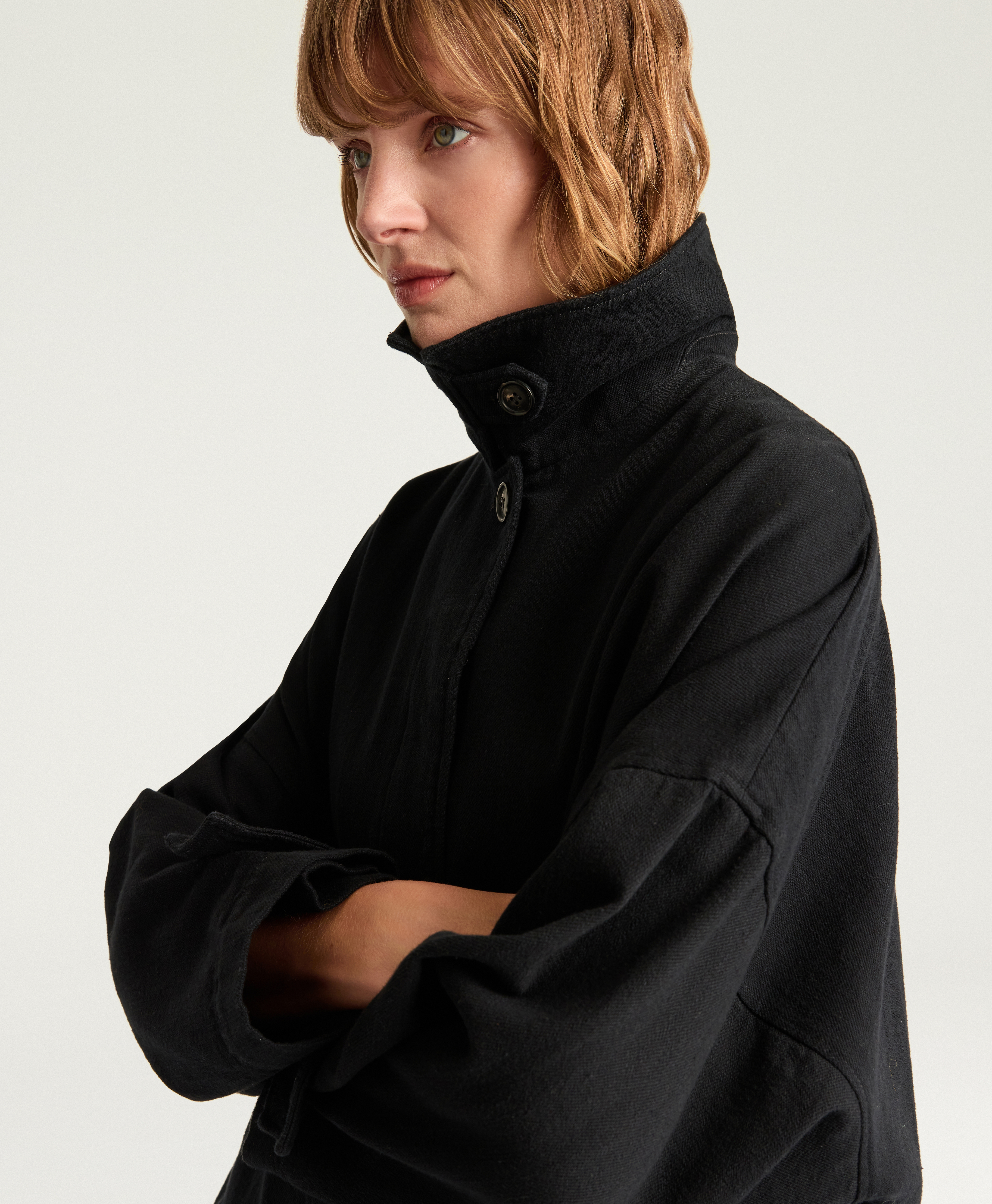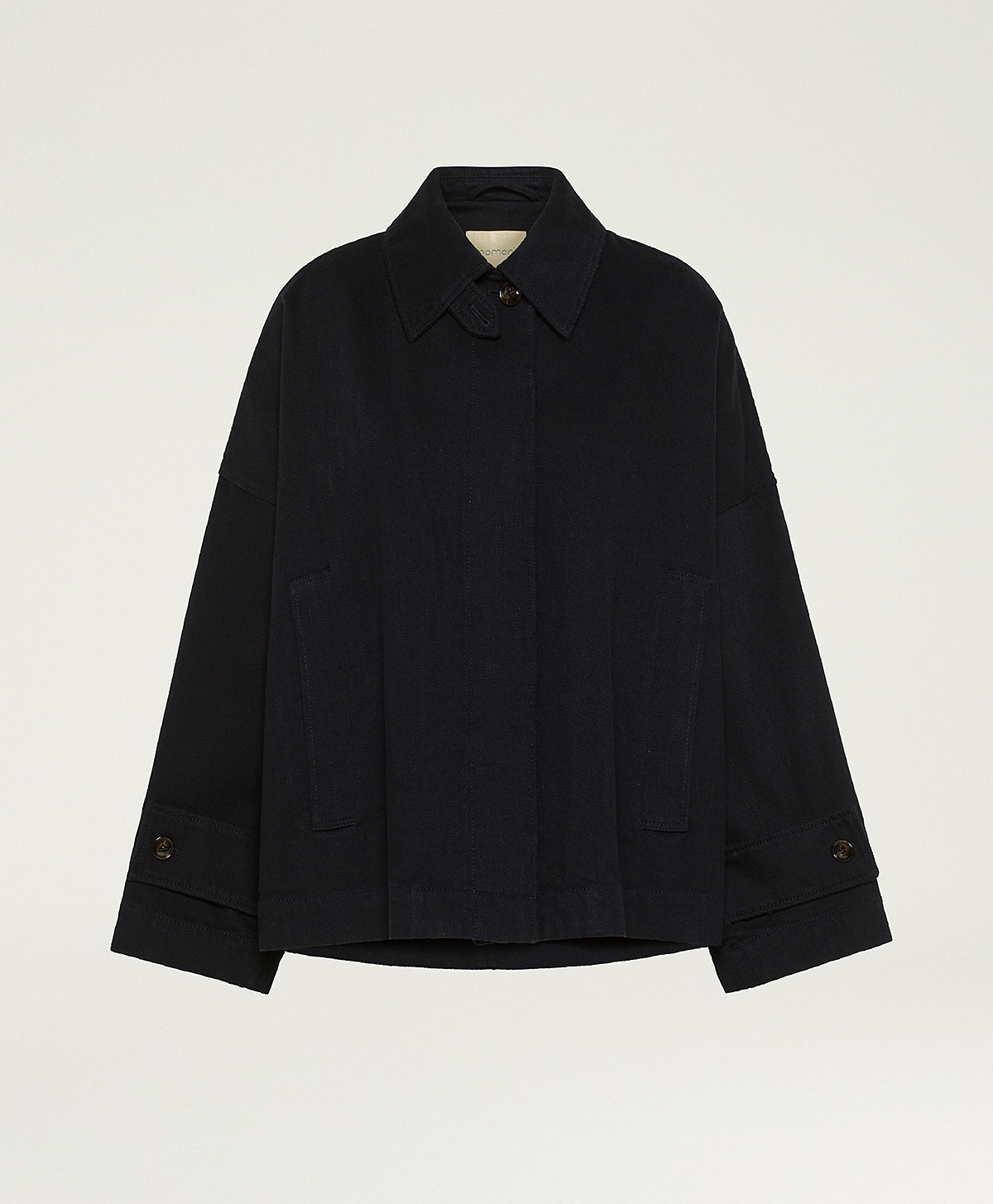 Cappotto Henry in Denim Tinto Filo Nero, Caban Over in Cotone con Dettagli Raincoat Momonì