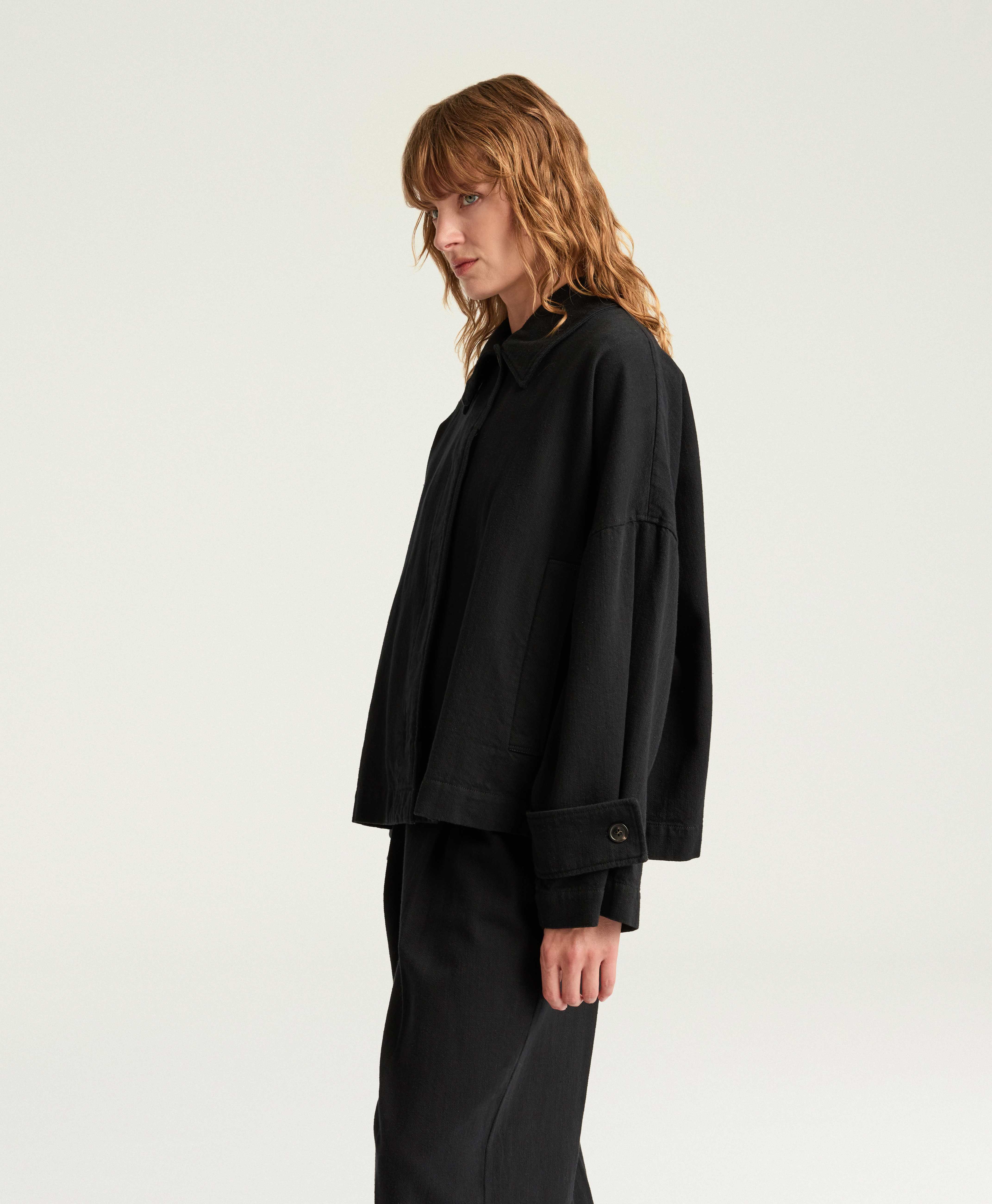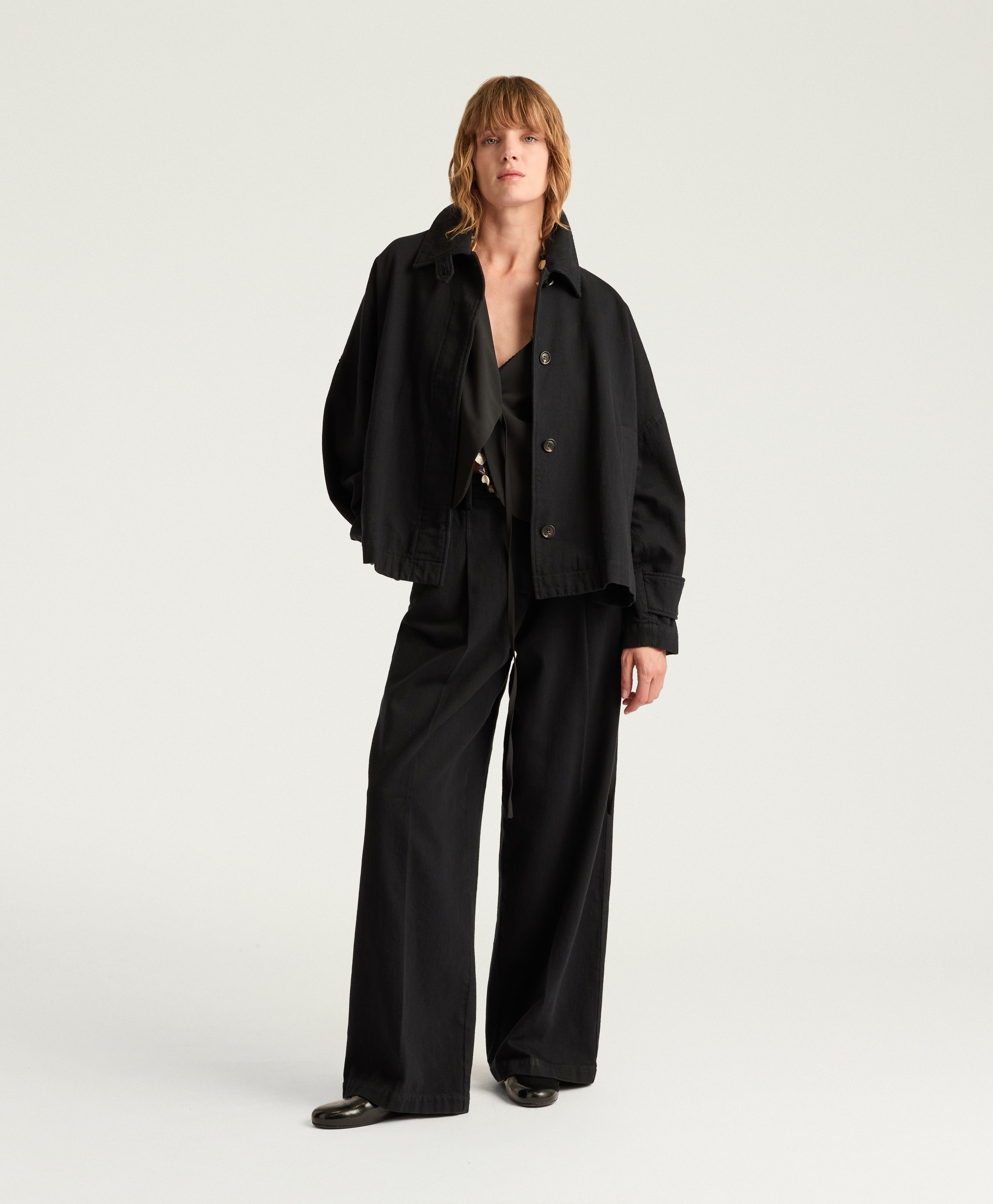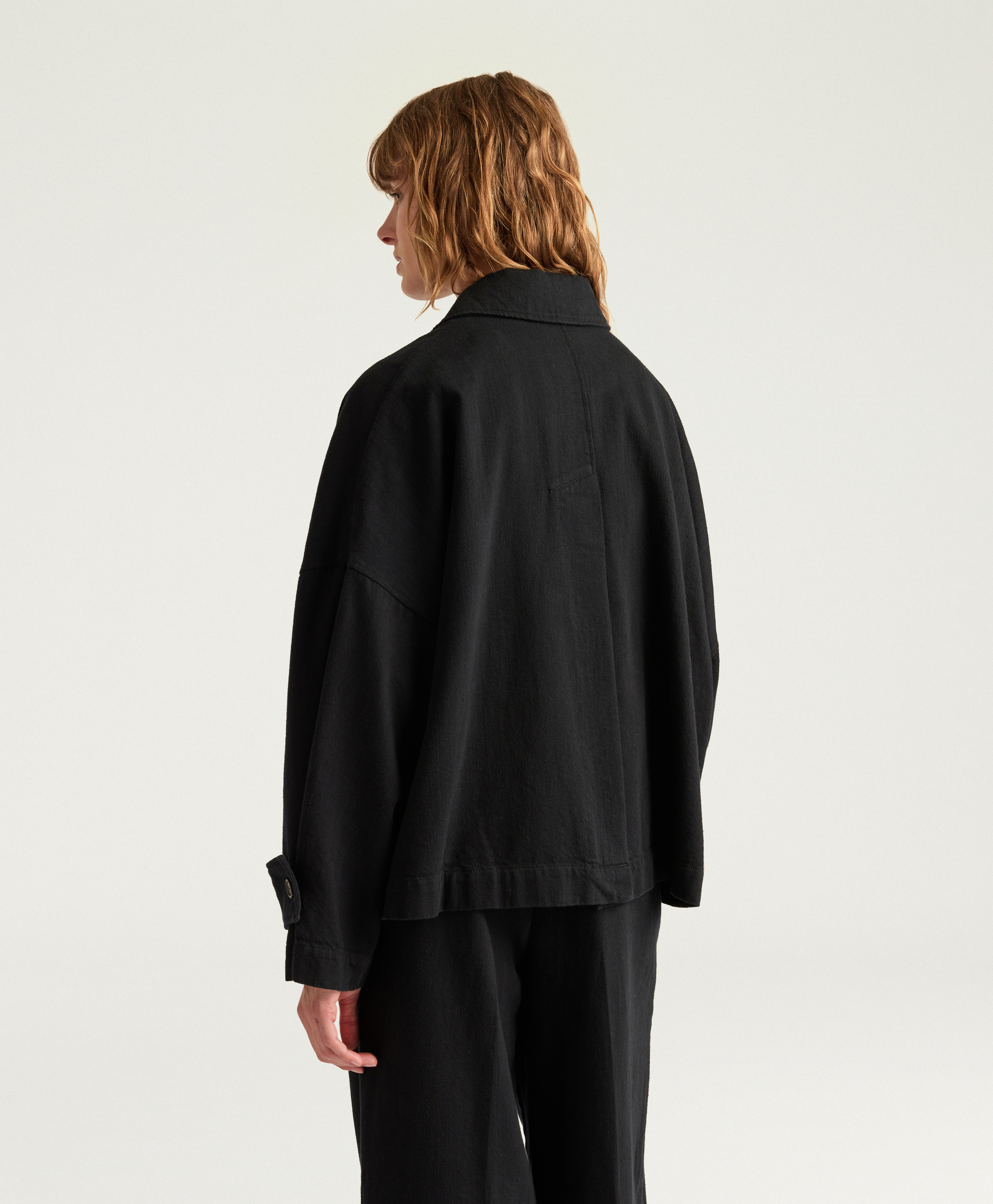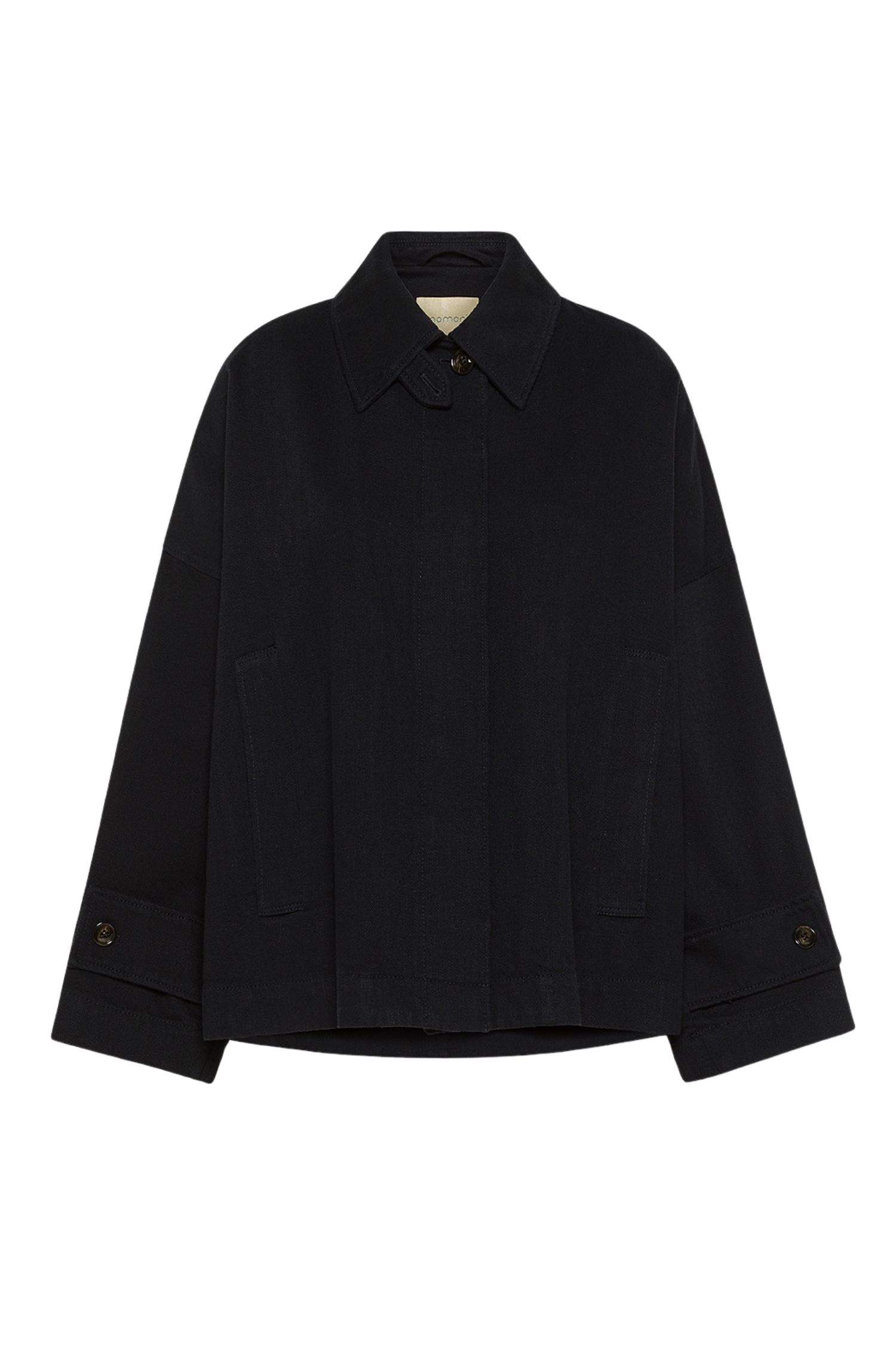 Cappotto Henry in Denim Tinto Filo Nero, Caban Over in Cotone con Dettagli Raincoat Momonì