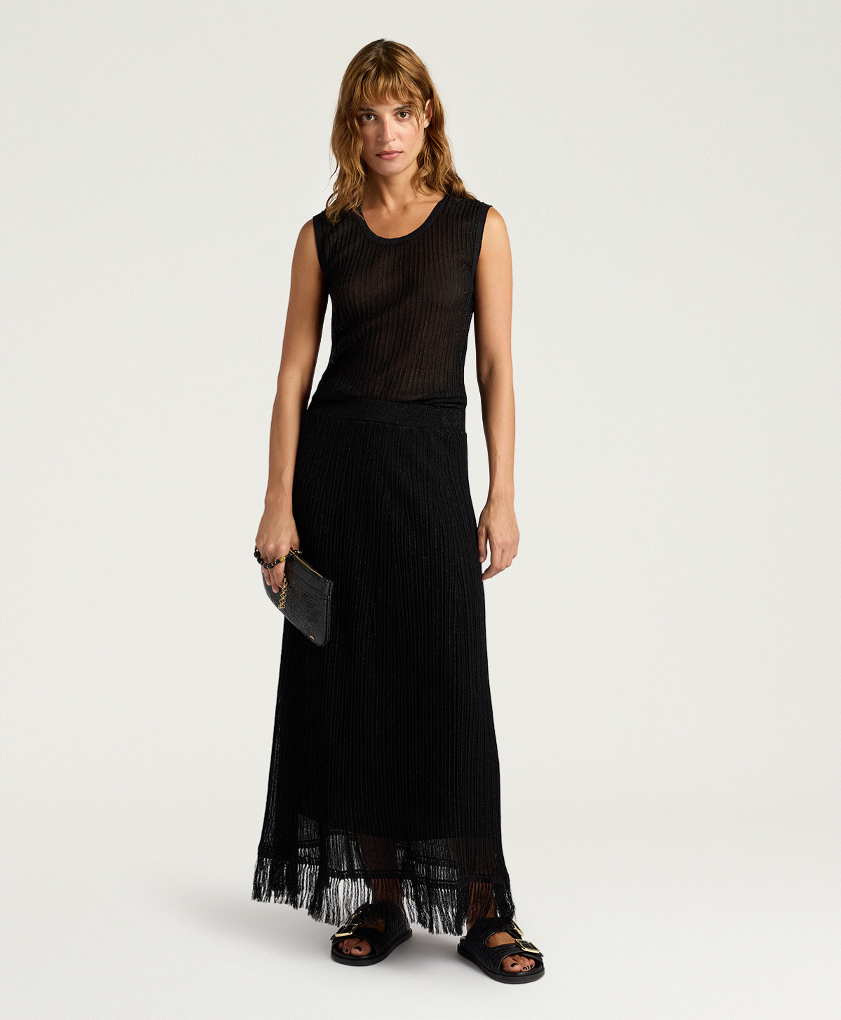 Layering: completa set coordinati con maglia Miraflores o canotta Takoda della stessa linea lurex per total look sofisticato.
