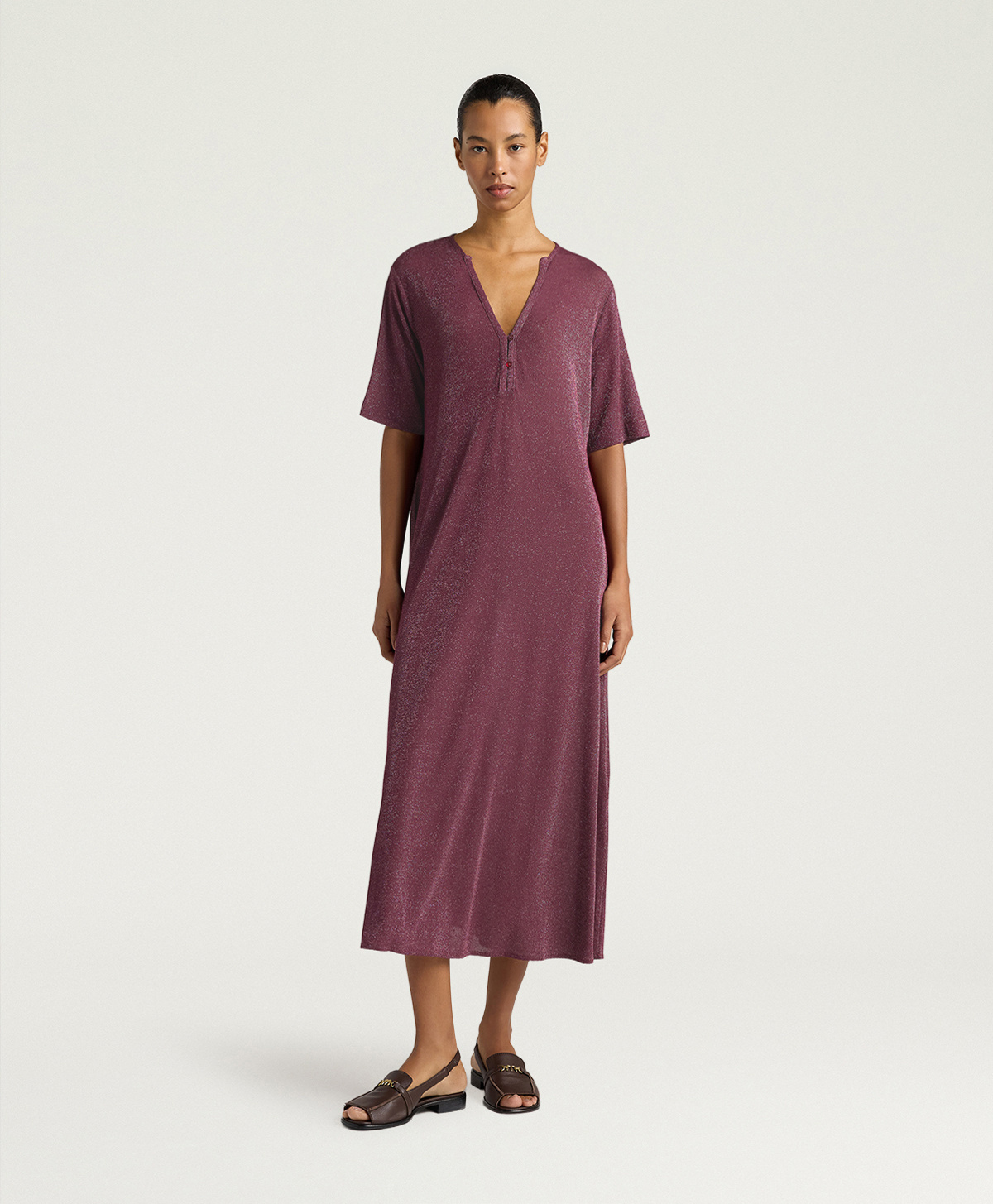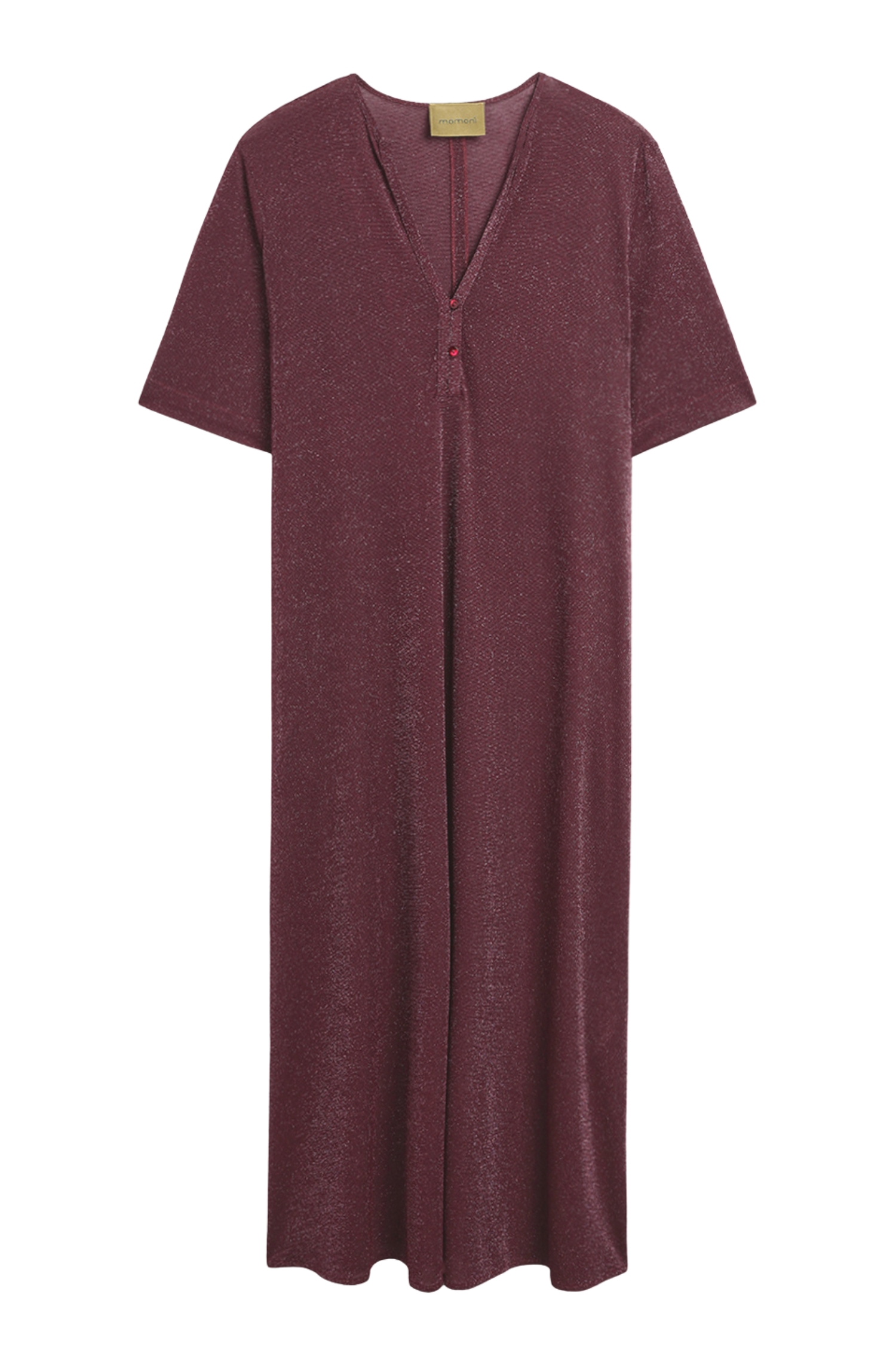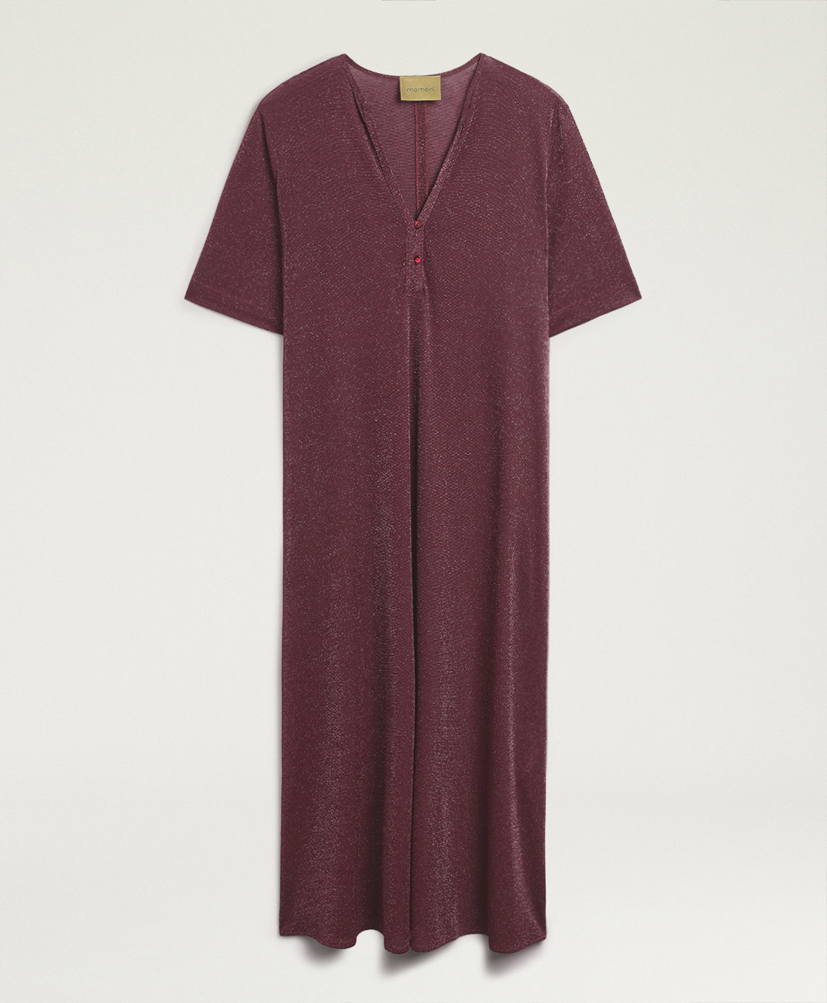 Labito Penelope in lurex di Momonì è un modello a tunica lunga pensato per una femminilità discreta ma luminosa, grazie al jersey in lurex che dona al capo una brillantezza sottile e una mano morbida ed elasticizzata. La vestibilità regolare e la lunghezza alla caviglia lo rendono ideale sia con sandali bassi sia con tacchi, a seconda delloccasione.