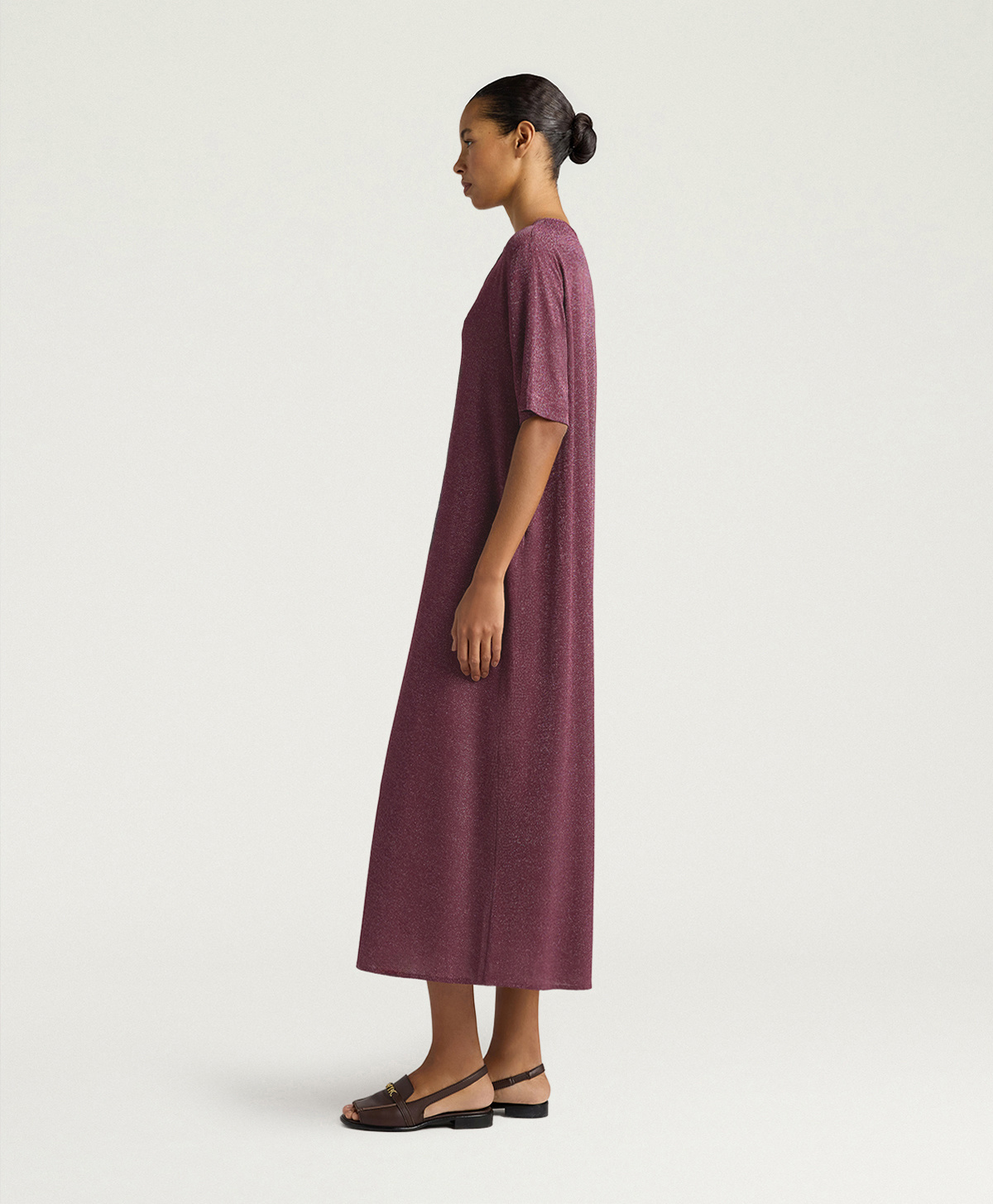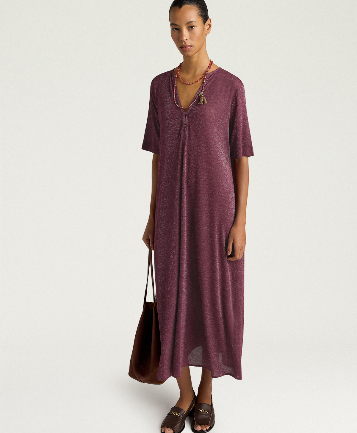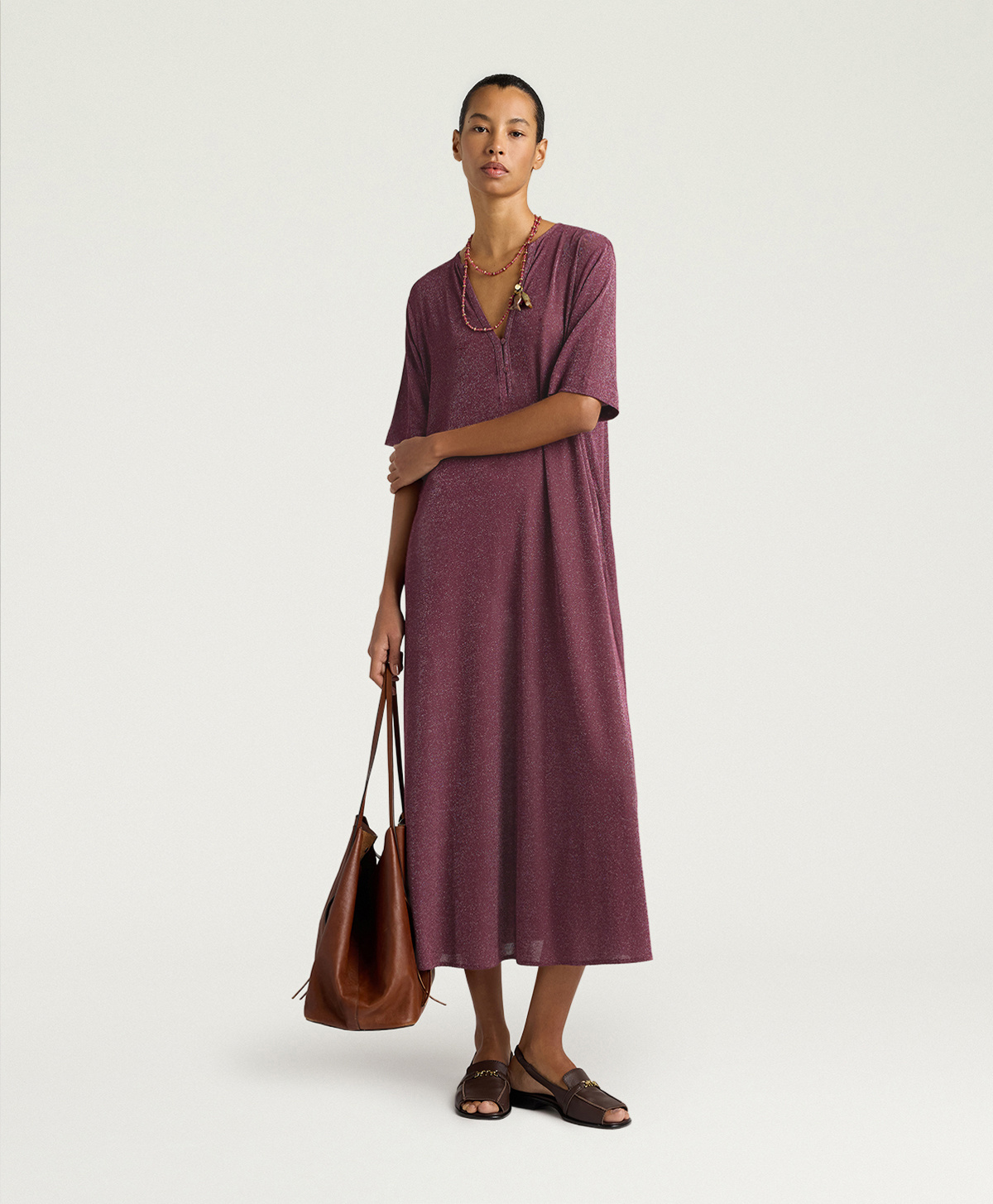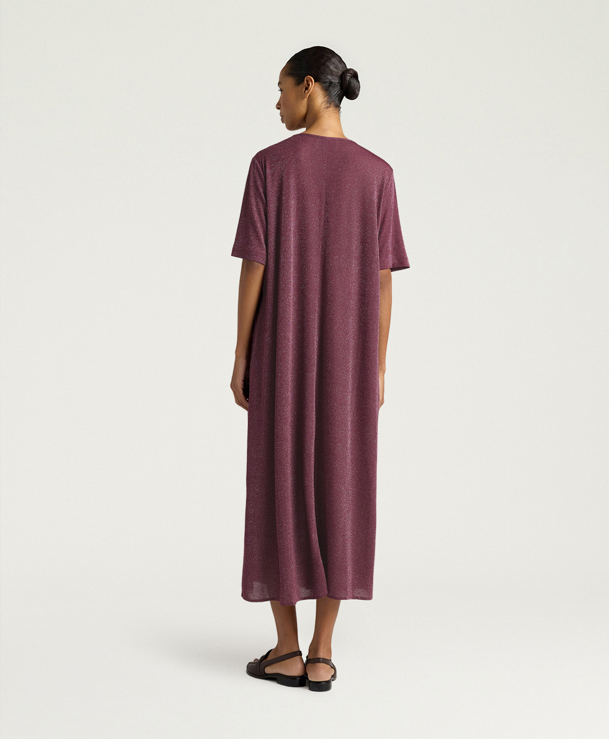 Labito Penelope in lurex di Momonì è un modello a tunica lunga pensato per una femminilità discreta ma luminosa, grazie al jersey in lurex che dona al capo una brillantezza sottile e una mano morbida ed elasticizzata. La vestibilità regolare e la lunghezza alla caviglia lo rendono ideale sia con sandali bassi sia con tacchi, a seconda delloccasione.