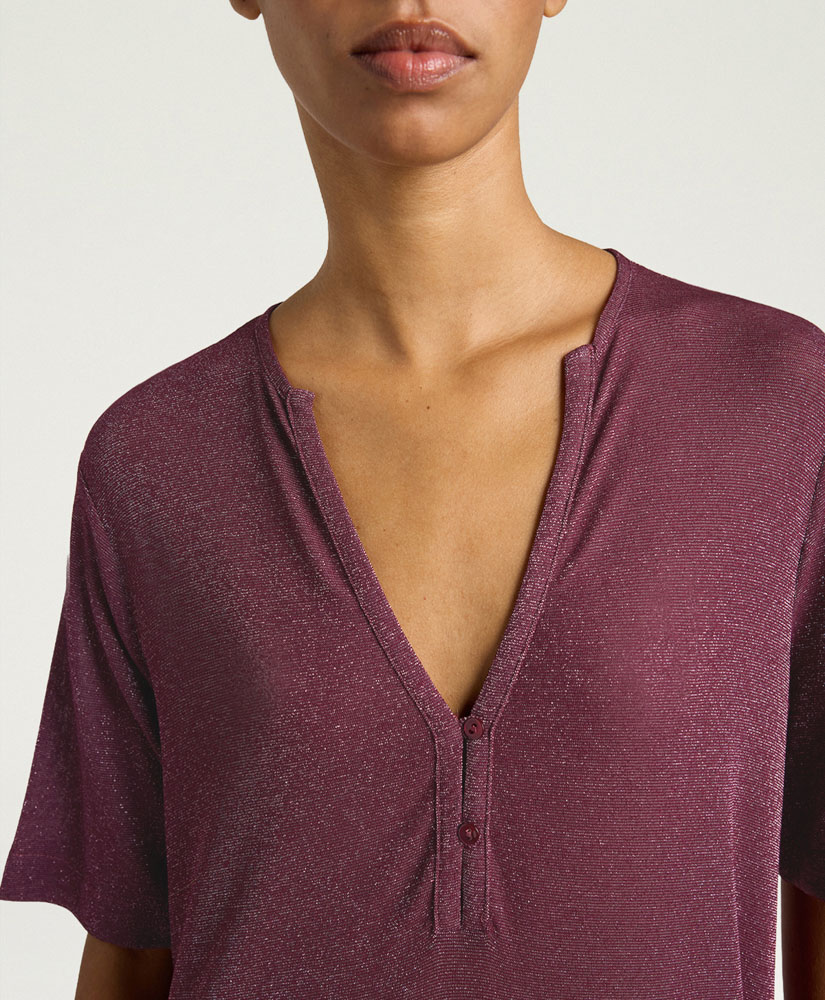Le maniche corte bilanciano il volume del modello e lo rendono facile da indossare da solo o sotto capispalla leggeri. Lo scollo a V è rifinito da una sottile lista fermata da due piccoli bottoni in madreperla, dettaglio prezioso che aggiunge un tocco sofisticato al design essenziale.